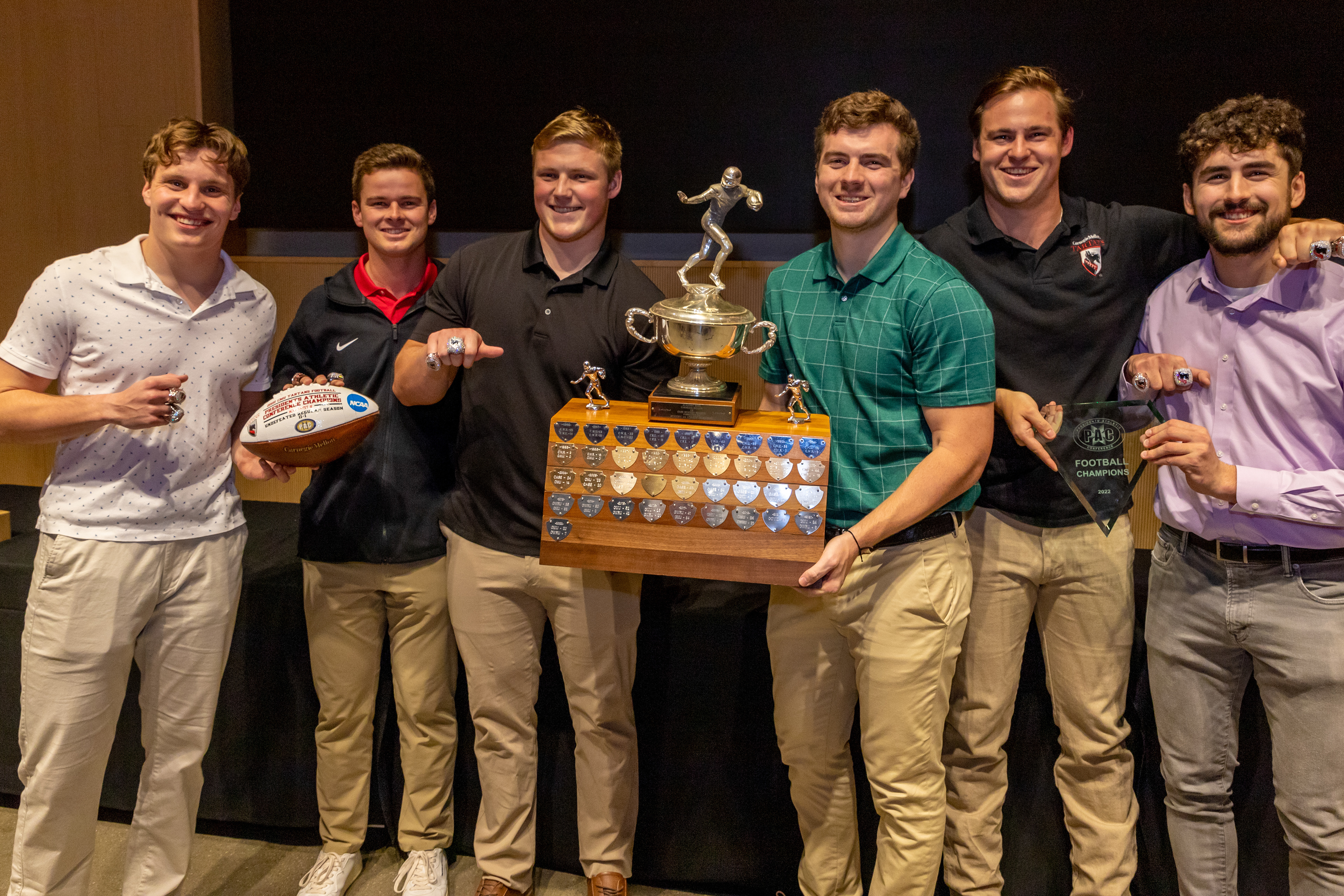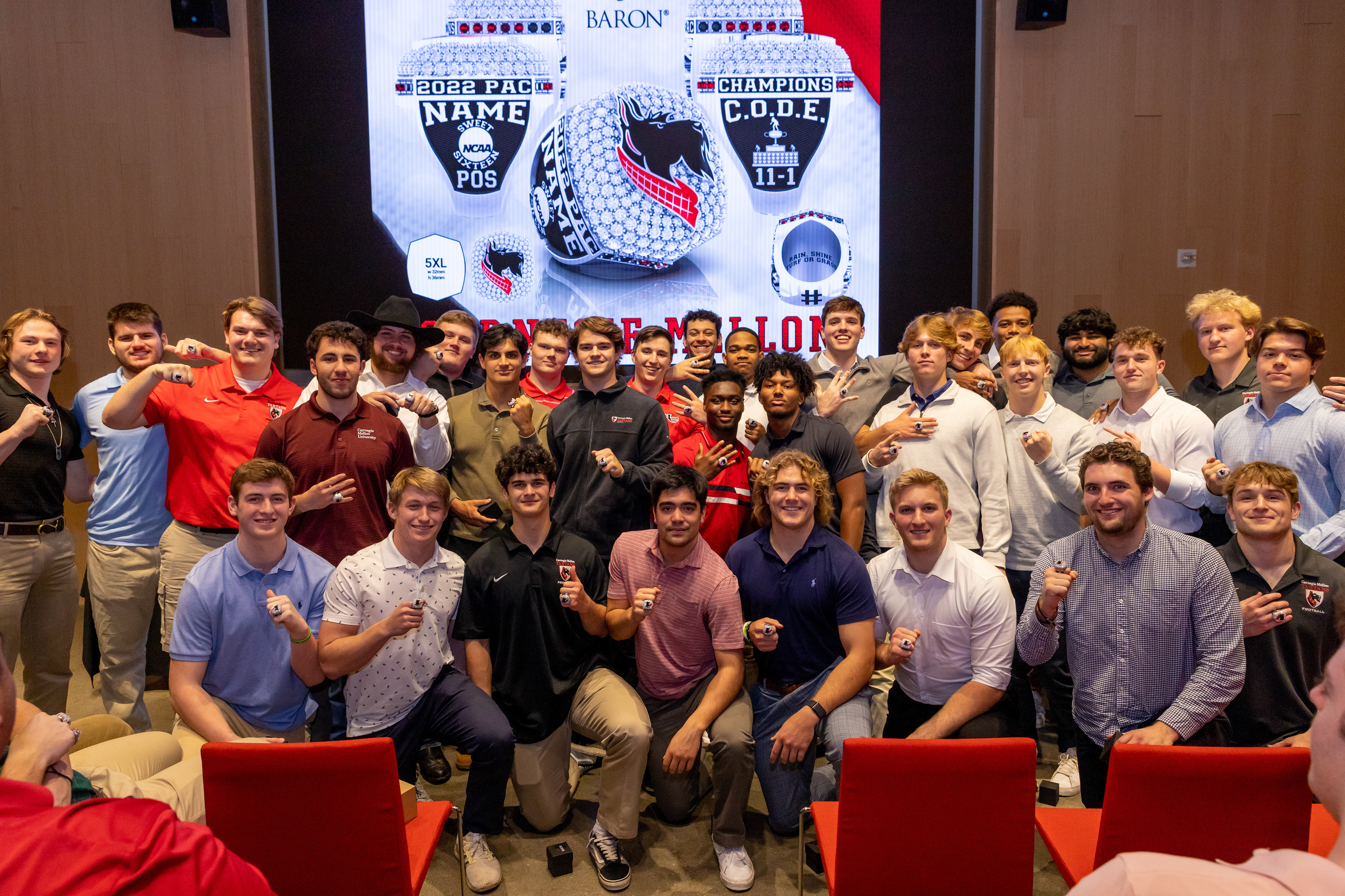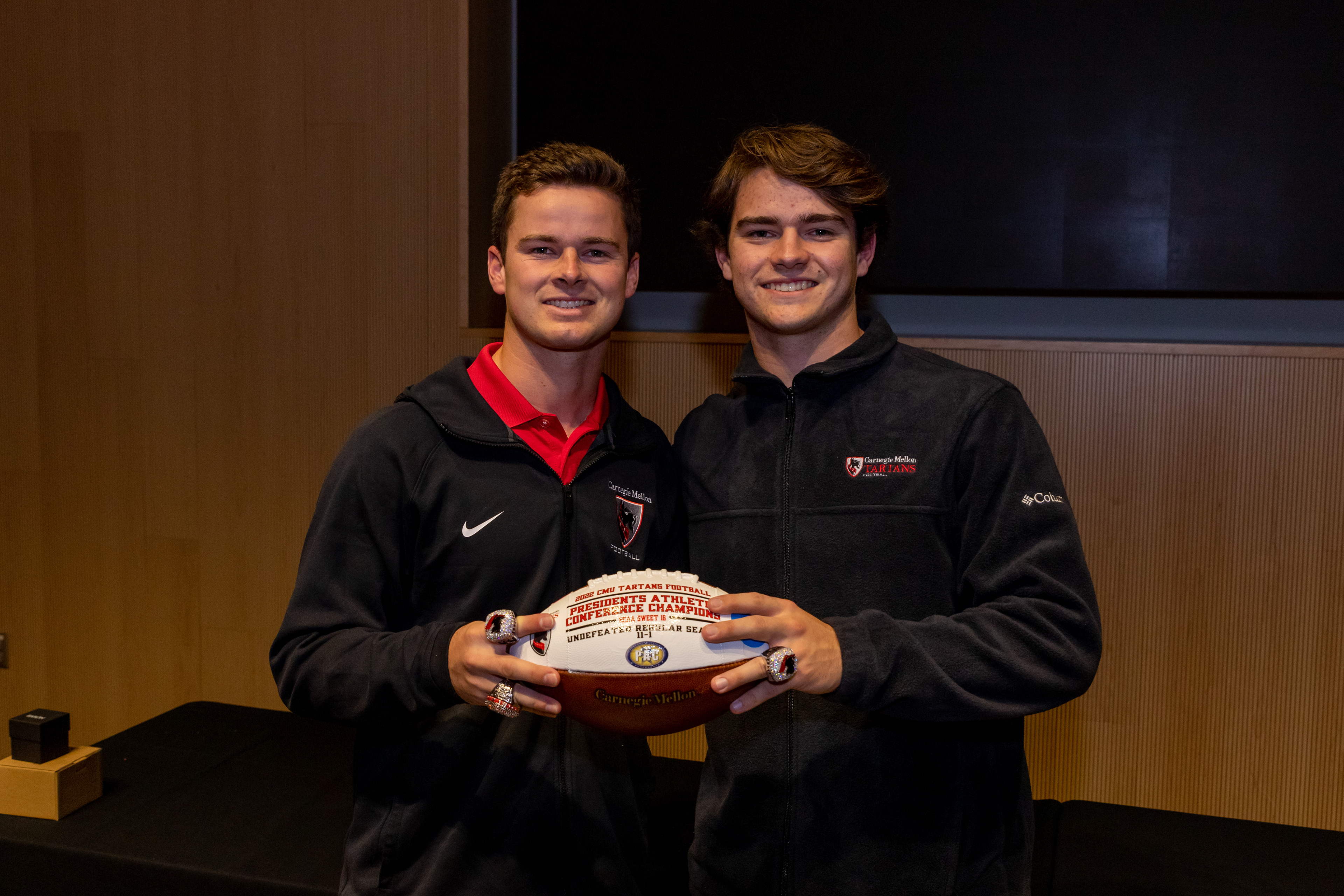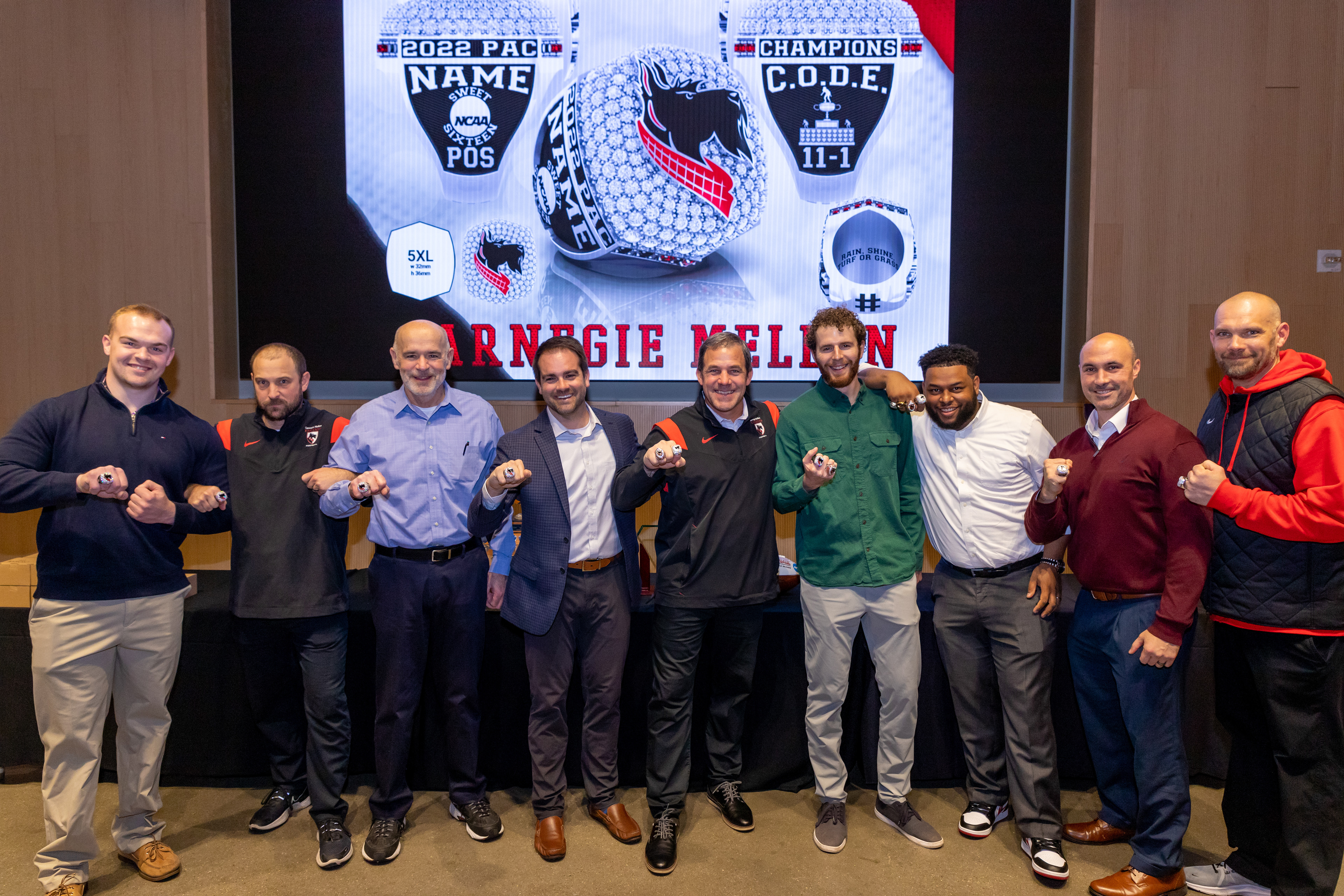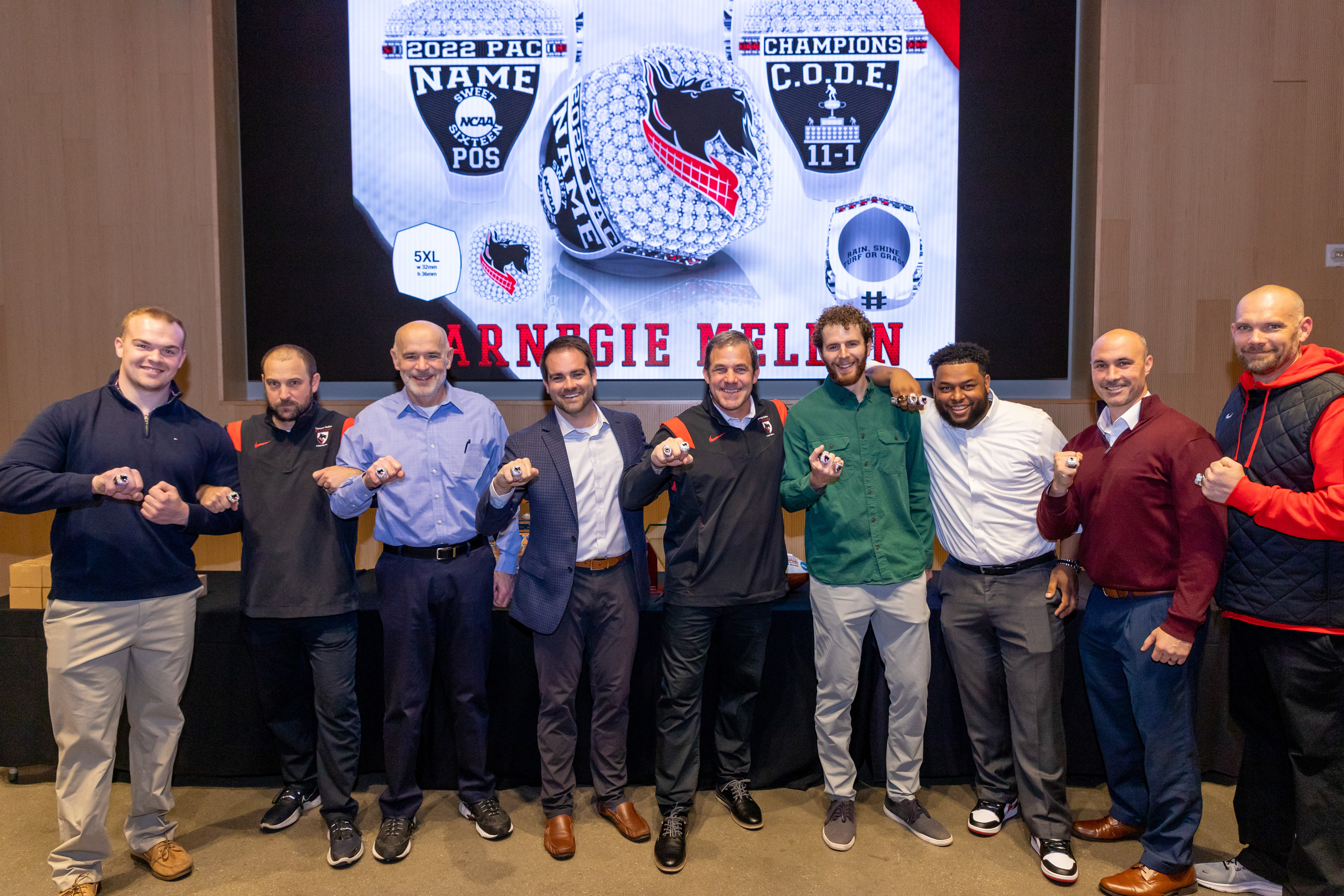 Photos from the Ring Ceremony for the 2022 President Athletics Conference Champions, the Carnegie Mellon University Tartans!