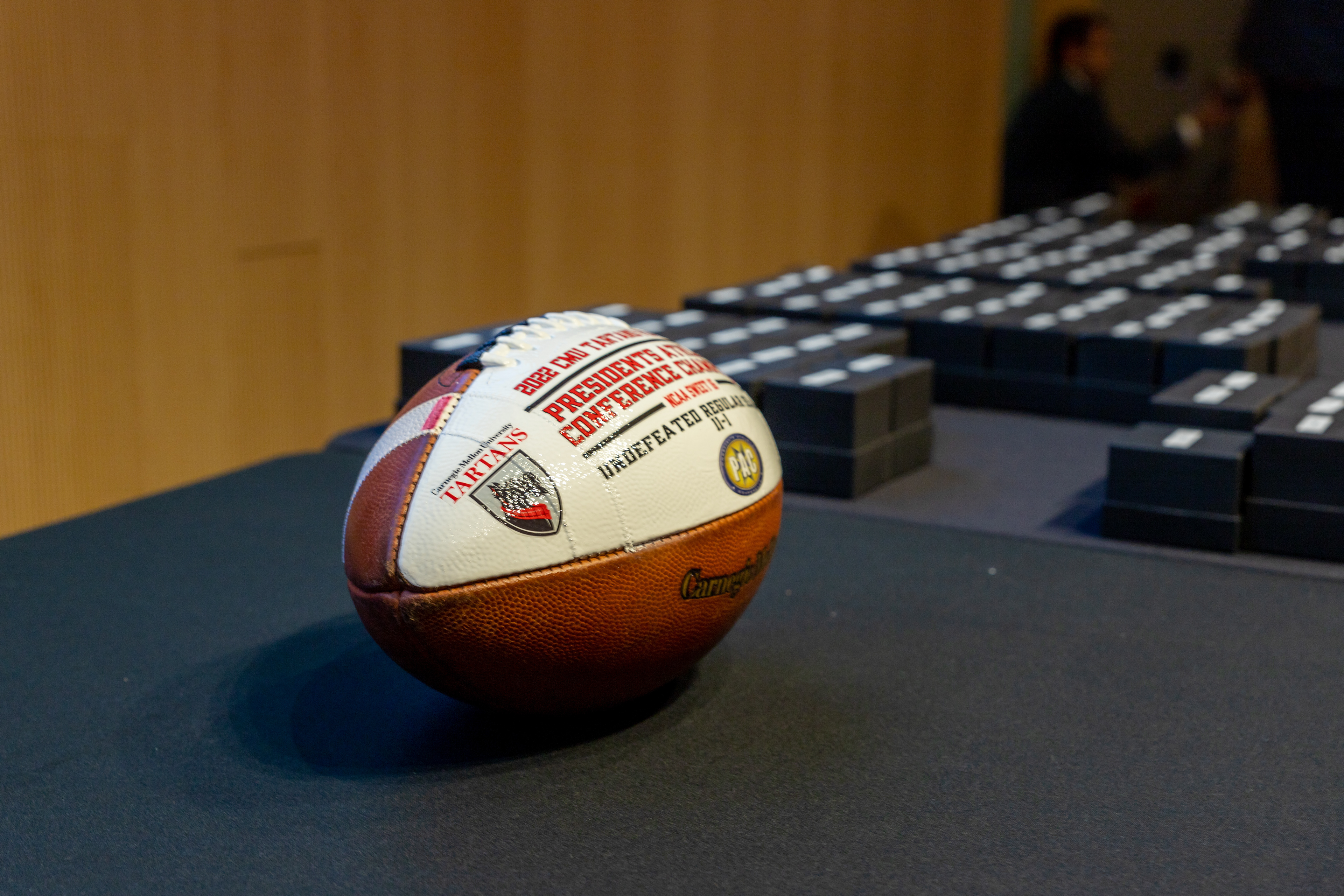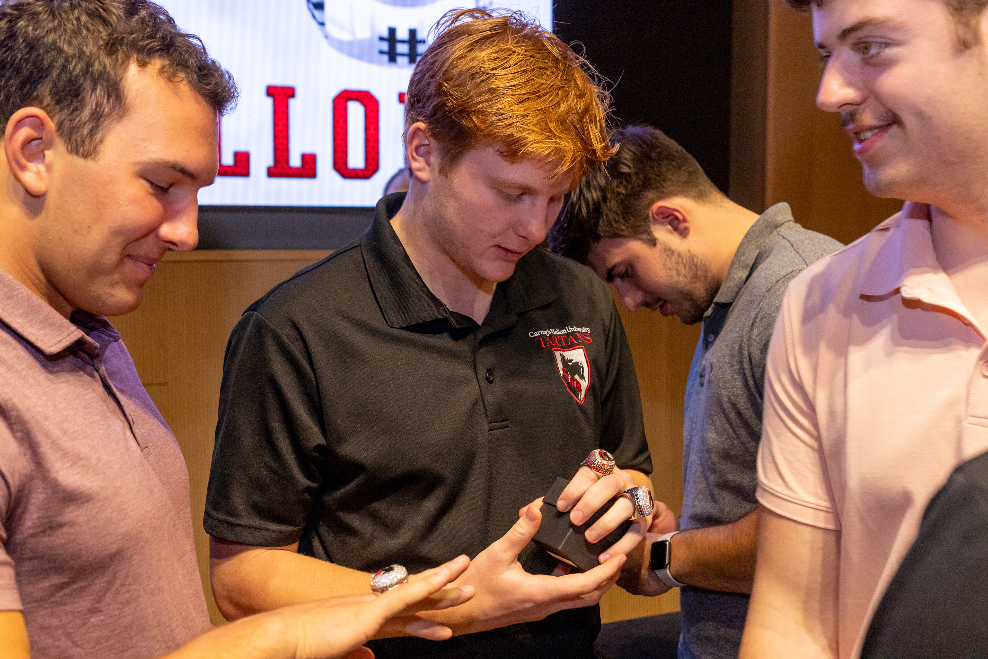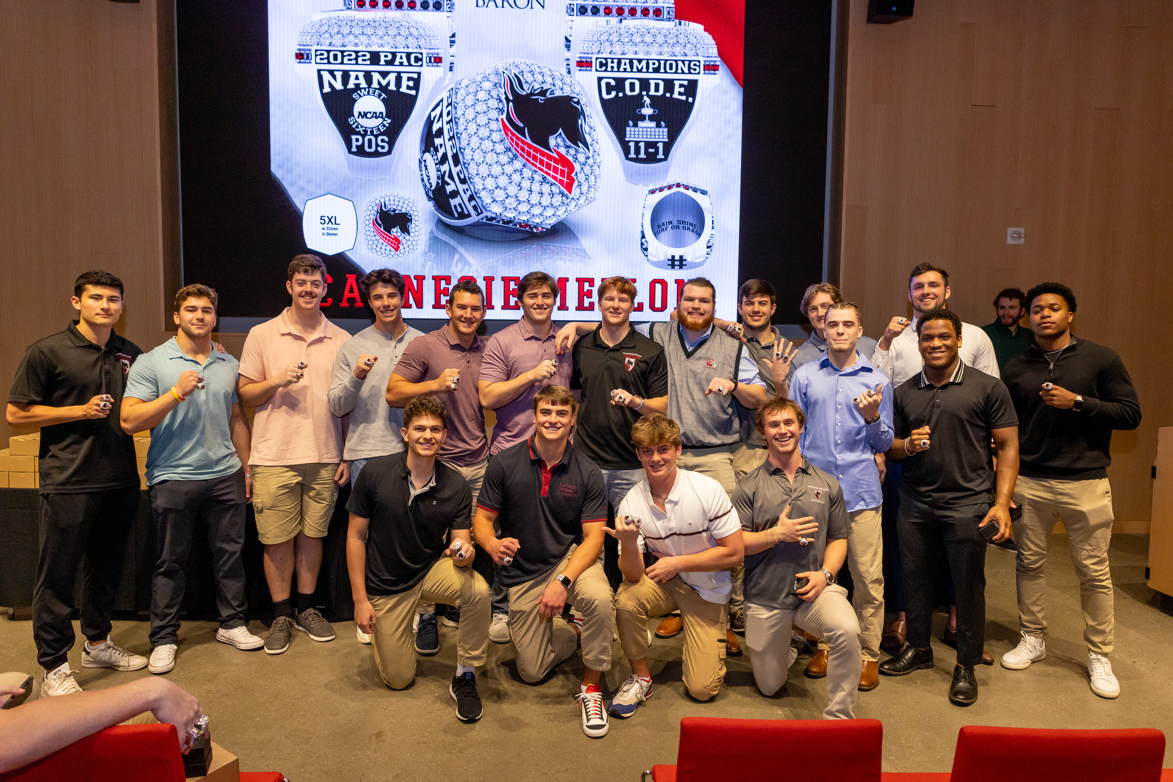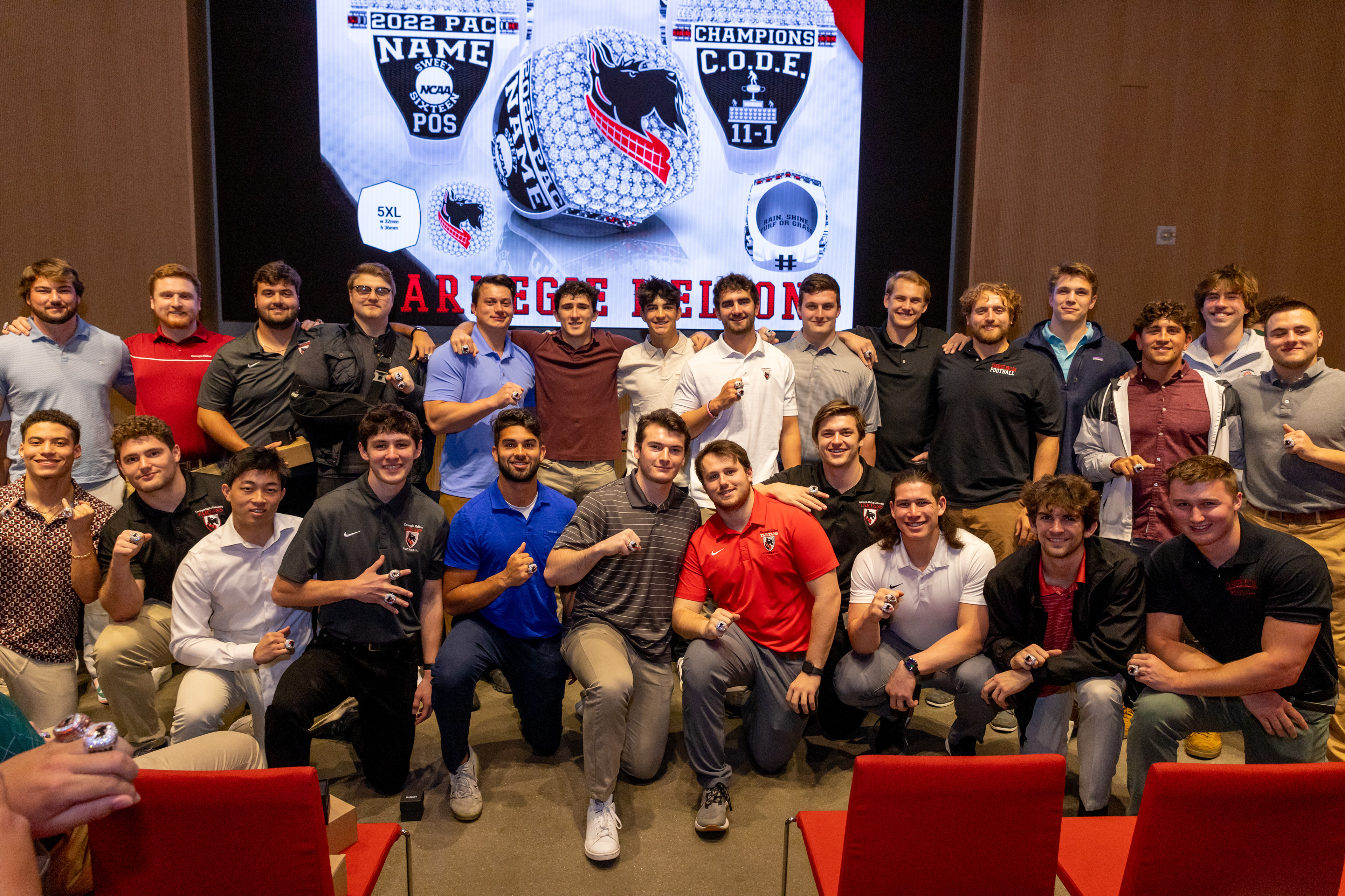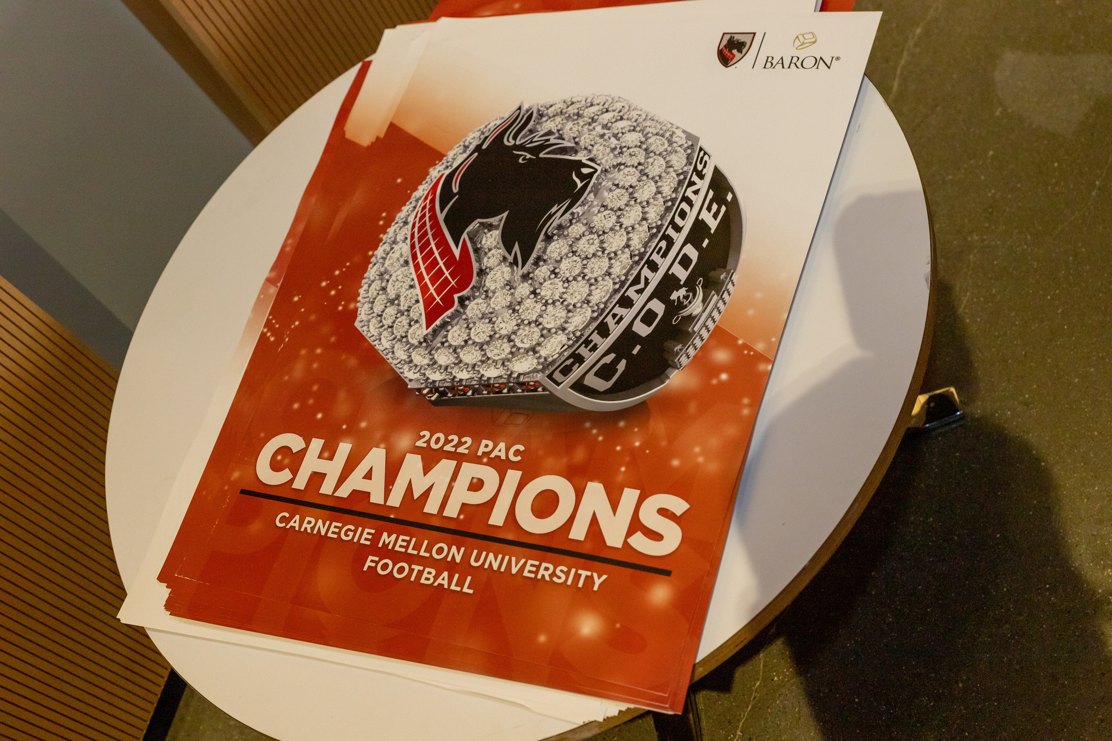 Photos from the Ring Ceremony for the 2022 President Athletics Conference Champions, the Carnegie Mellon University Tartans!