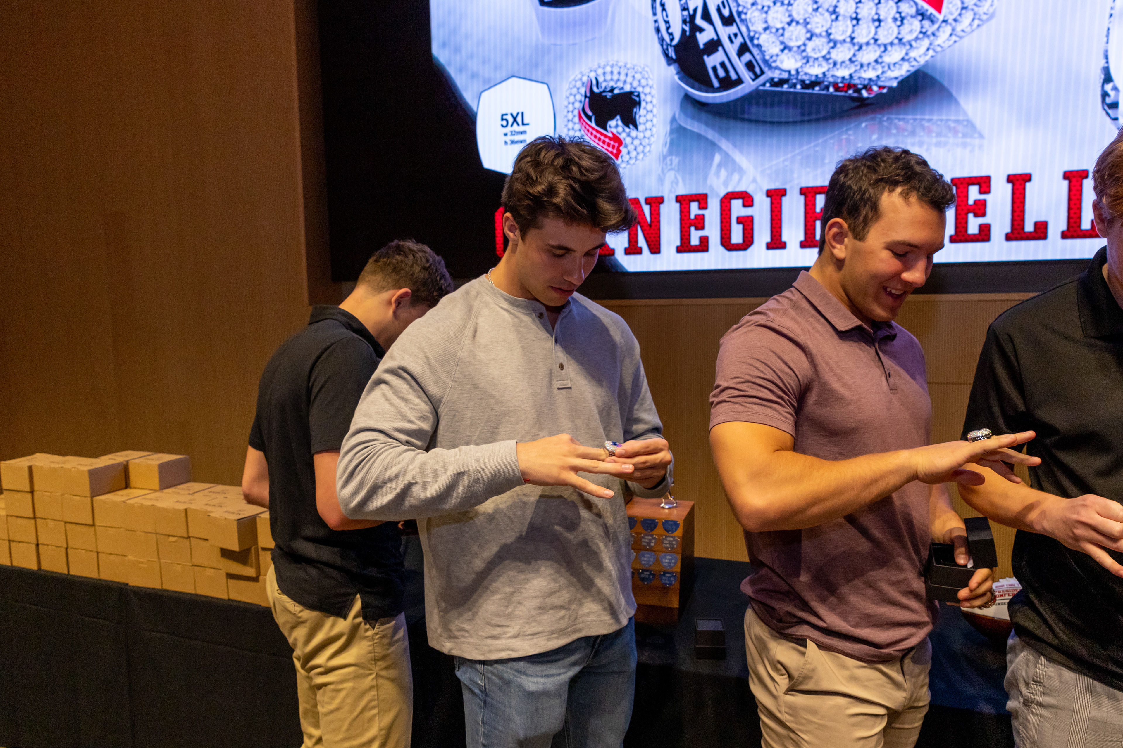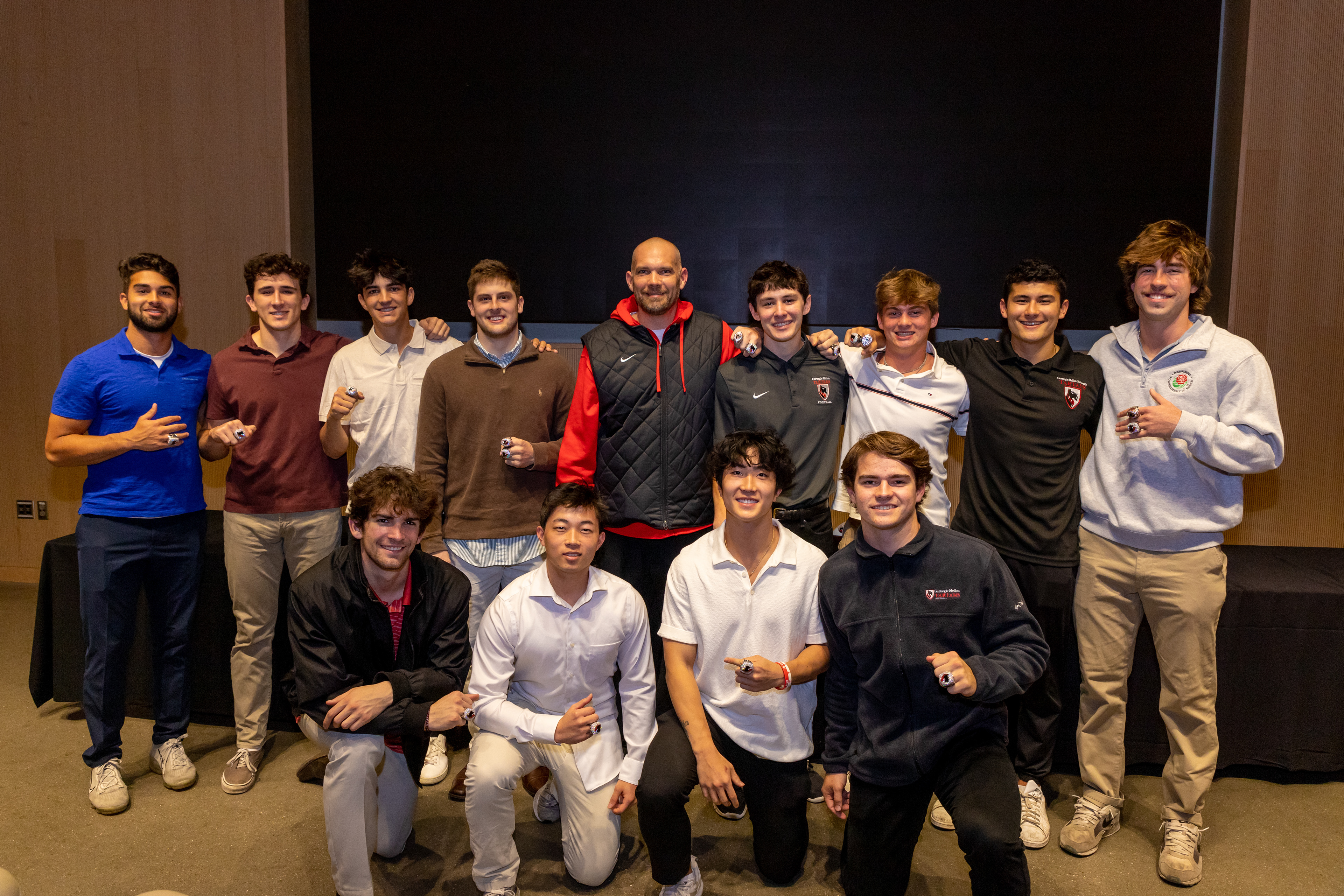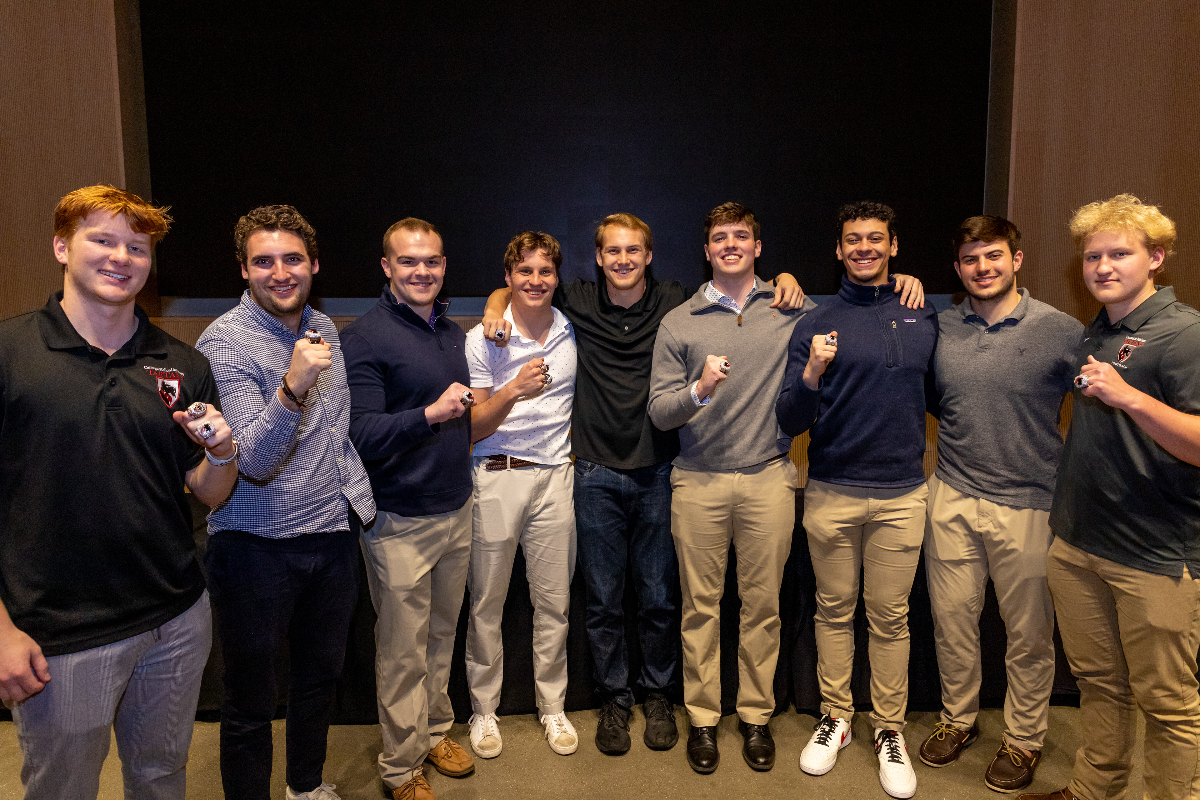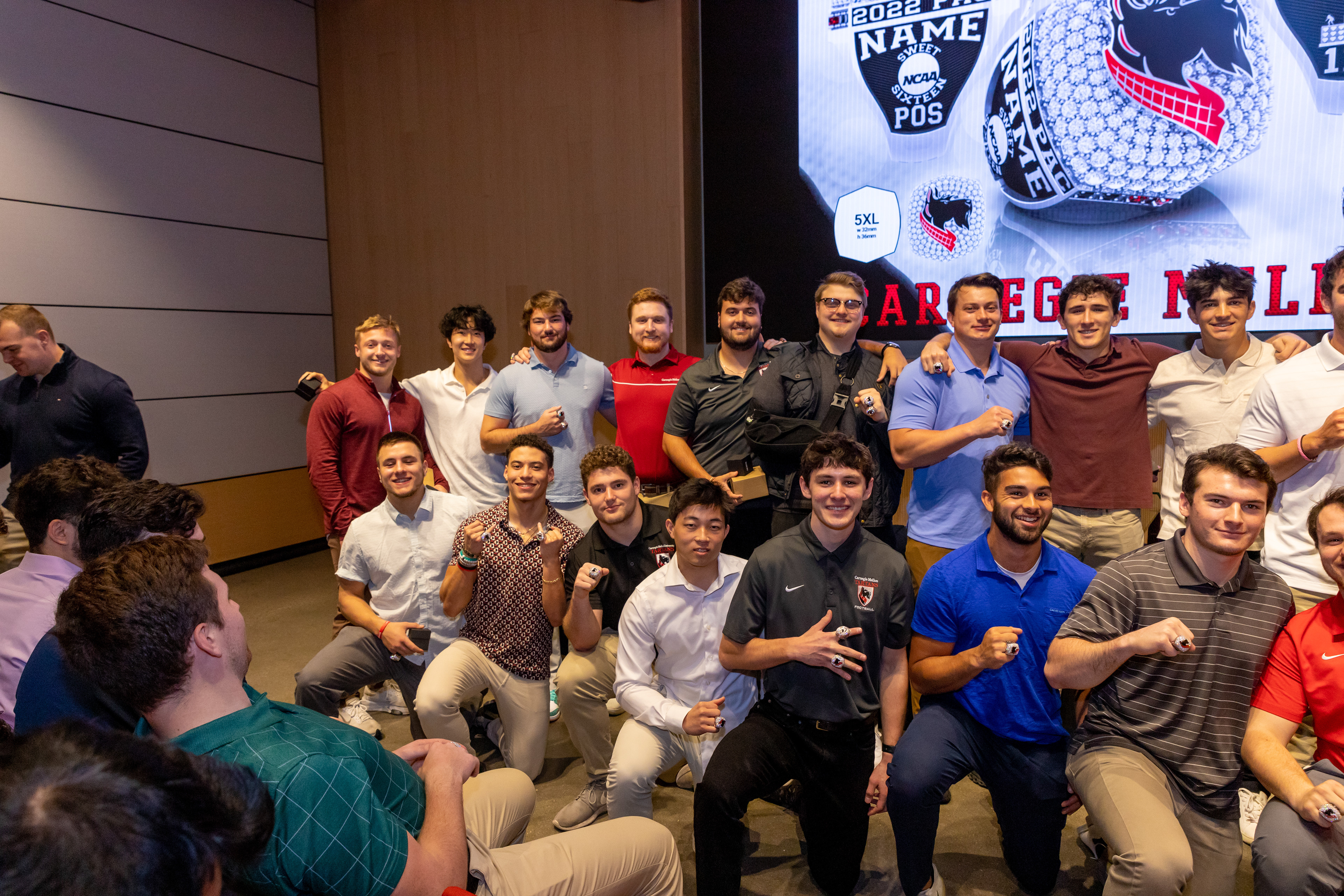 Photos from the Ring Ceremony for the 2022 President Athletics Conference Champions, the Carnegie Mellon University Tartans!