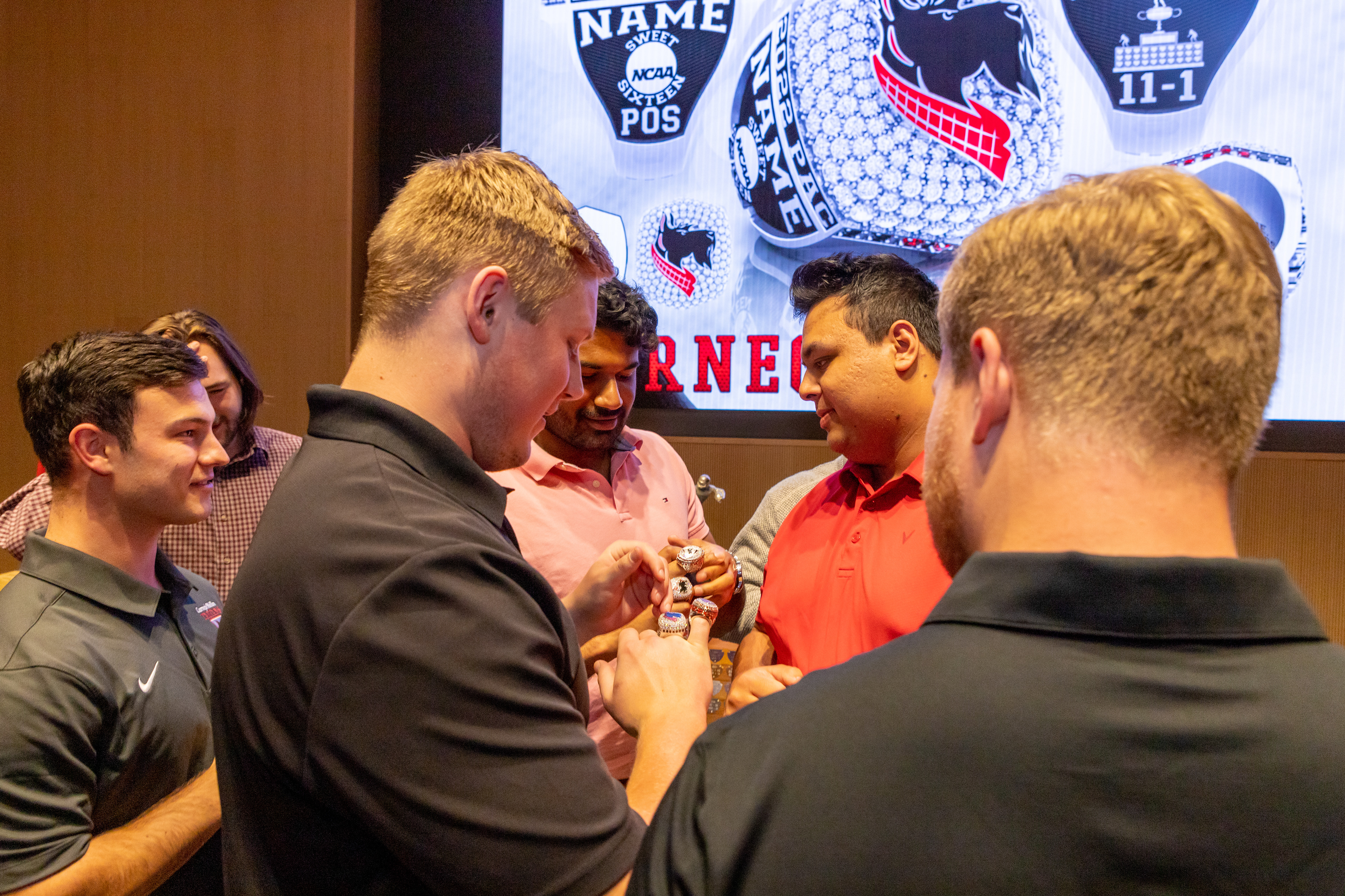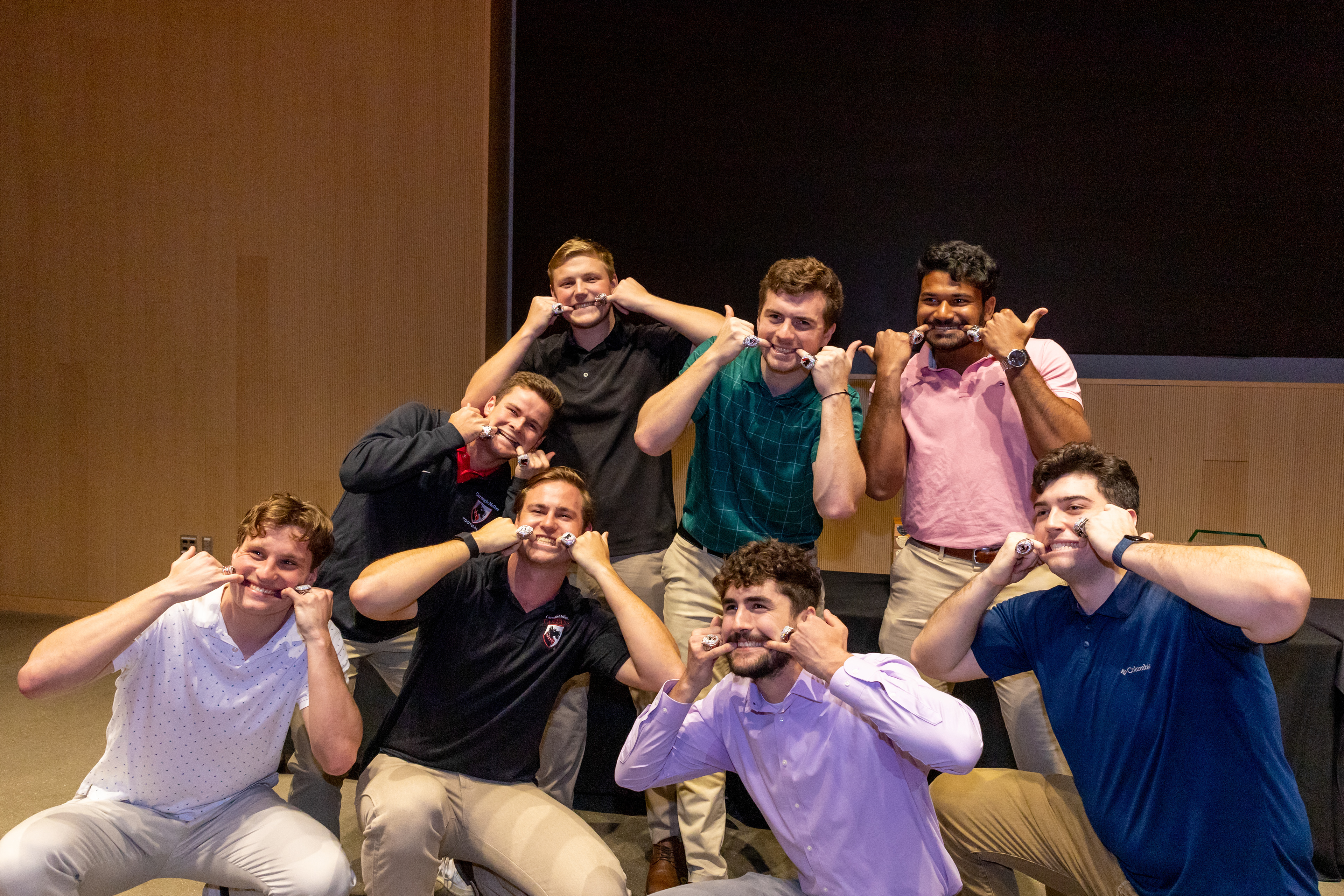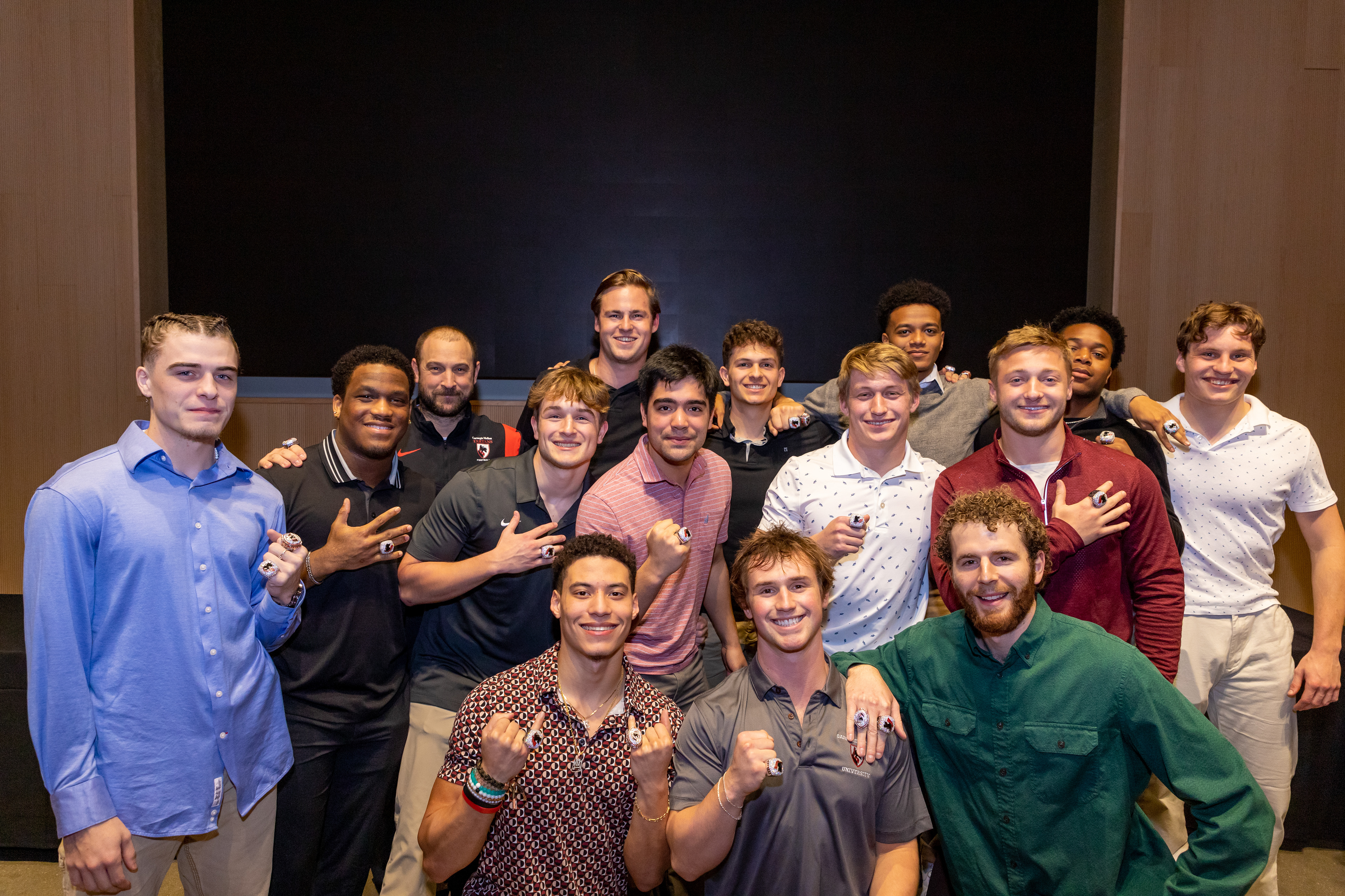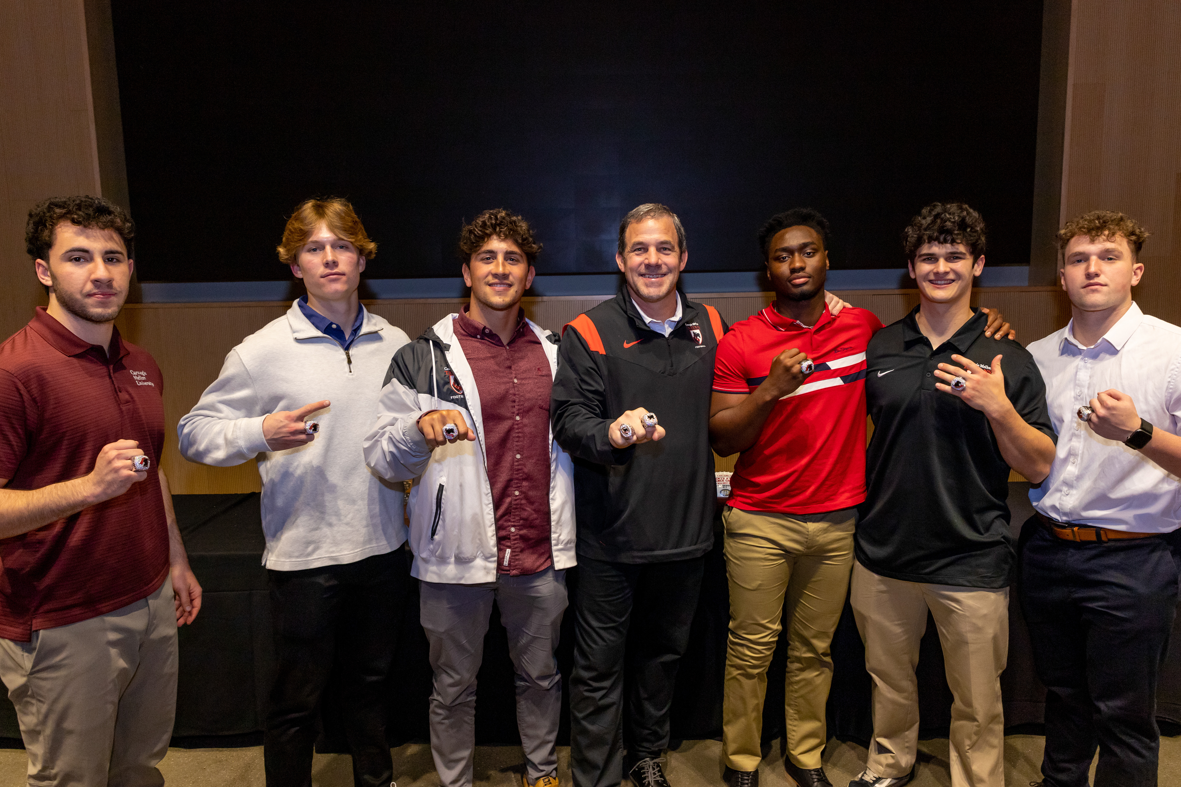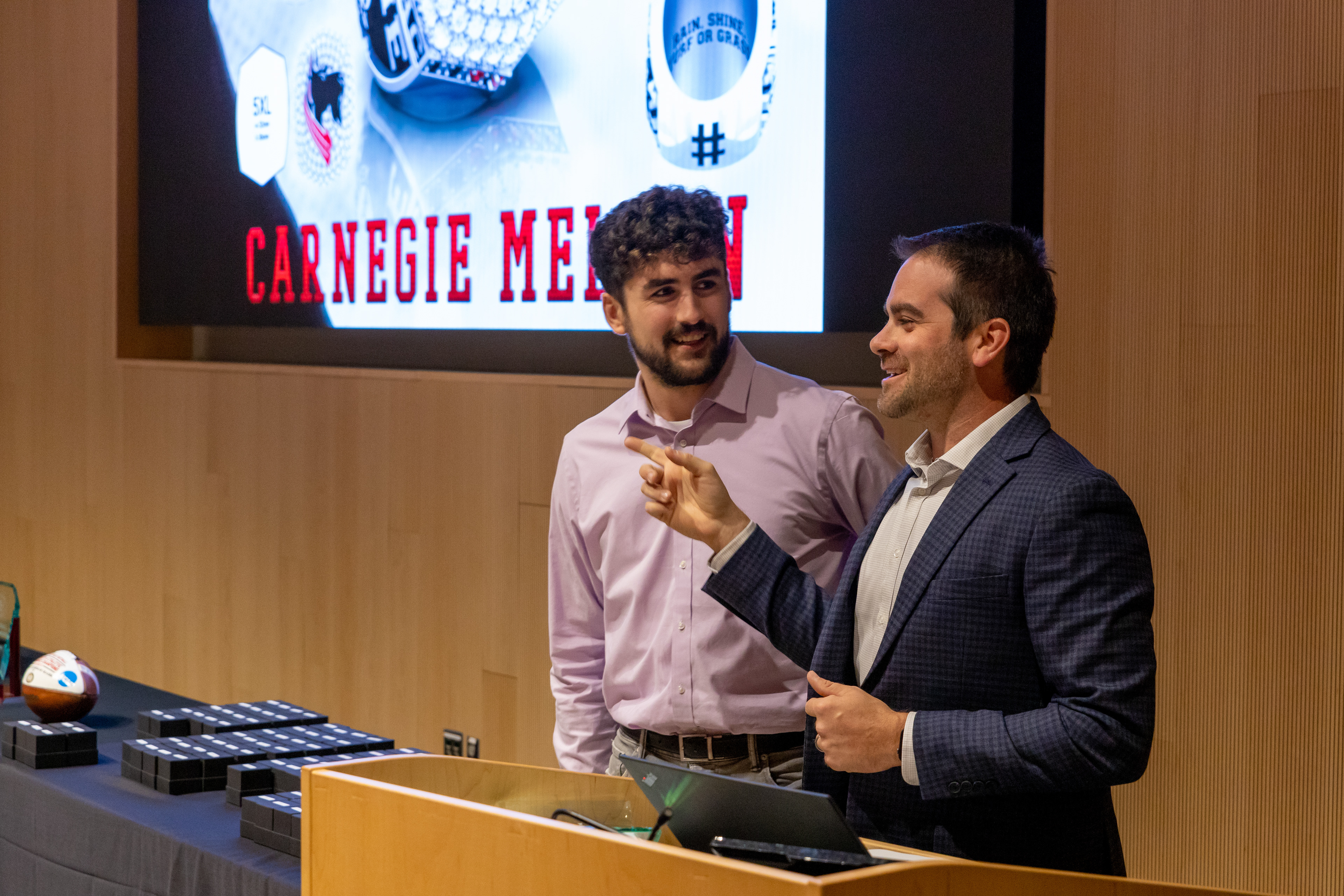 Photos from the Ring Ceremony for the 2022 President Athletics Conference Champions, the Carnegie Mellon University Tartans!