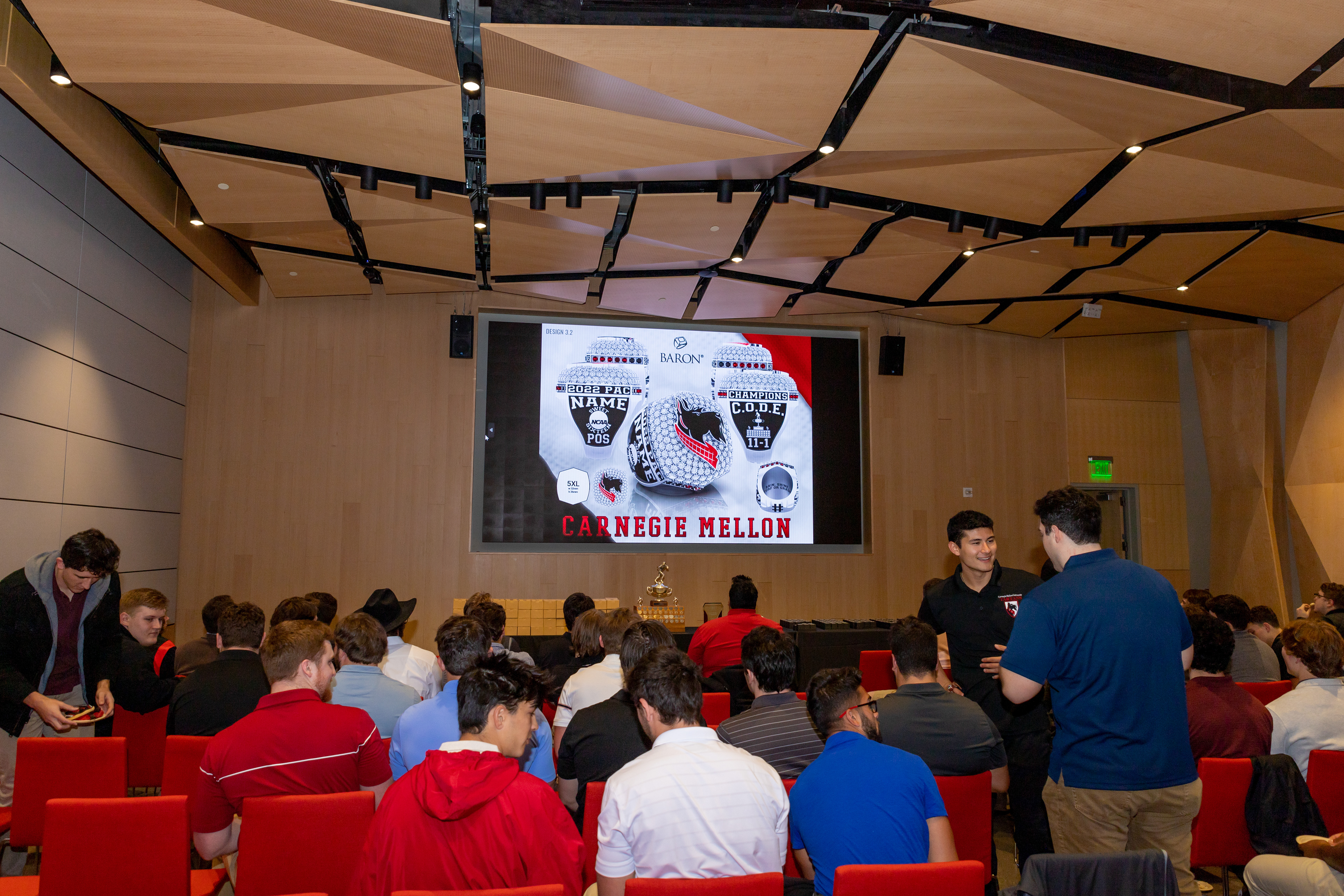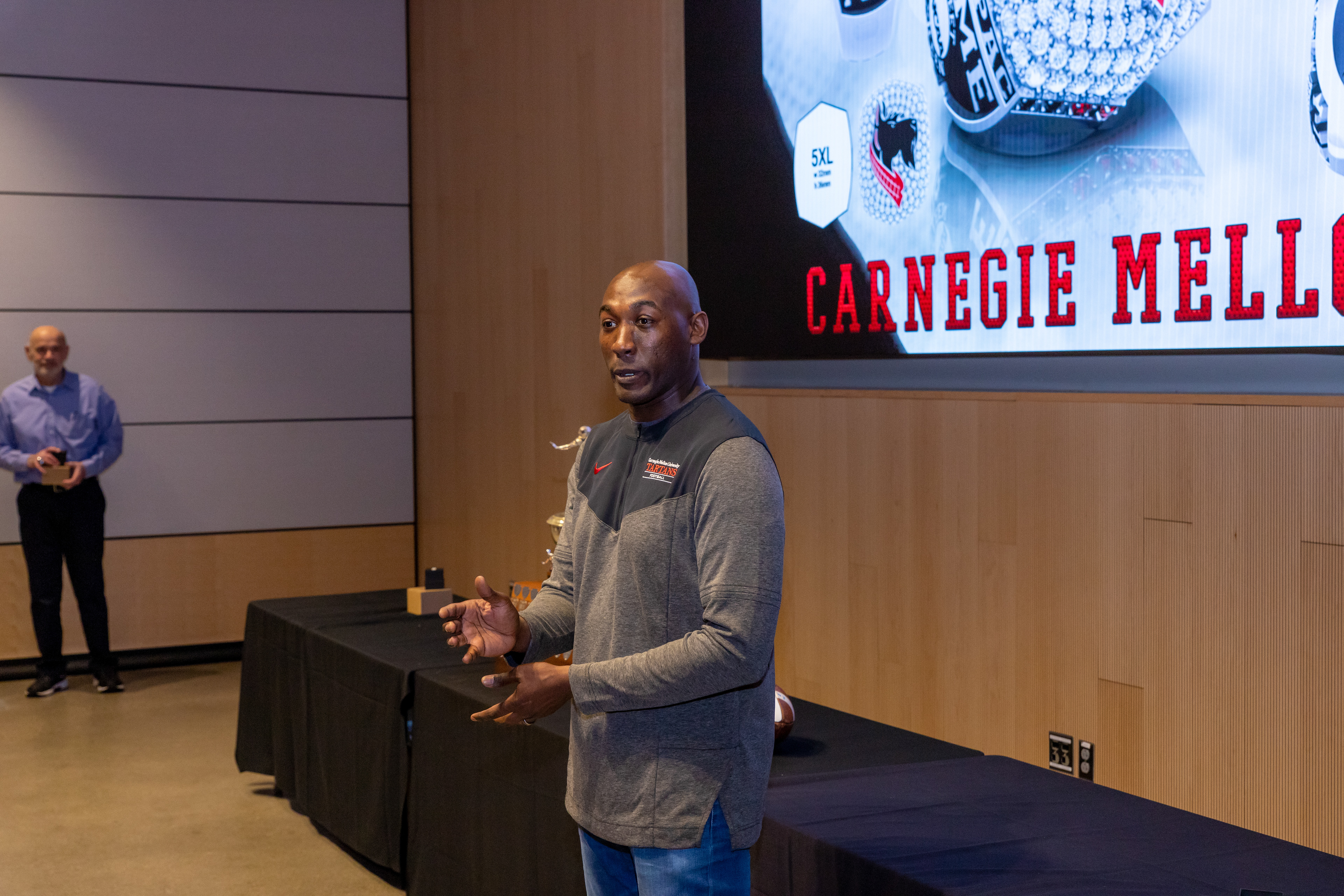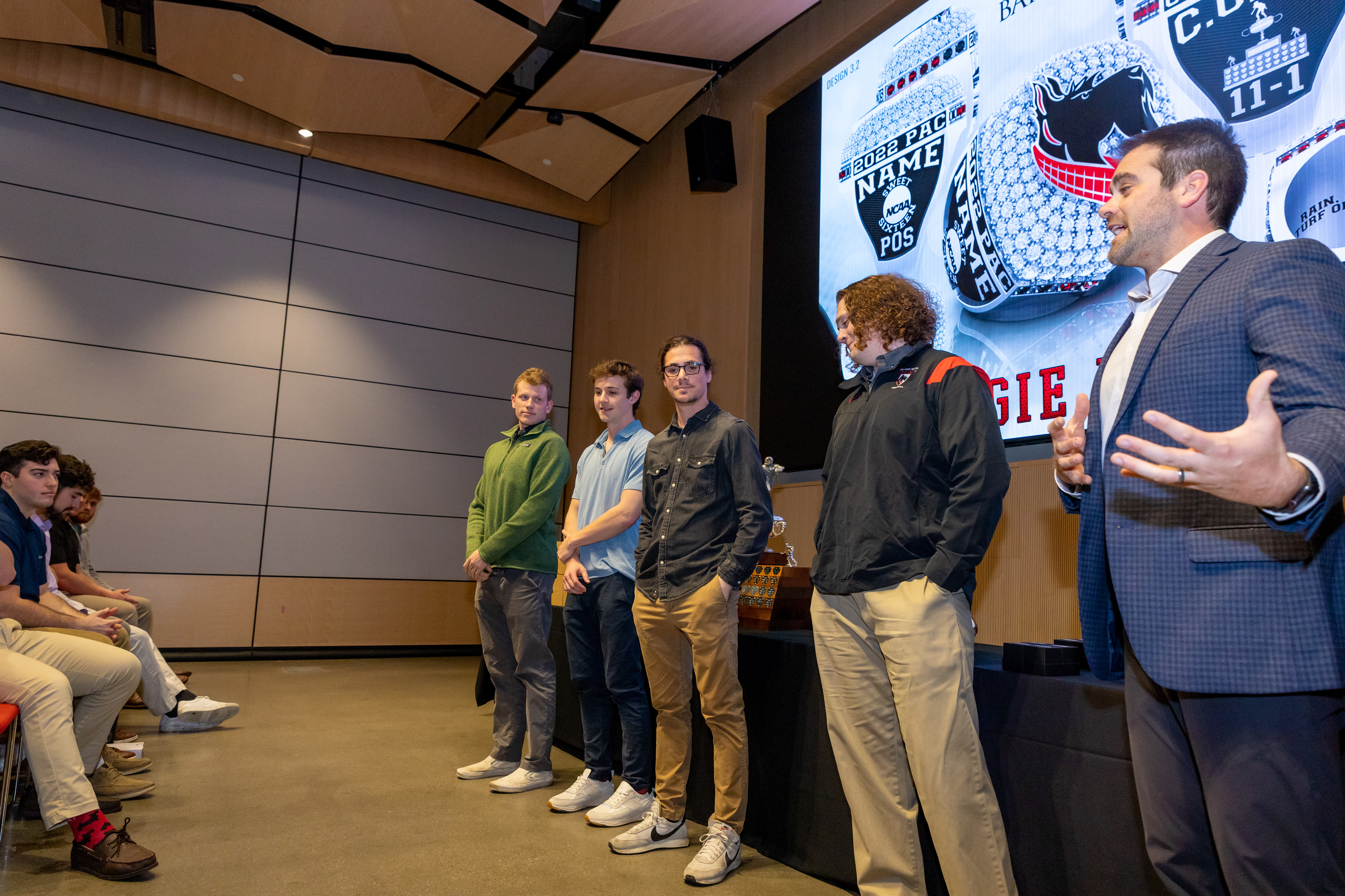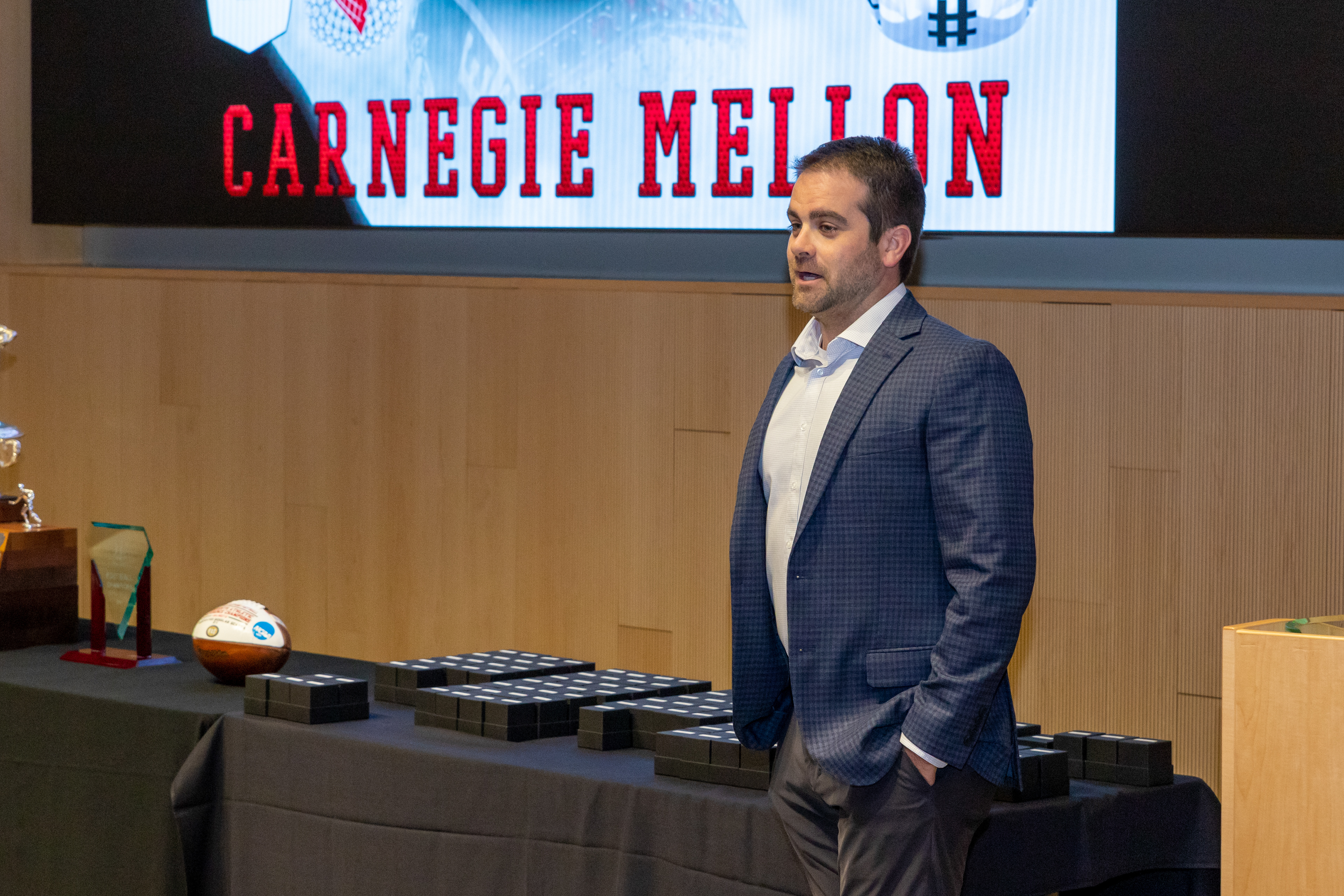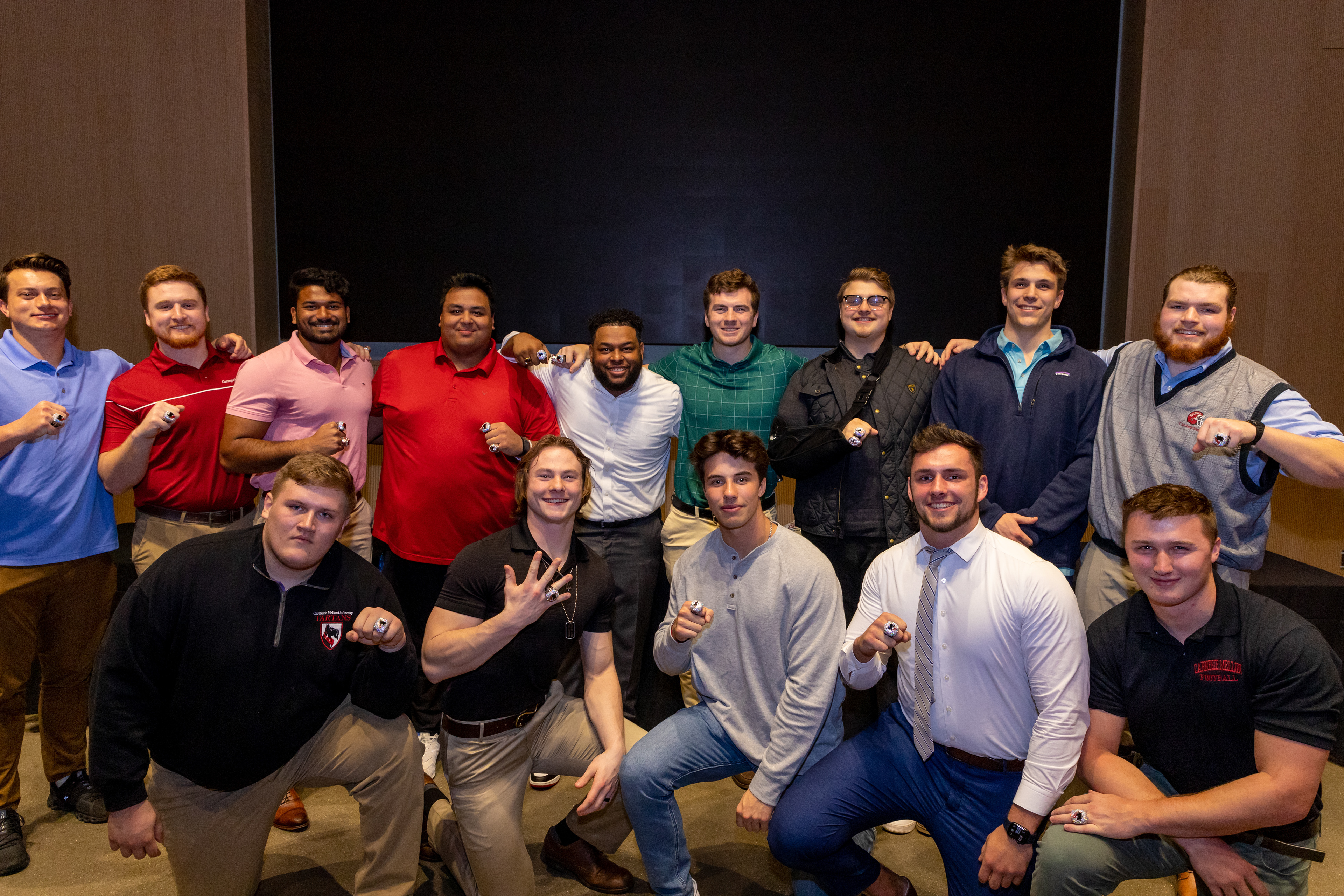 Photos from the Ring Ceremony for the 2022 President Athletics Conference Champions, the Carnegie Mellon University Tartans!