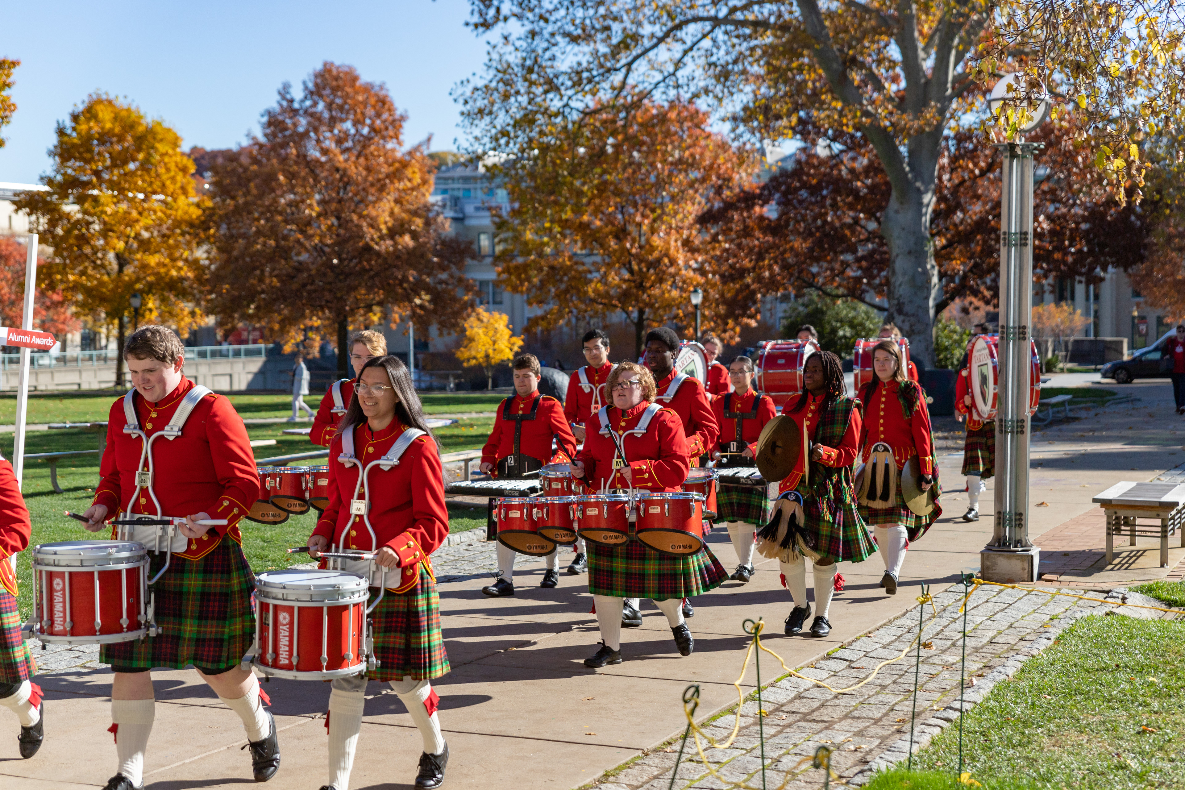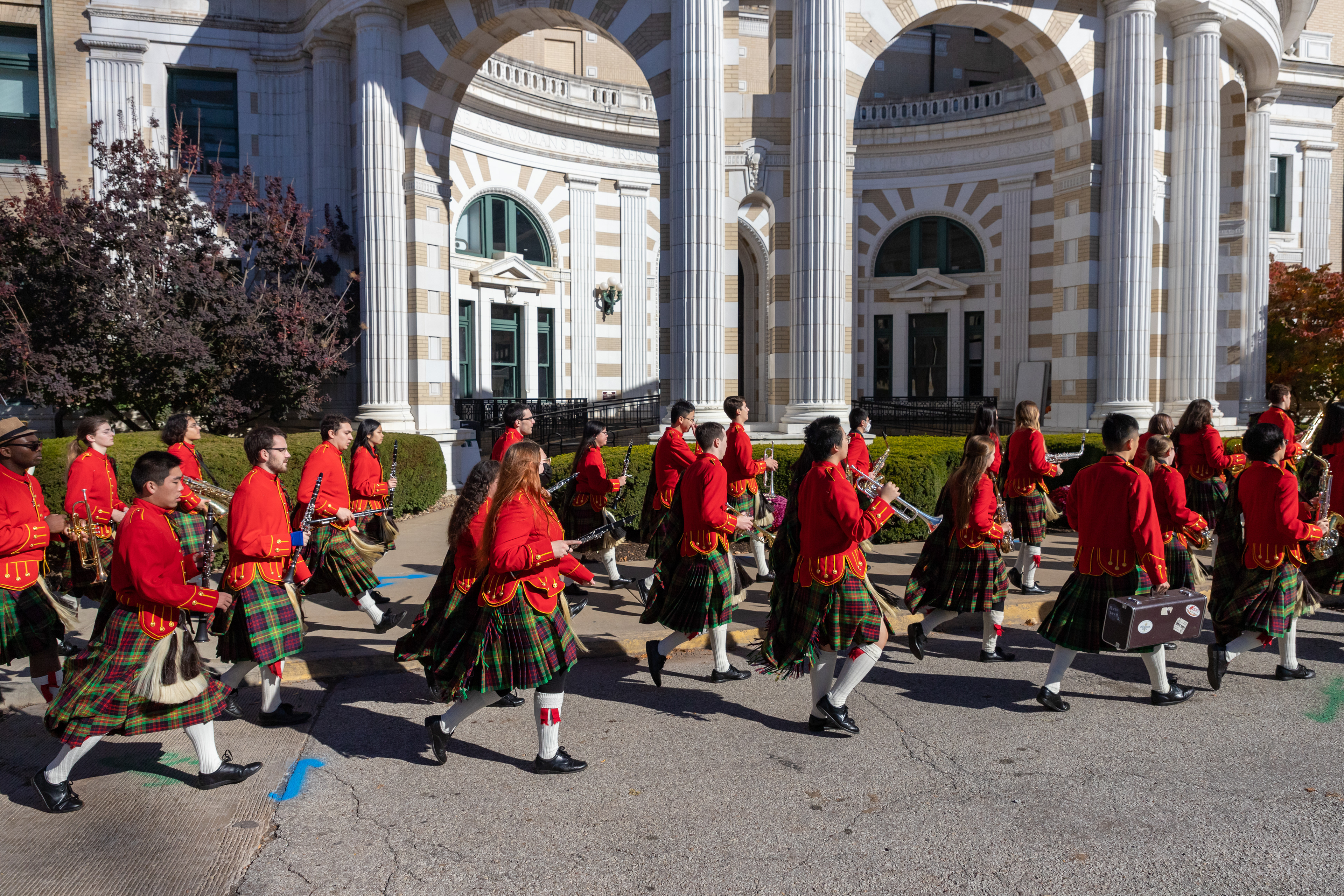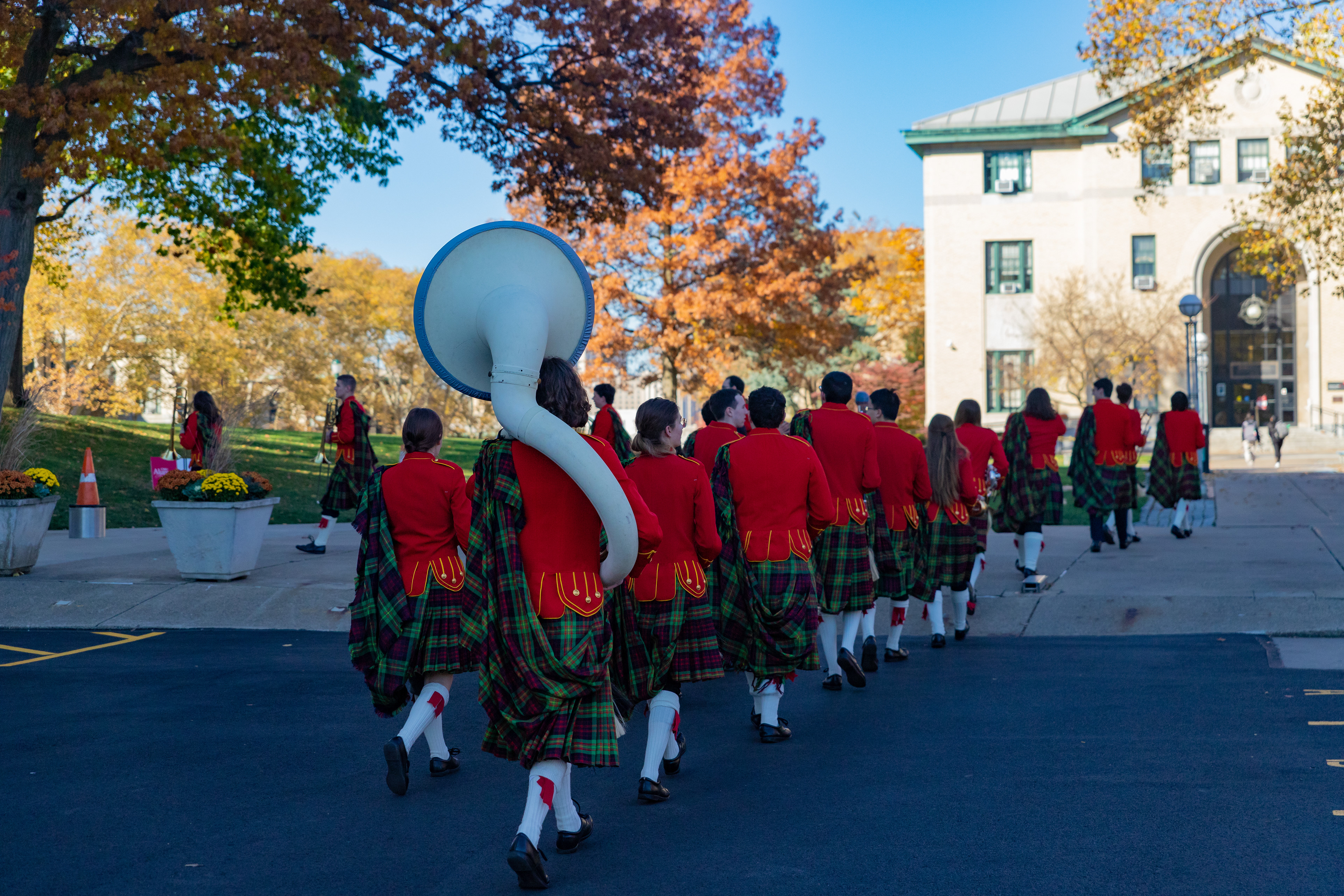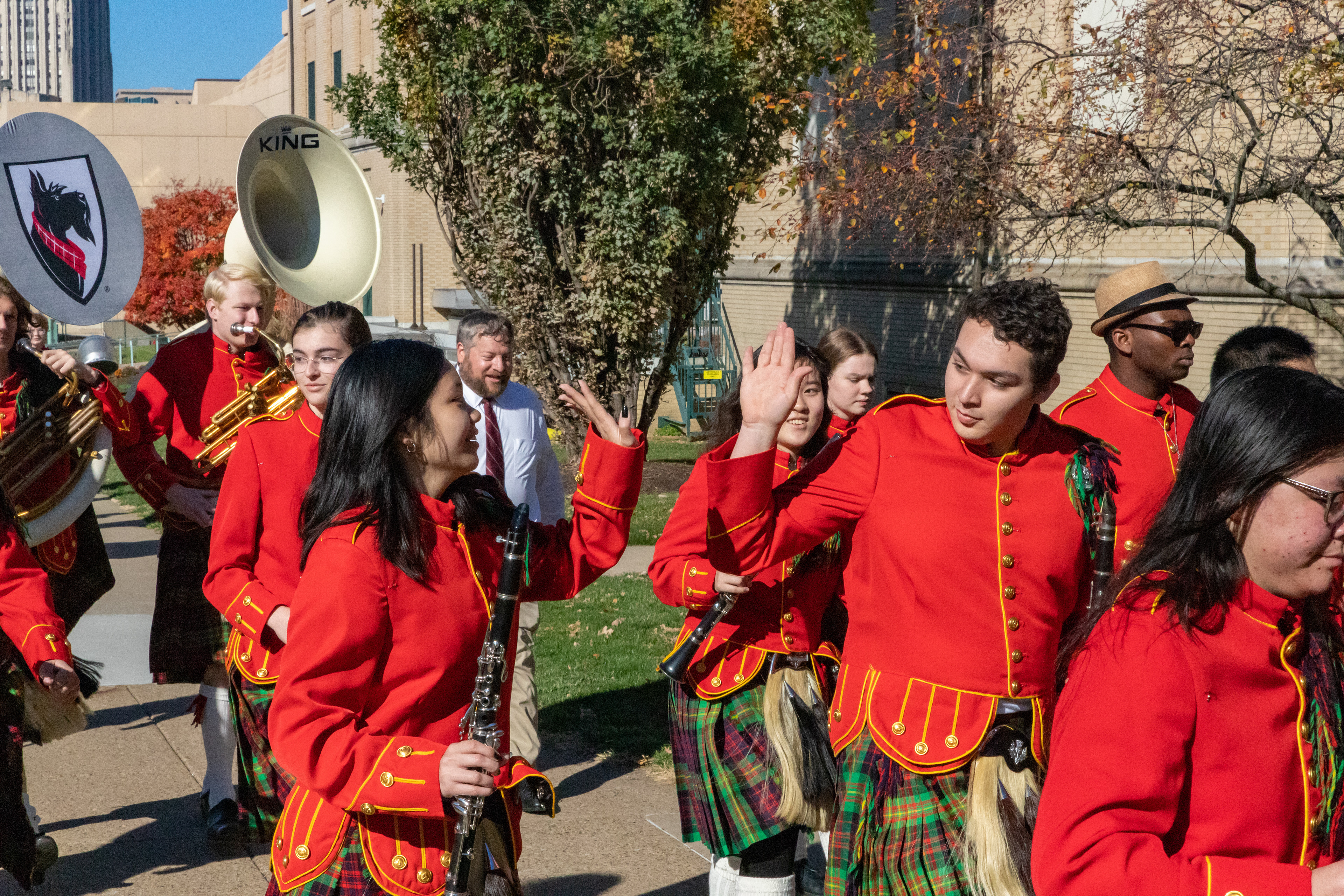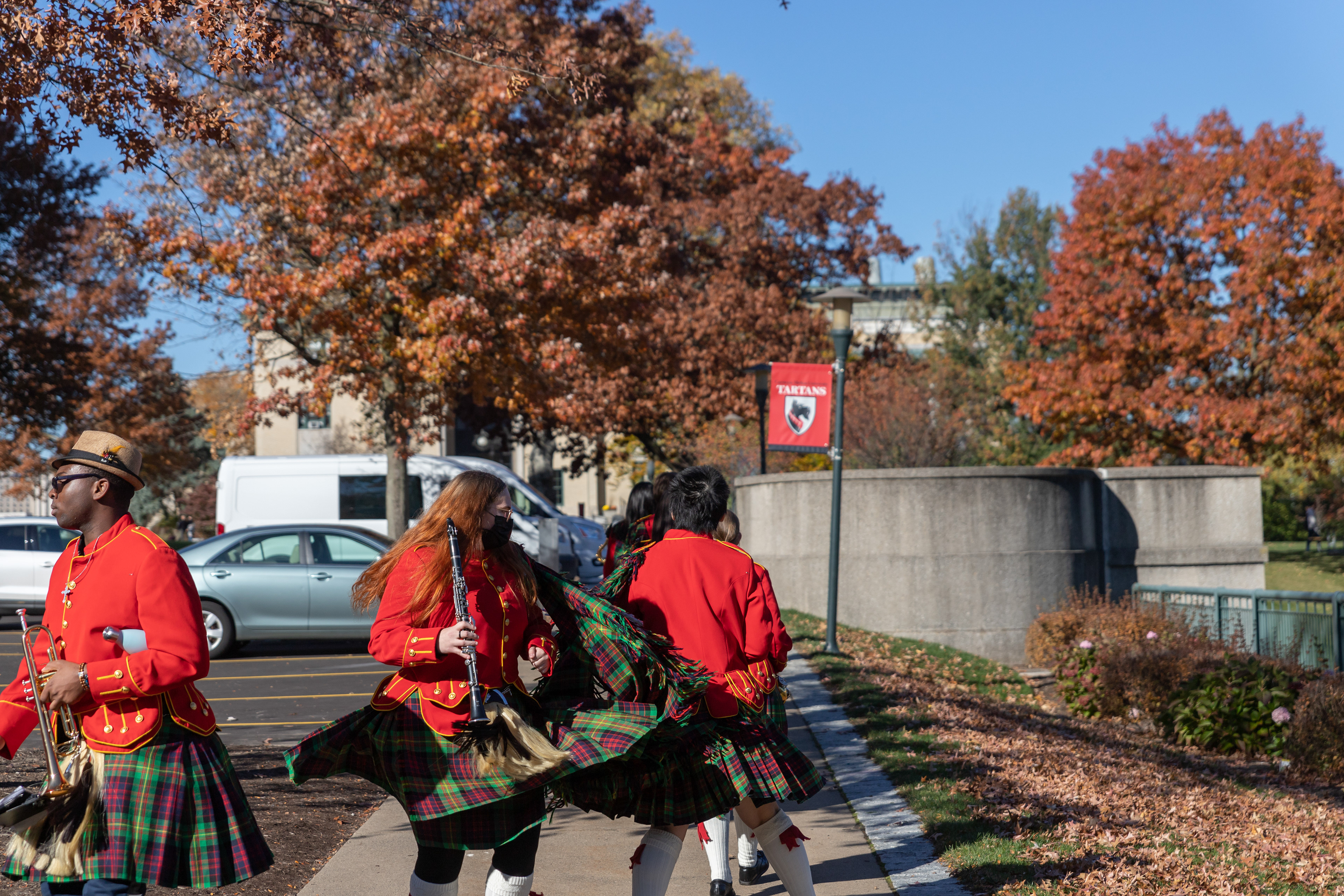 The Kilties march through campus on their way to and from formal pictures and spread homecoming cheer.