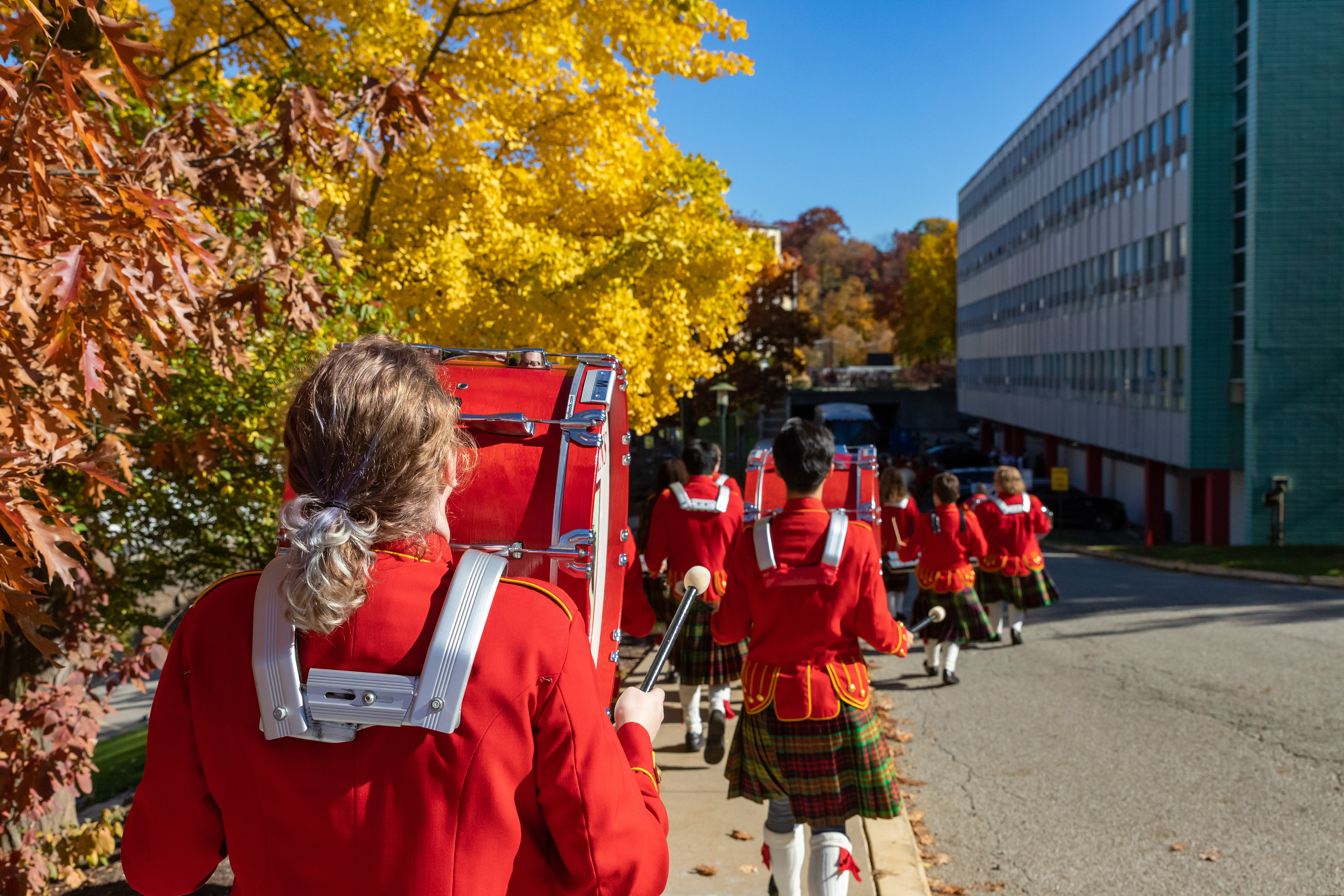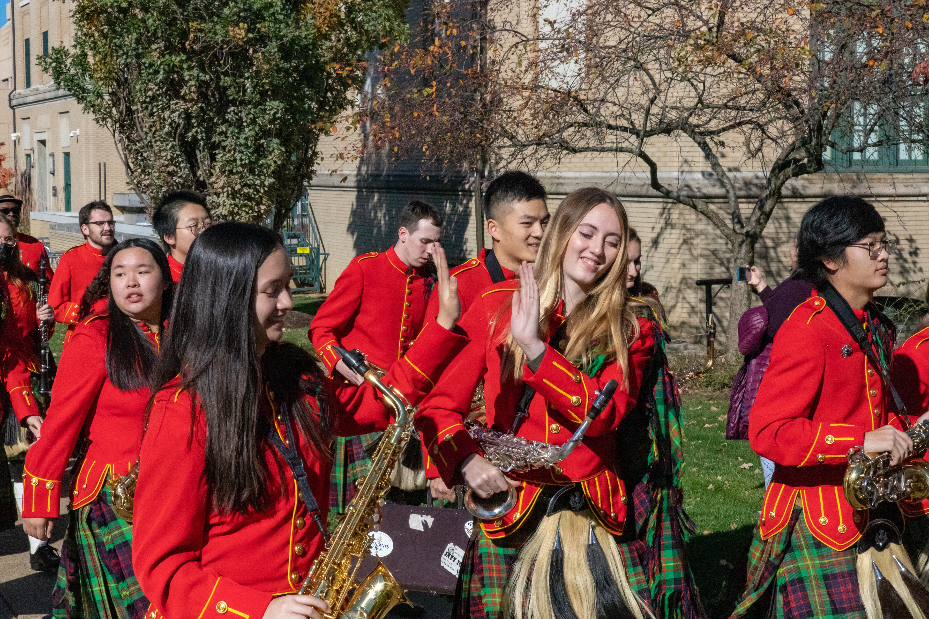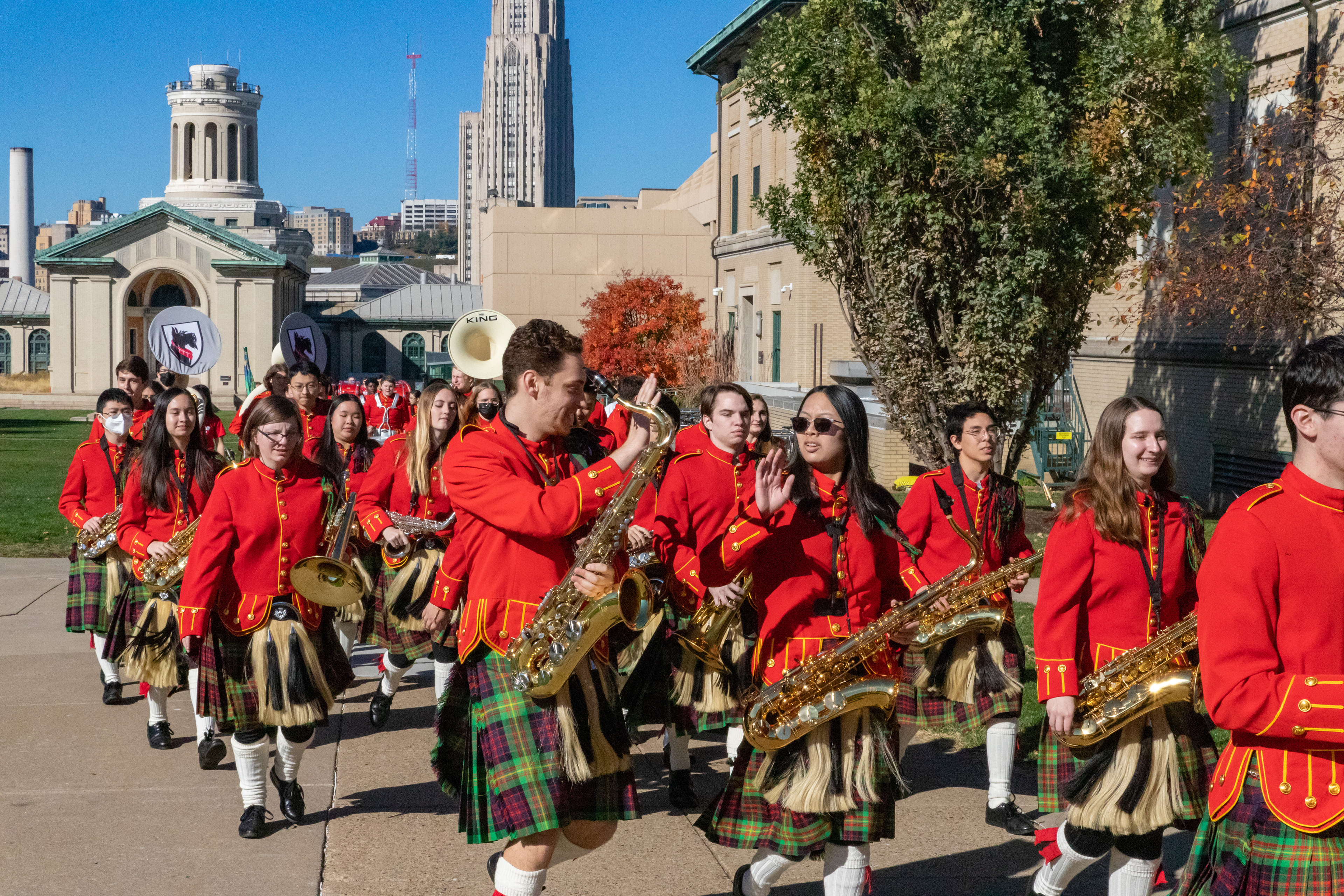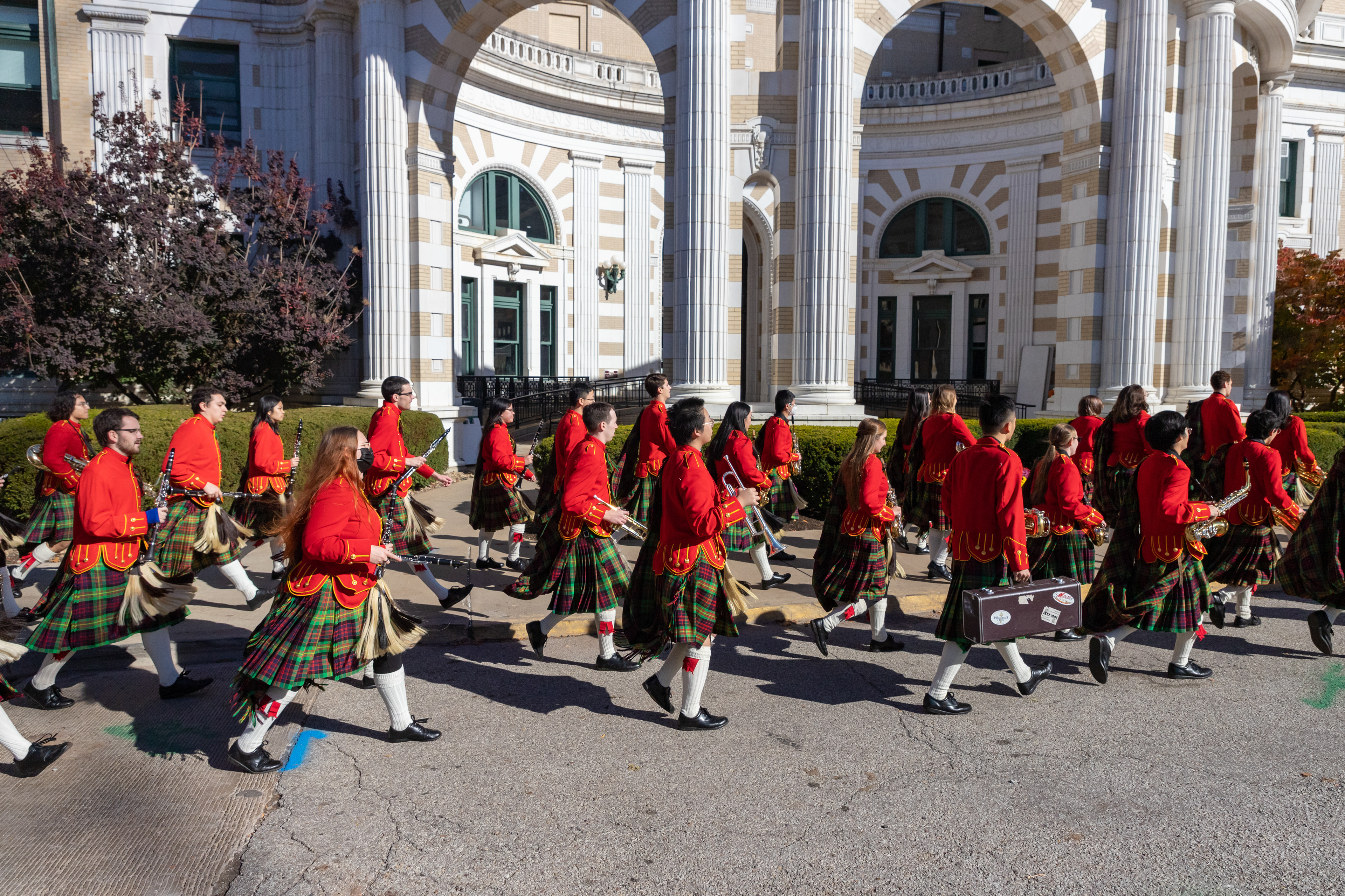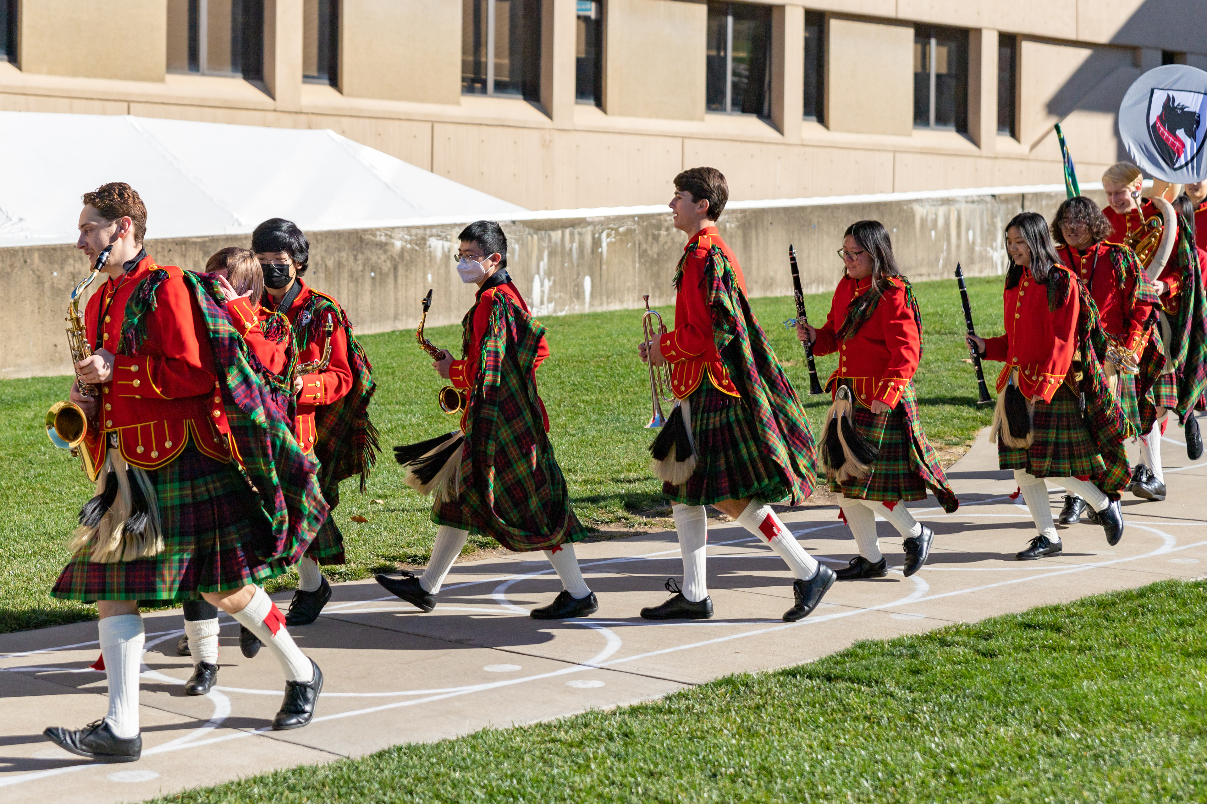 The Kilties march through campus on their way to and from formal pictures and spread homecoming cheer.