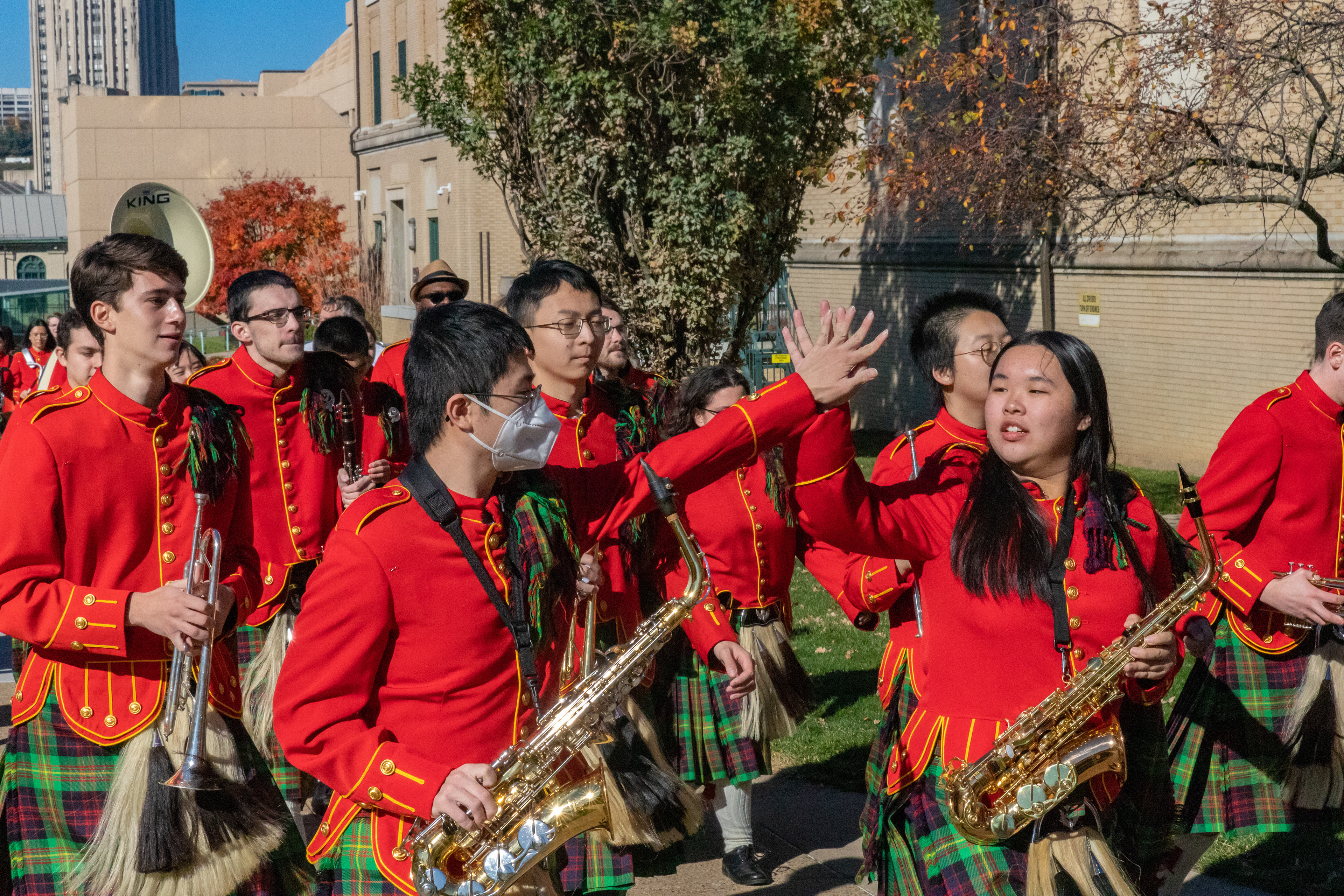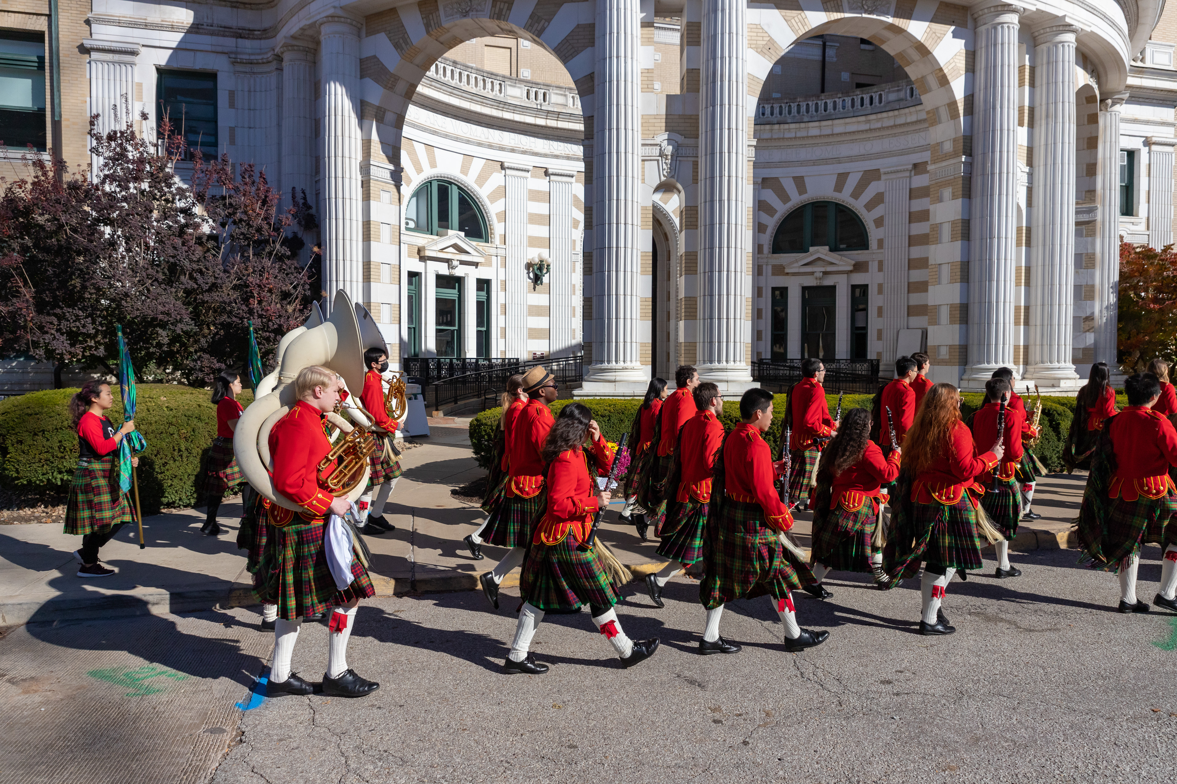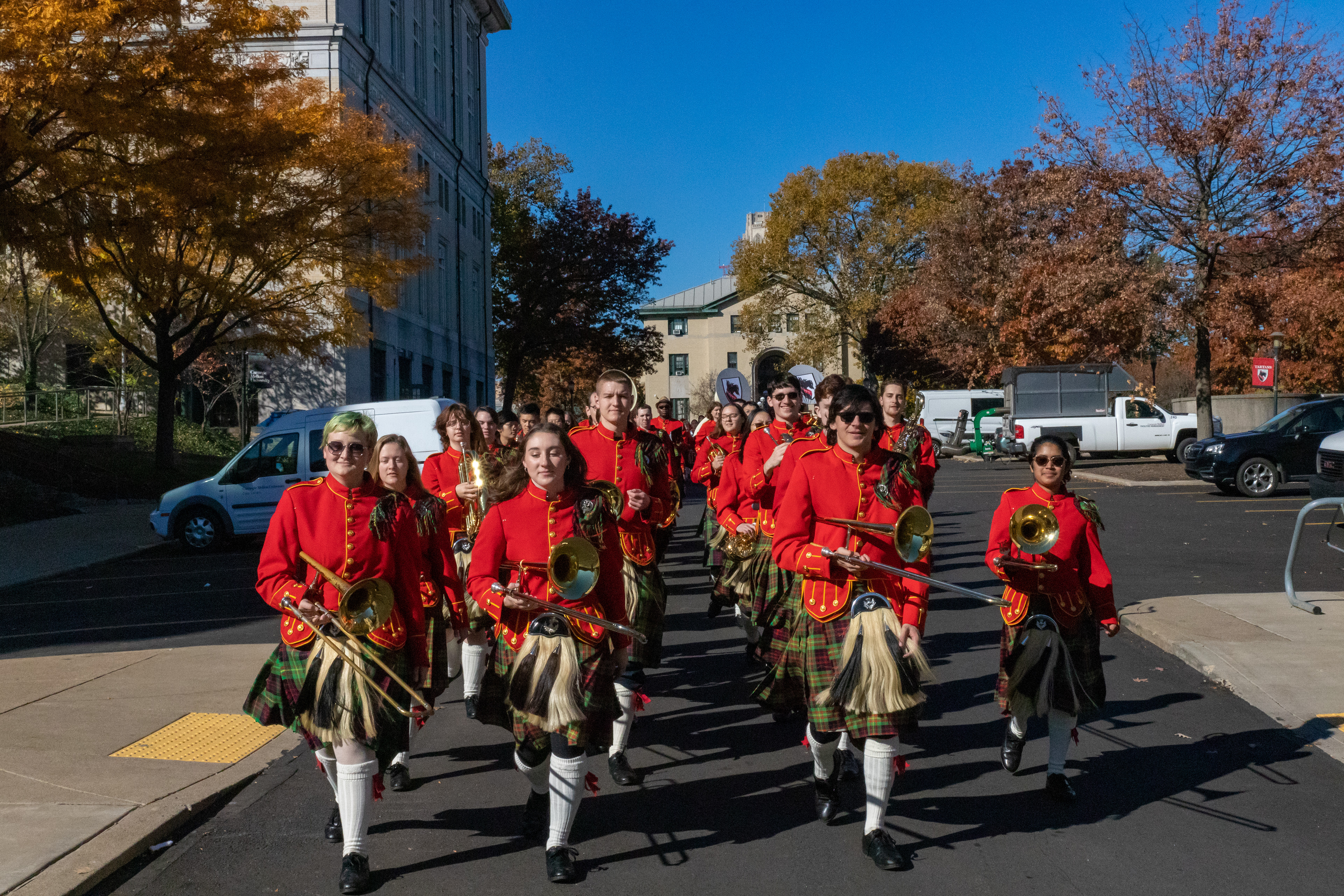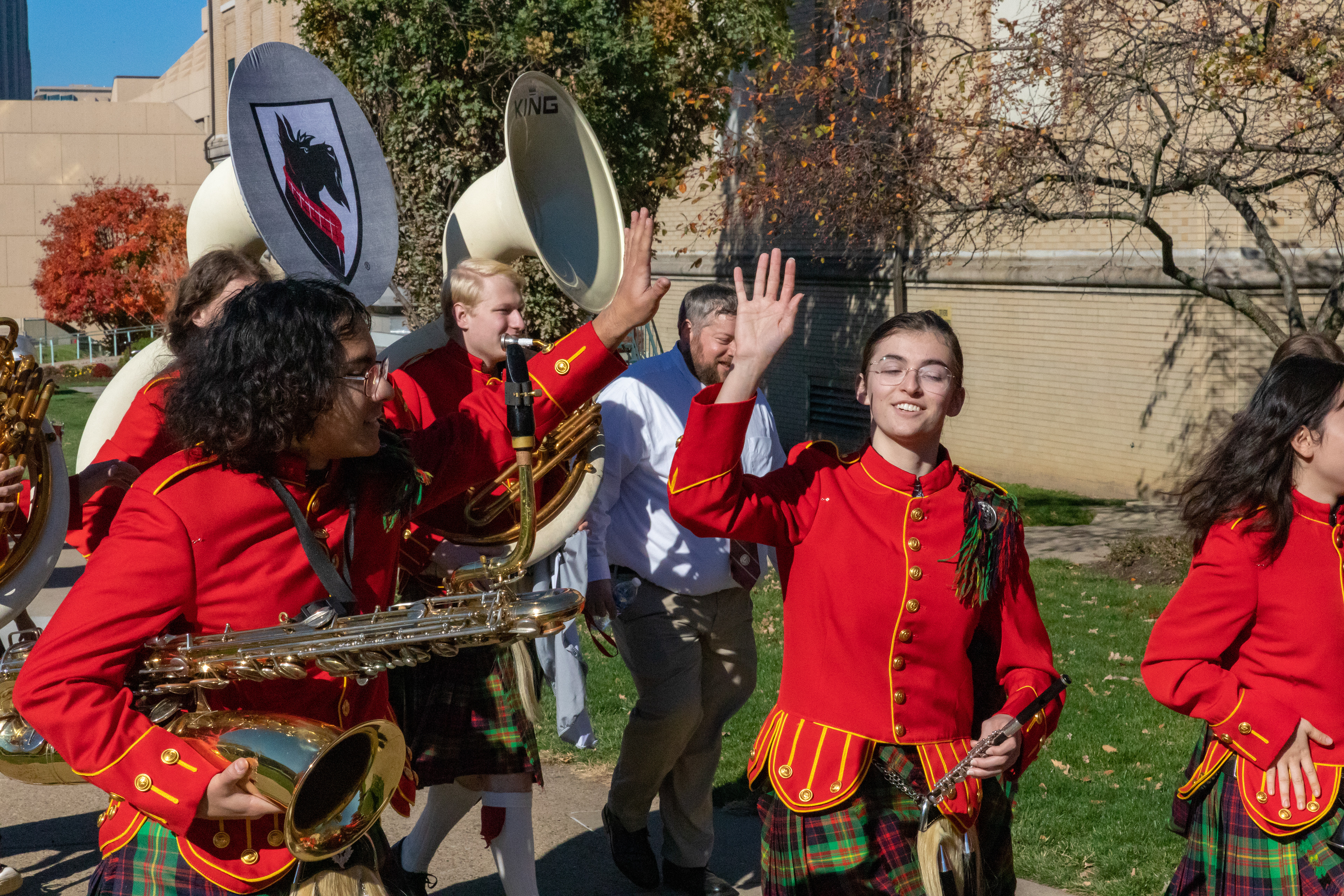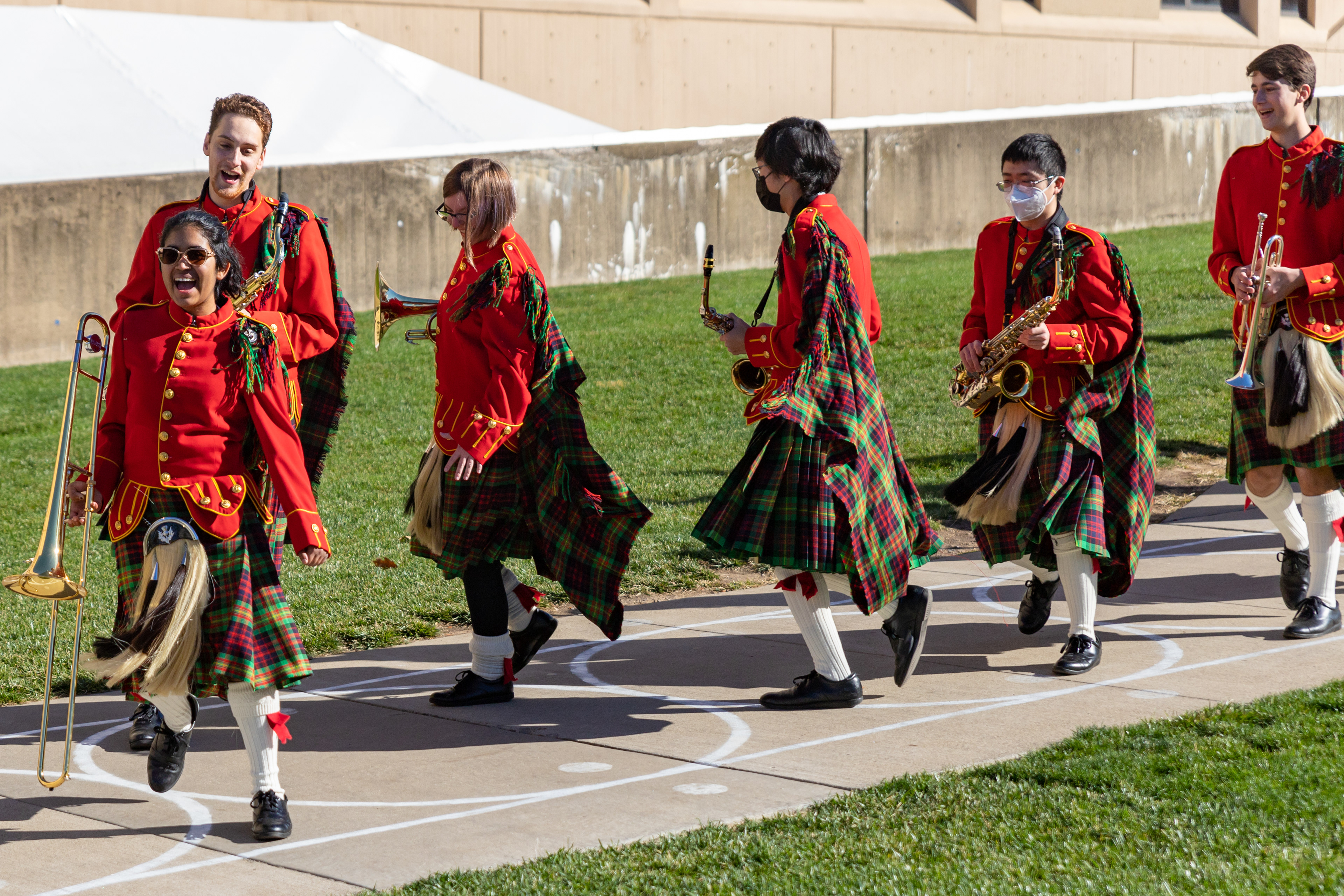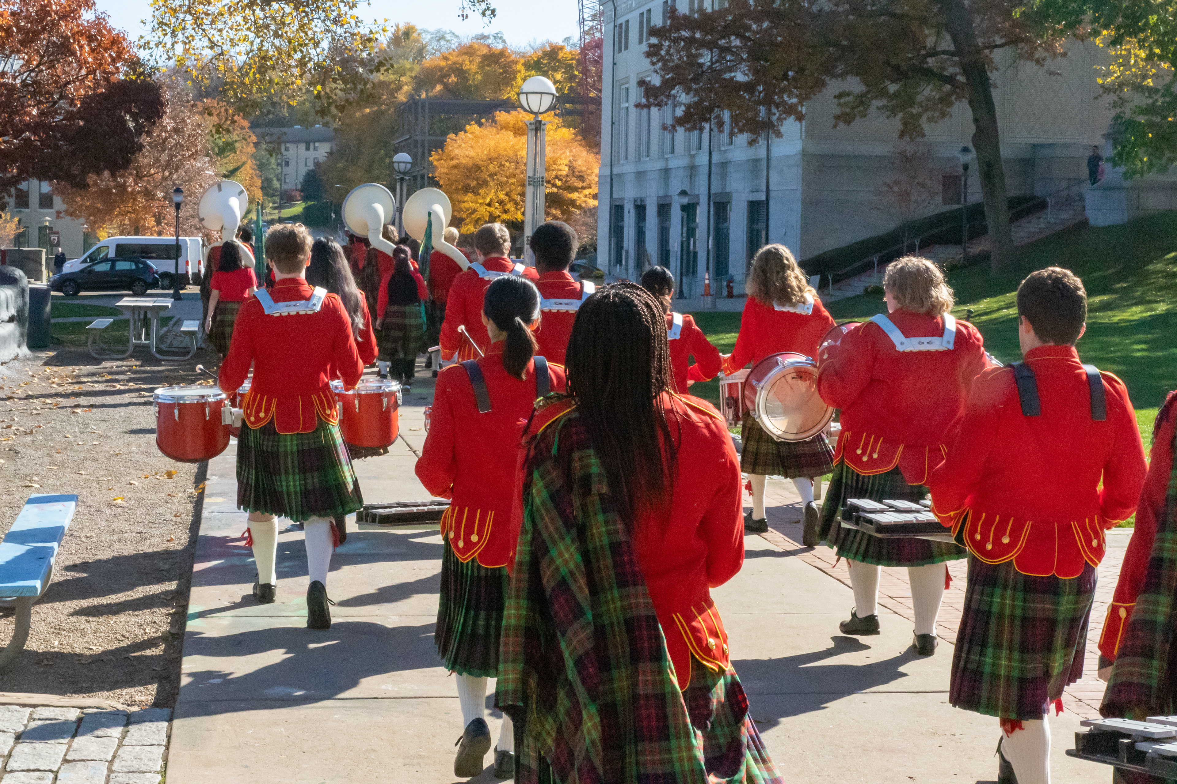 The Kilties march through campus on their way to and from formal pictures and spread homecoming cheer.