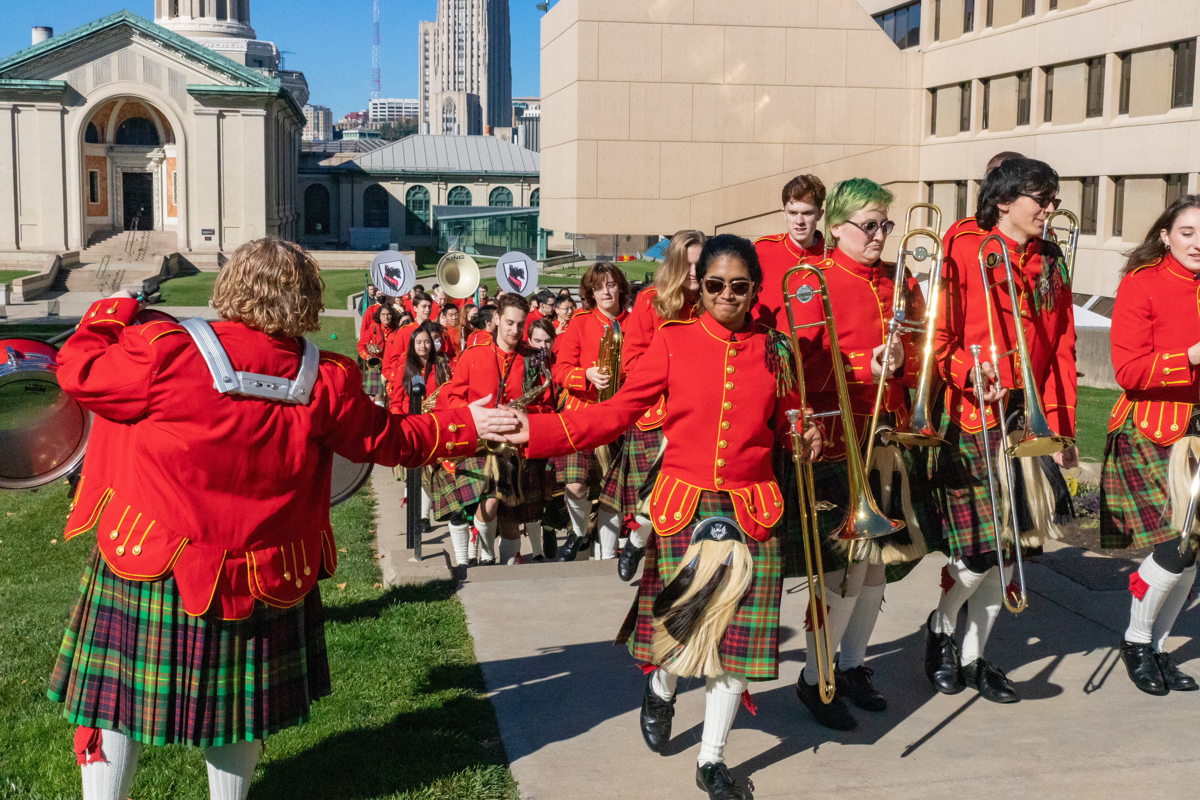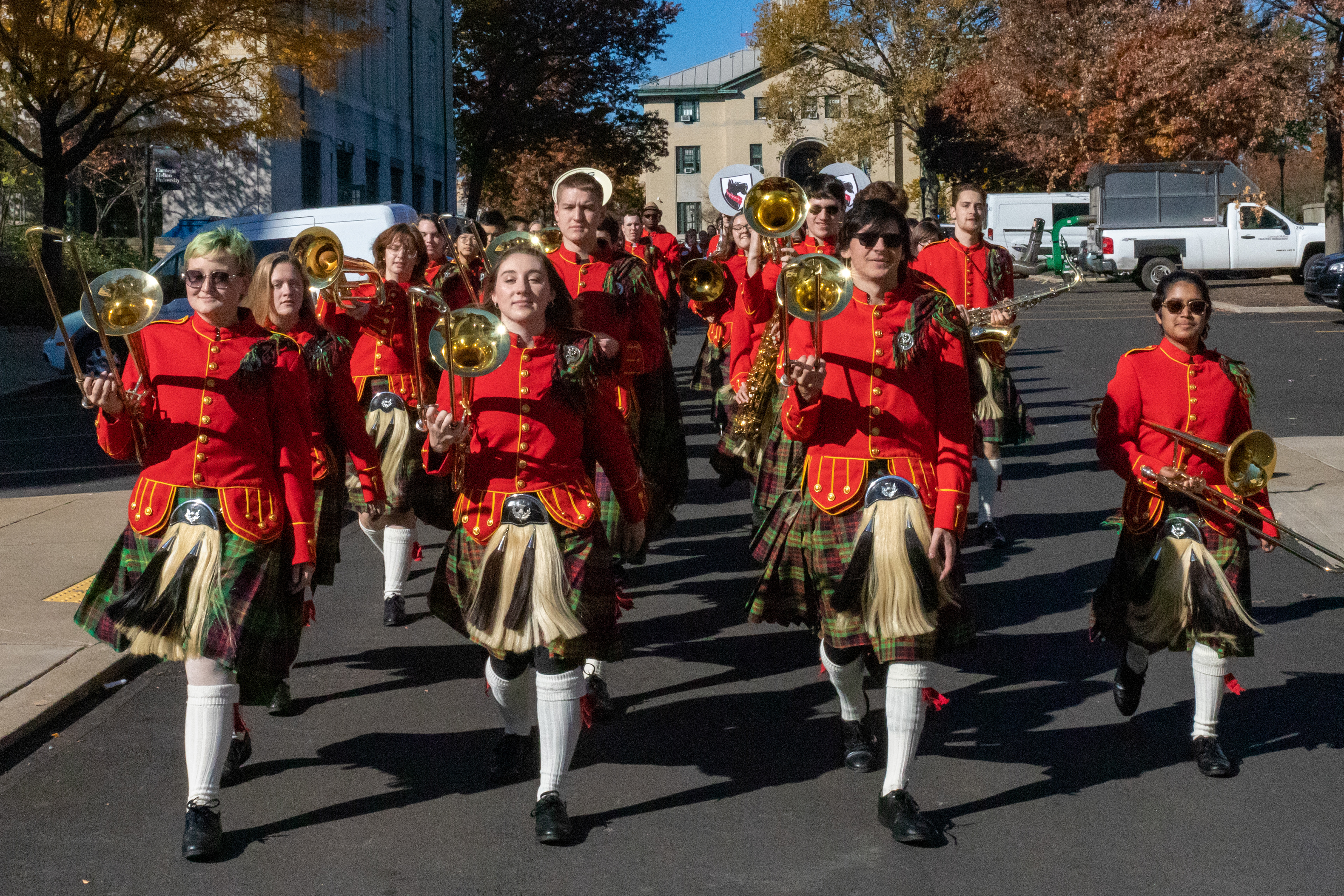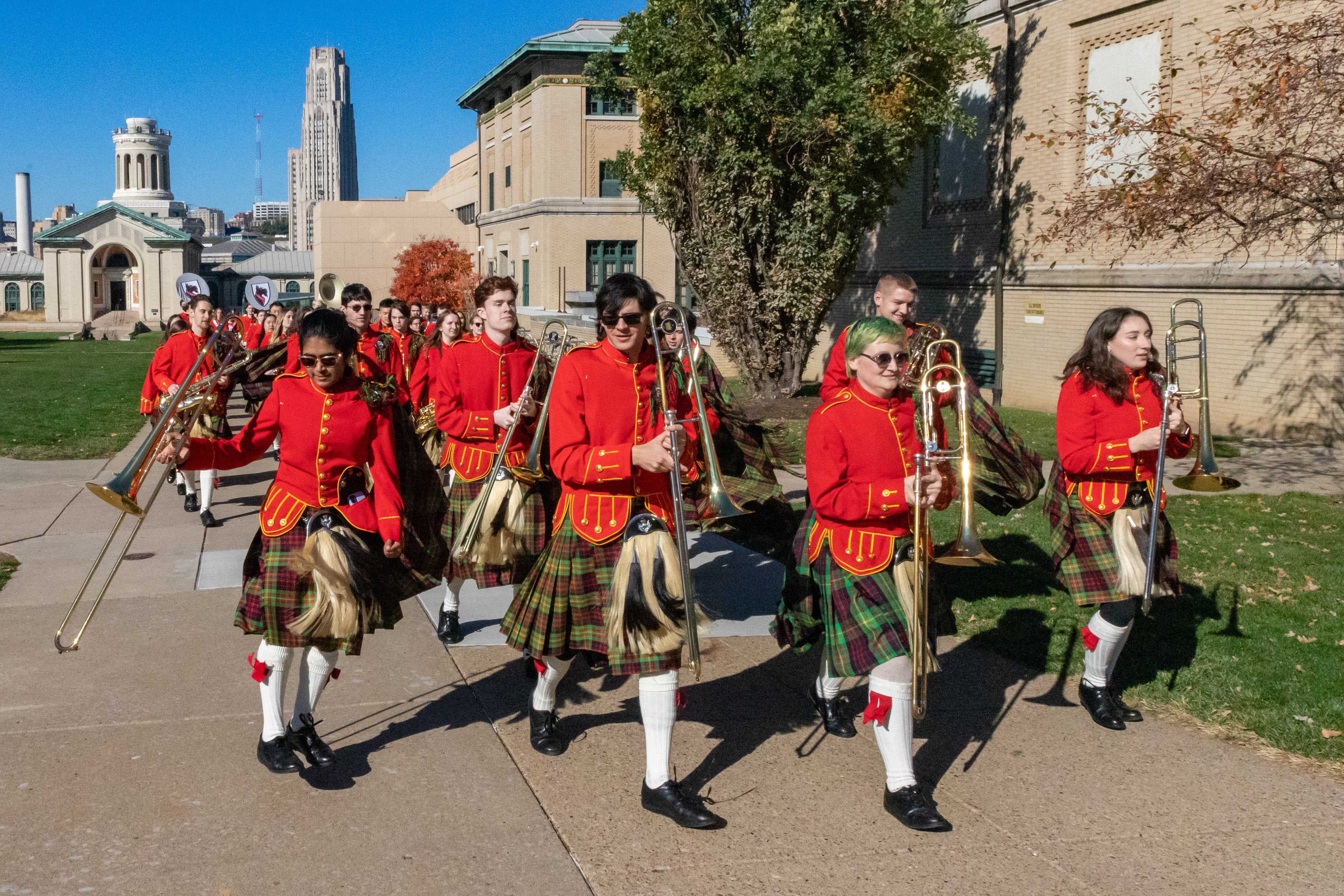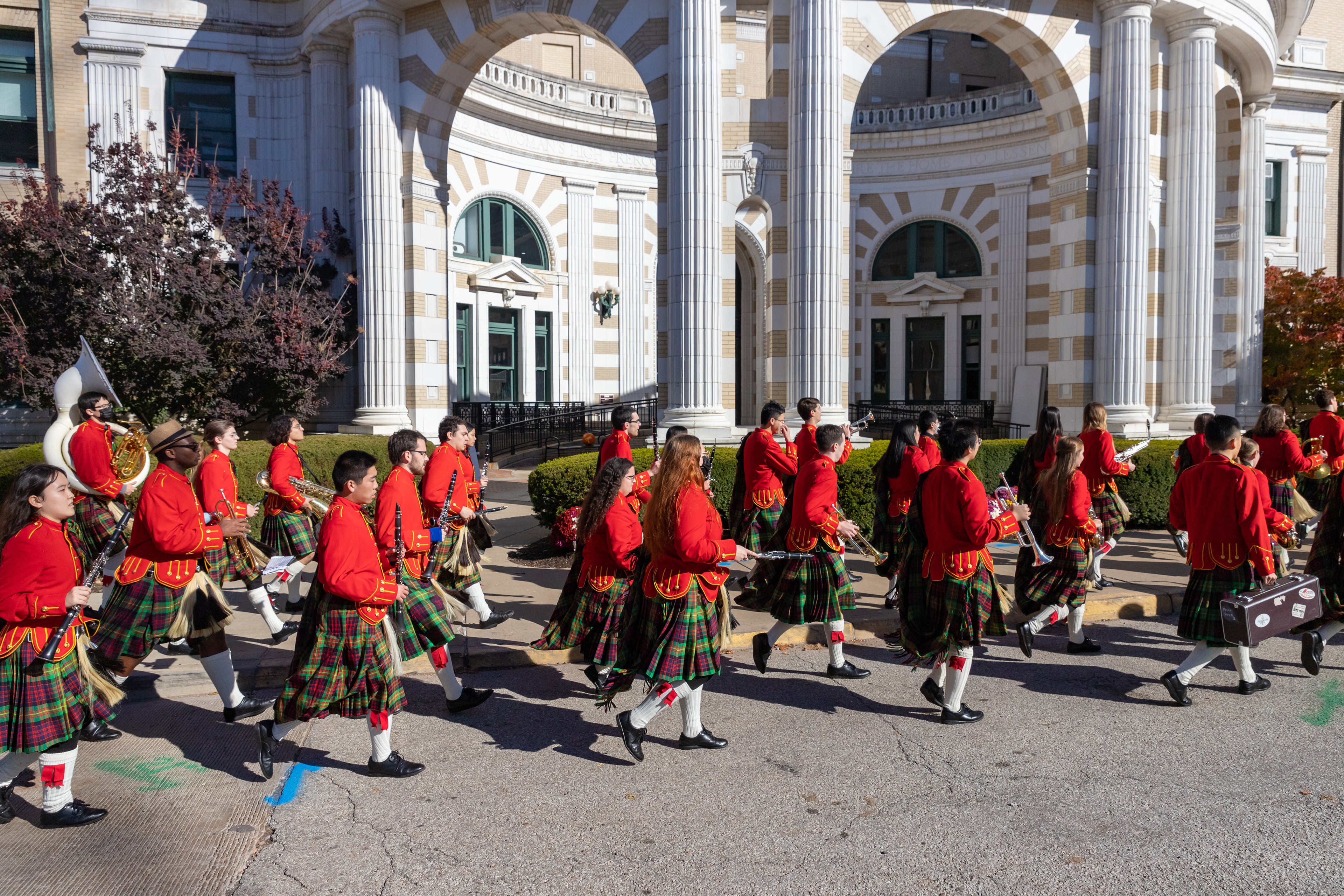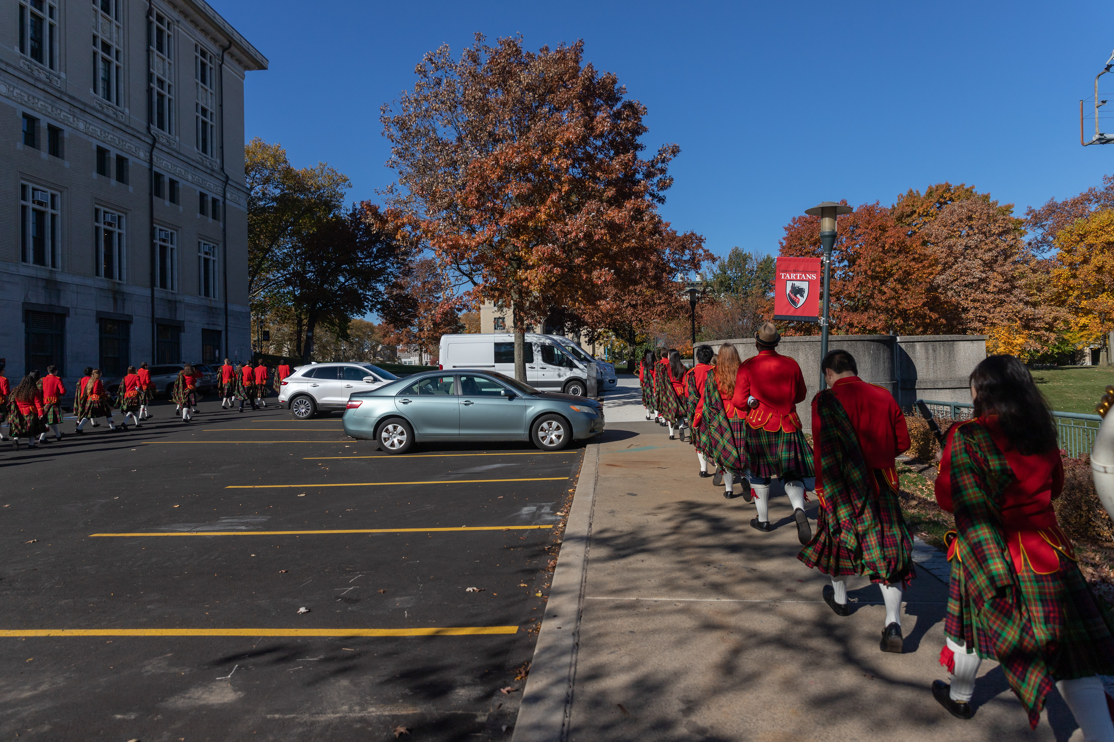 The Kilties march through campus on their way to and from formal pictures and spread homecoming cheer.