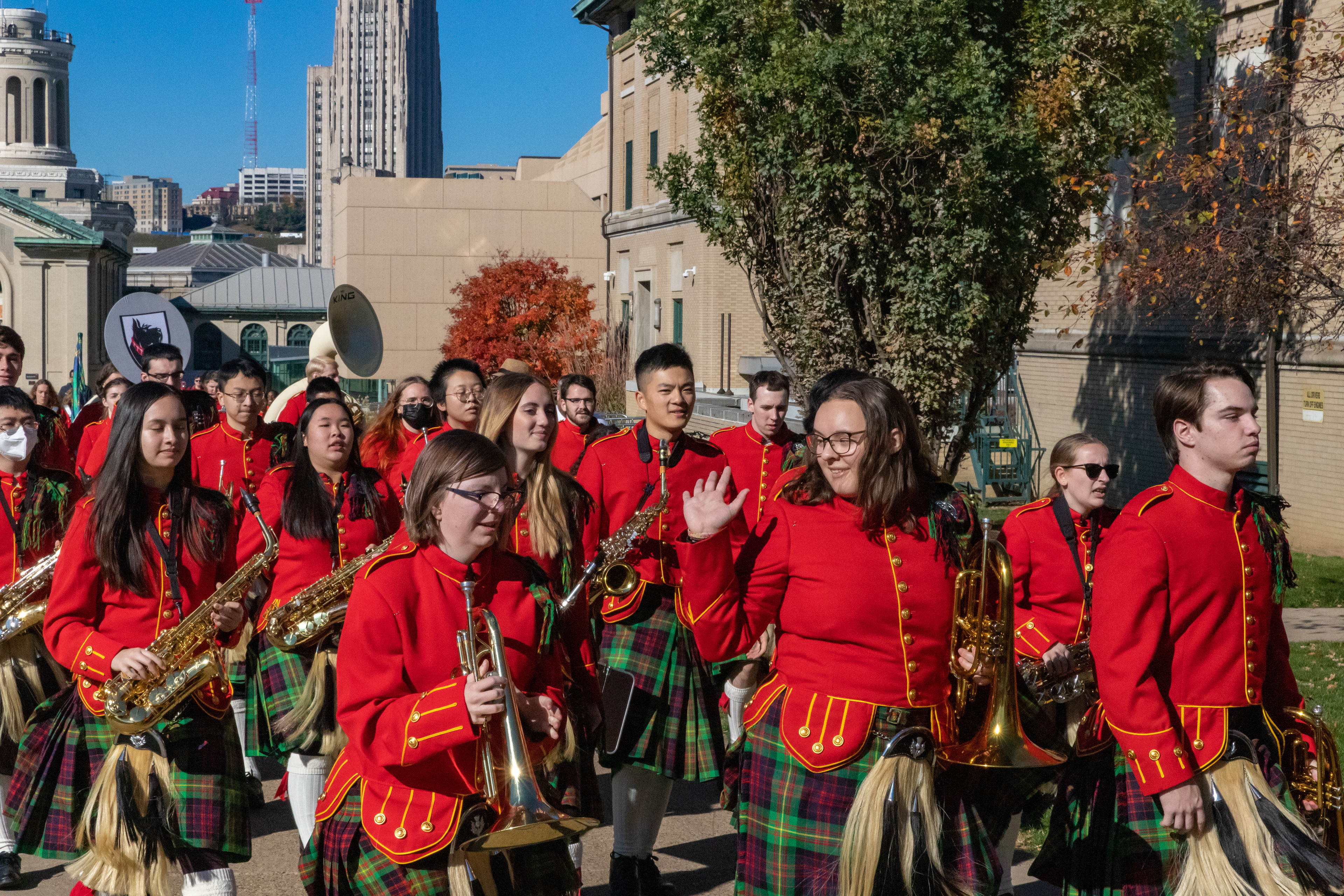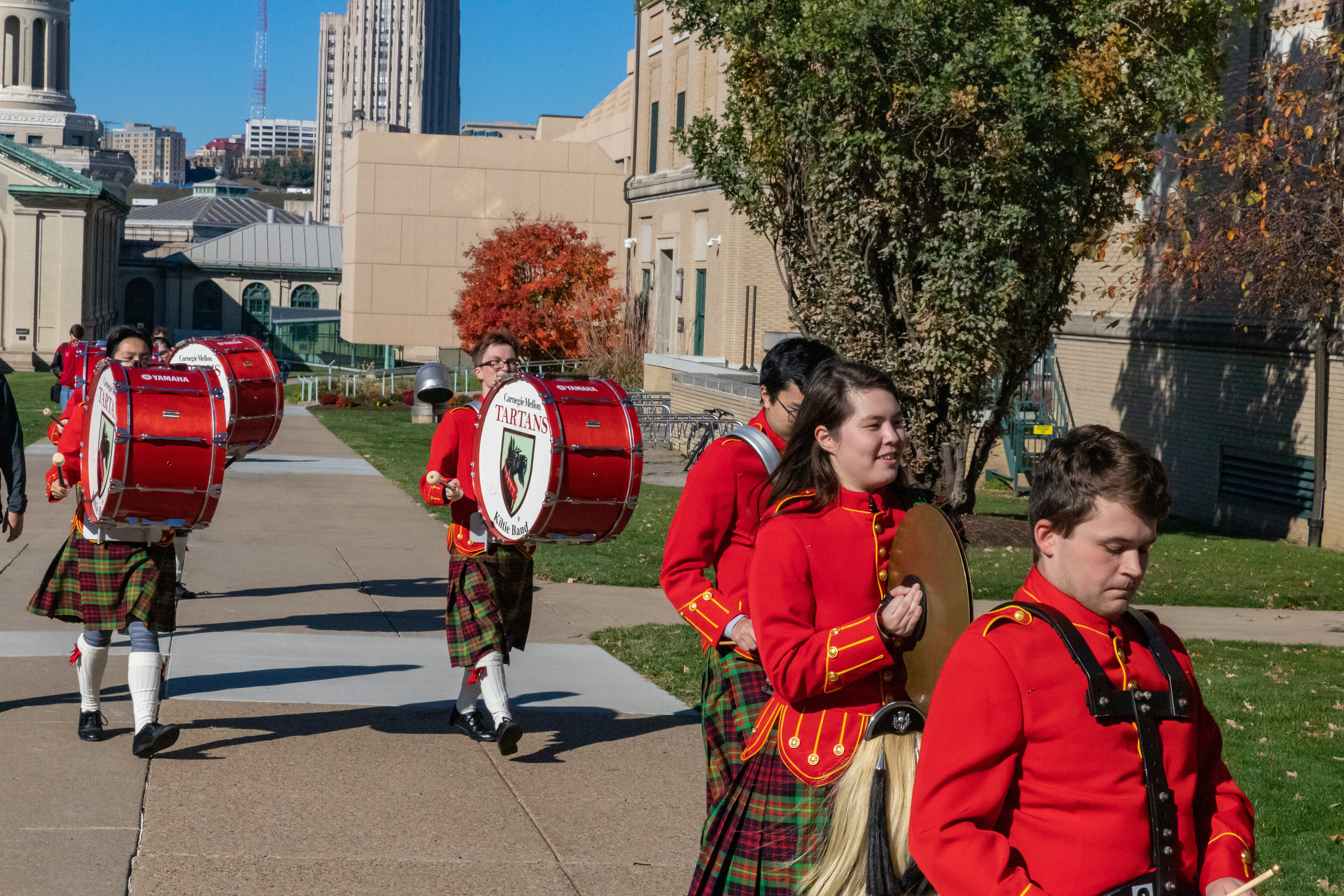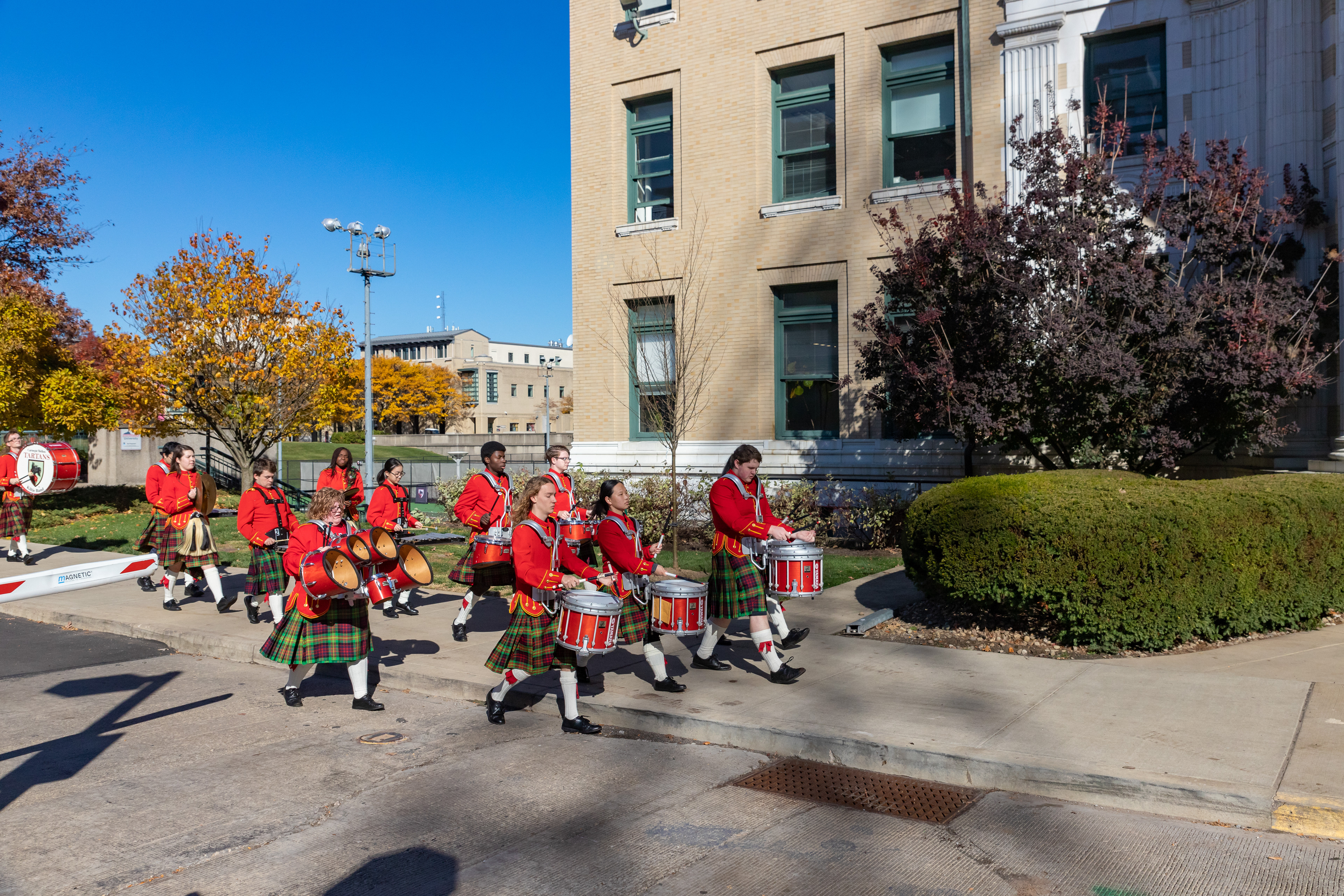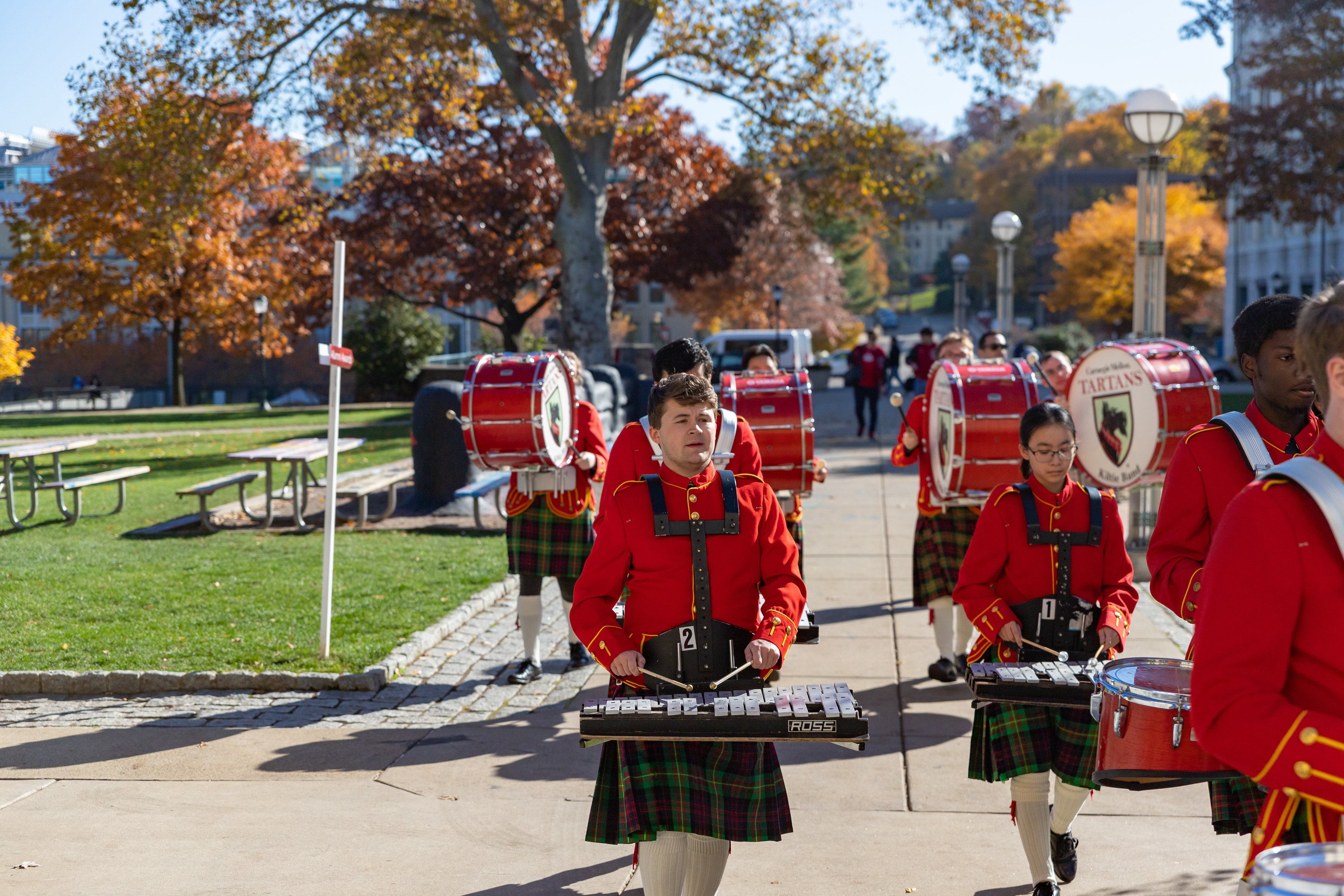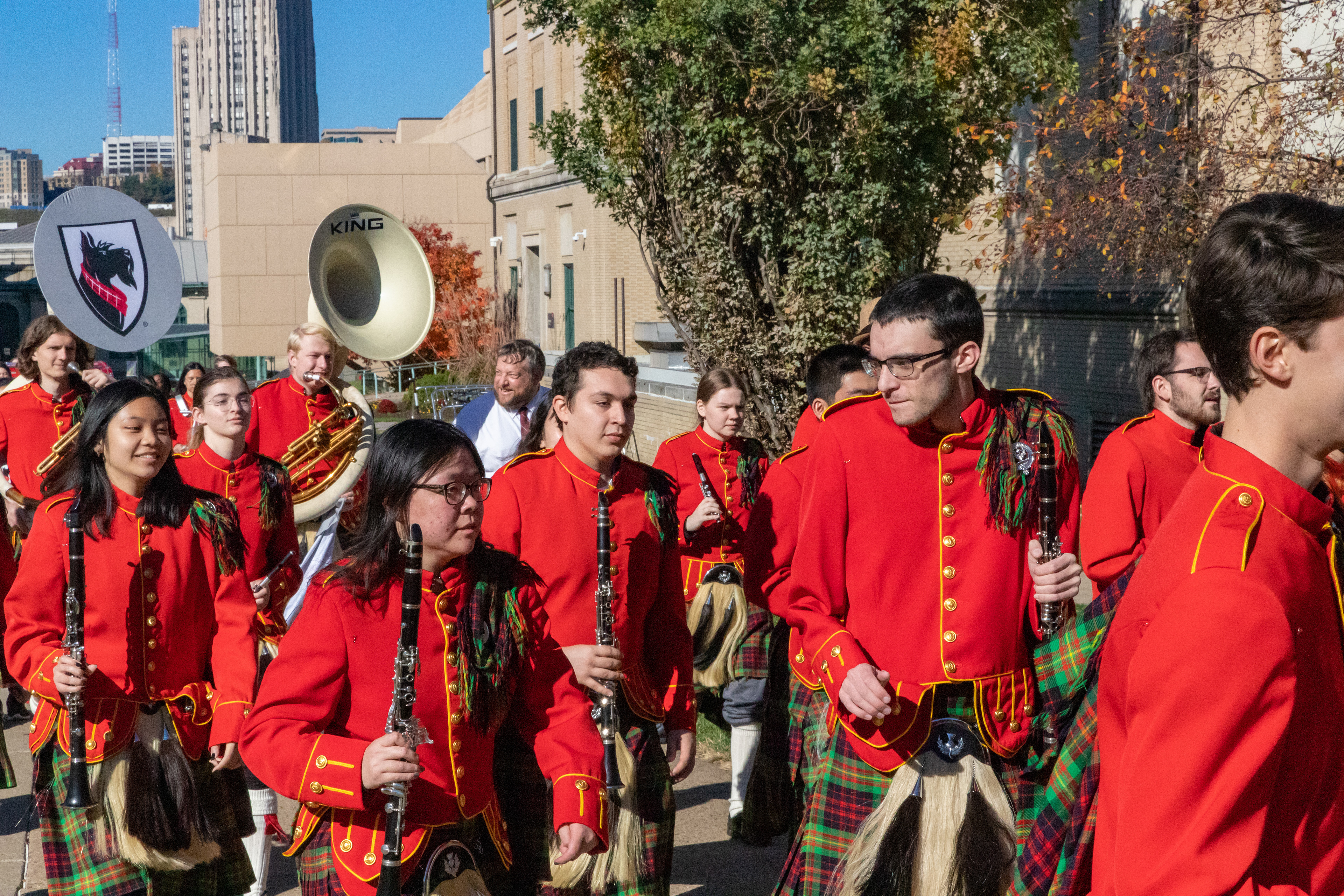The Kilties march through campus on their way to and from formal pictures and spread homecoming cheer.