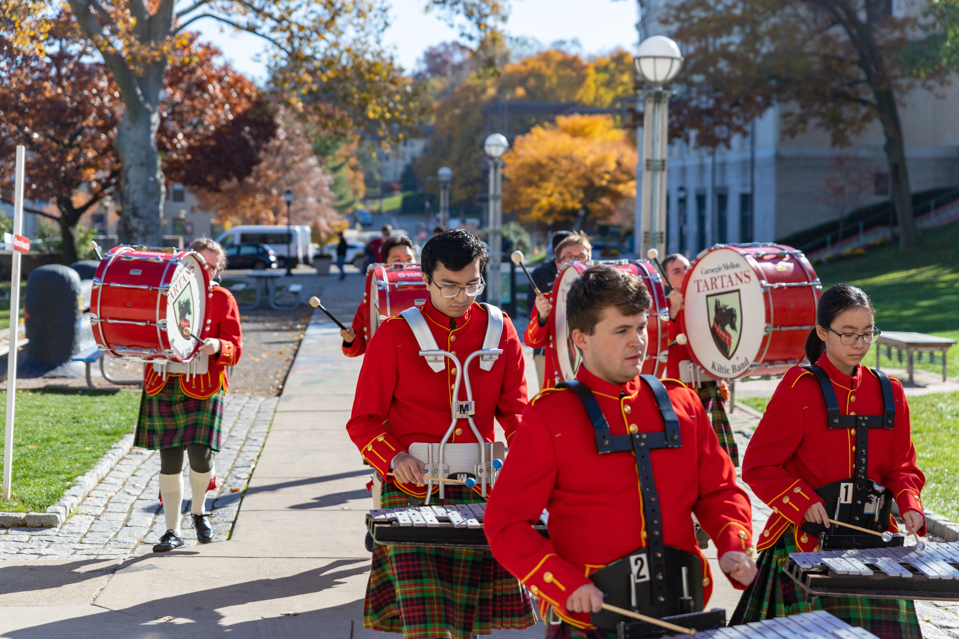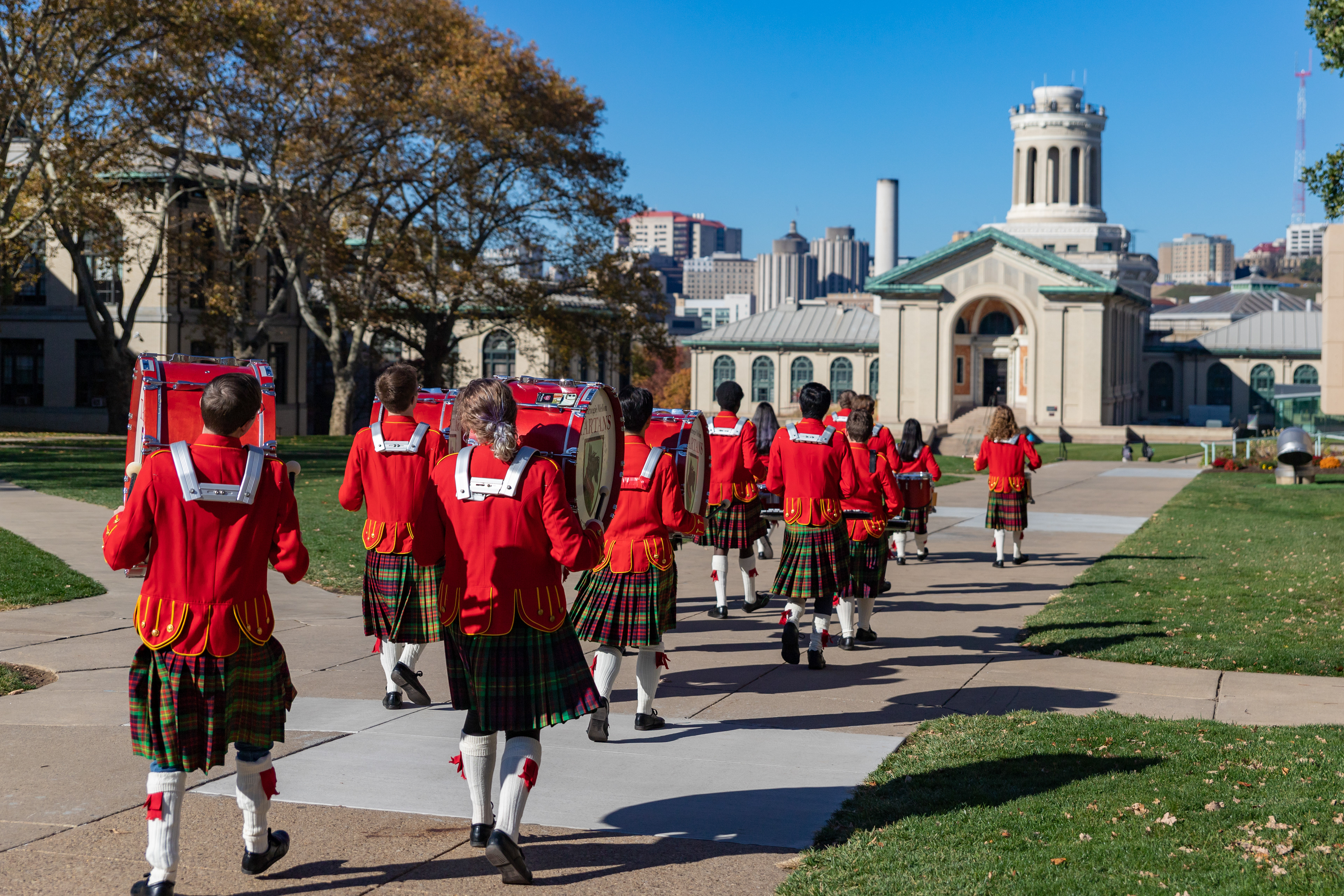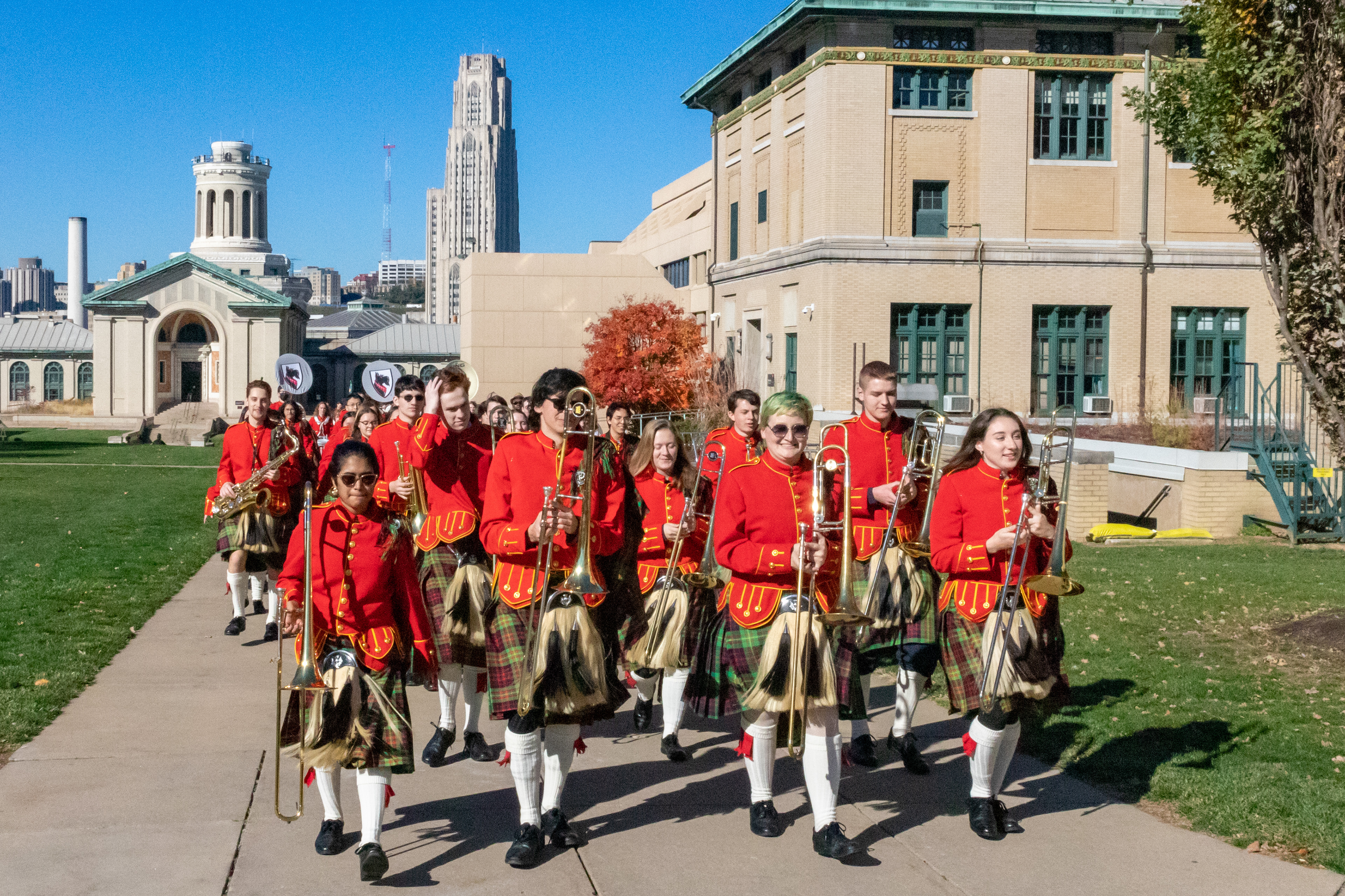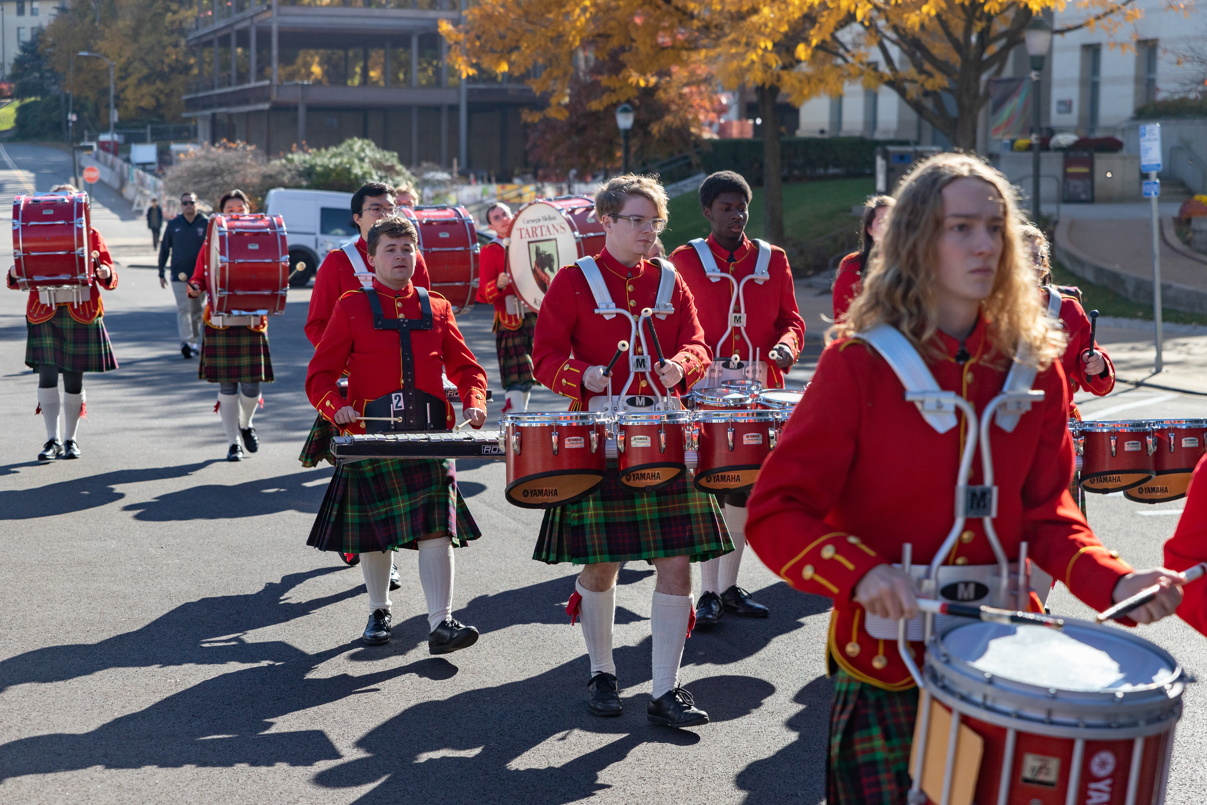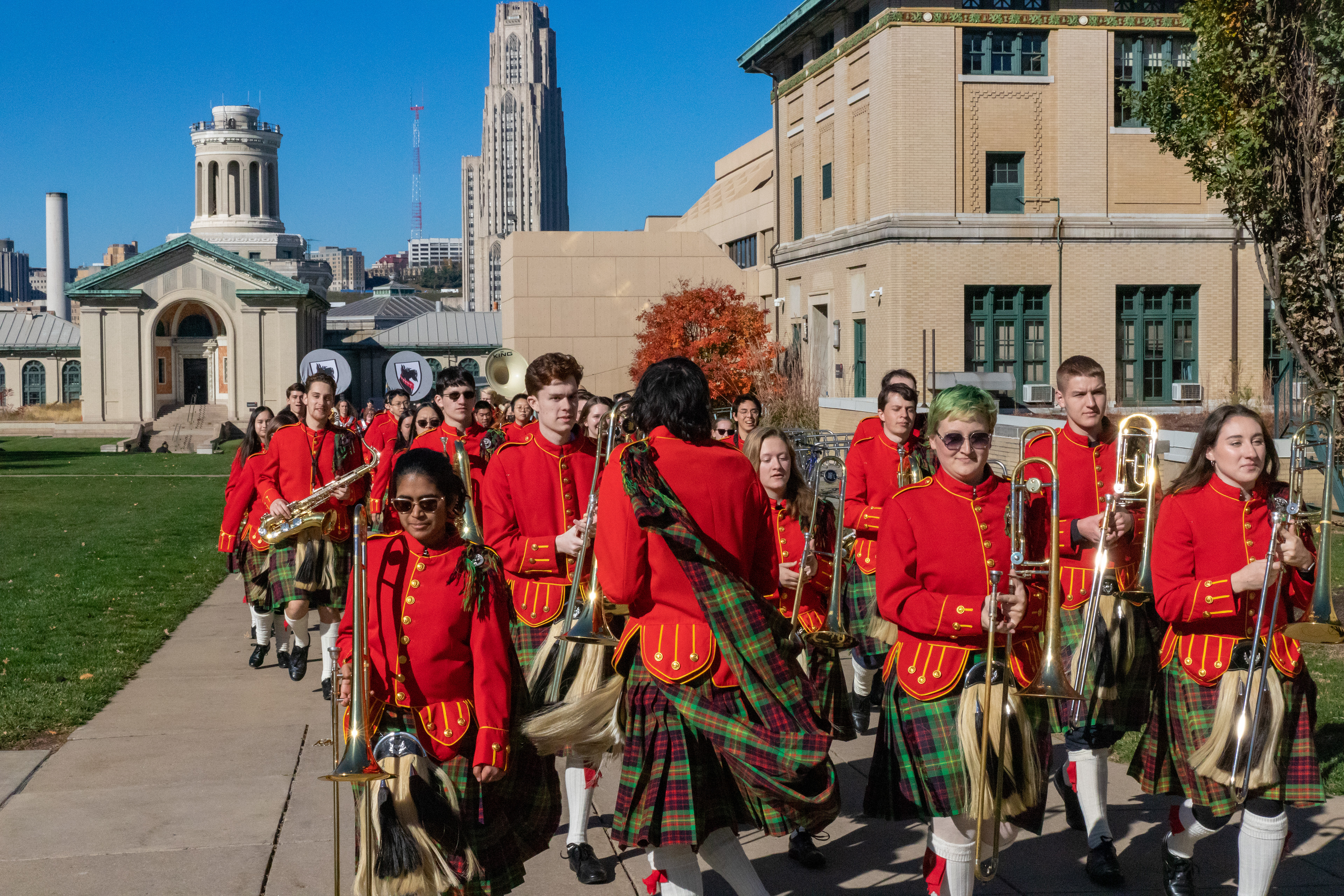 The Kilties march through campus on their way to and from formal pictures and spread homecoming cheer.