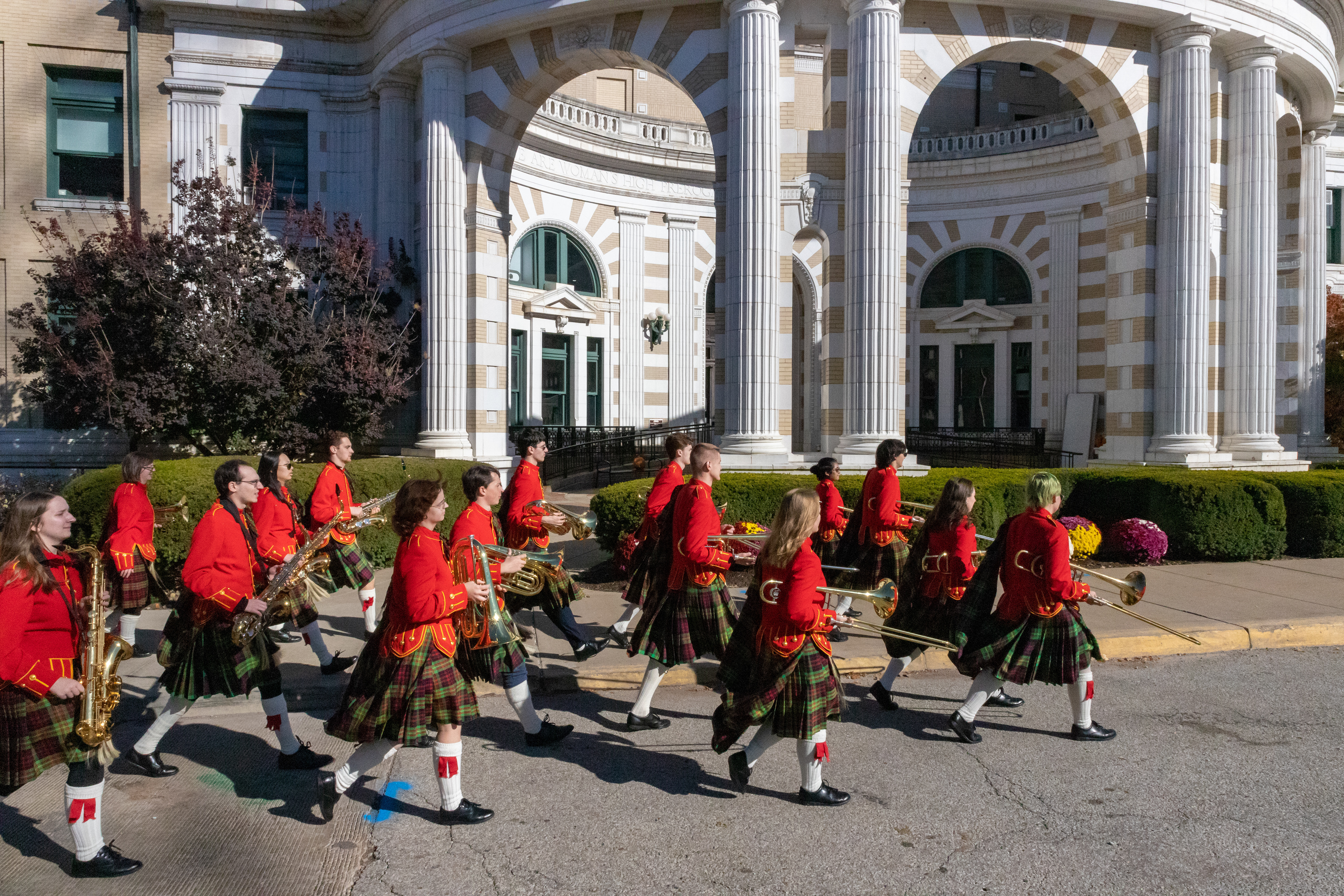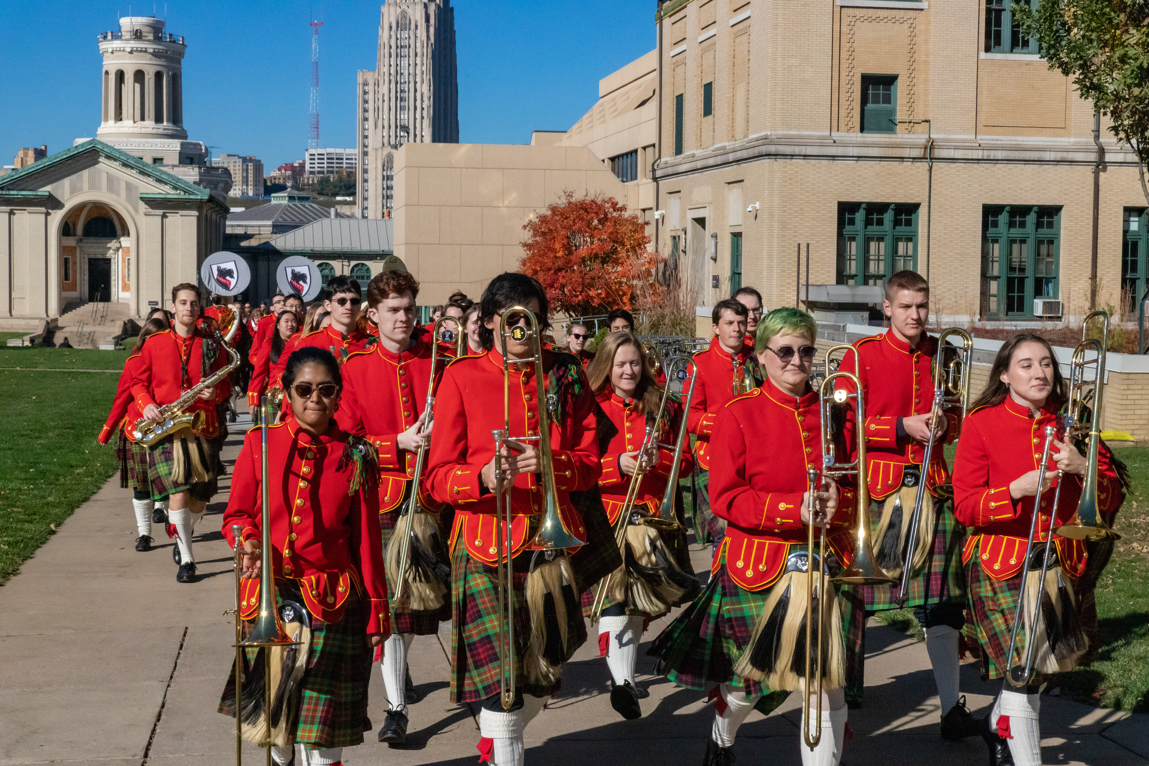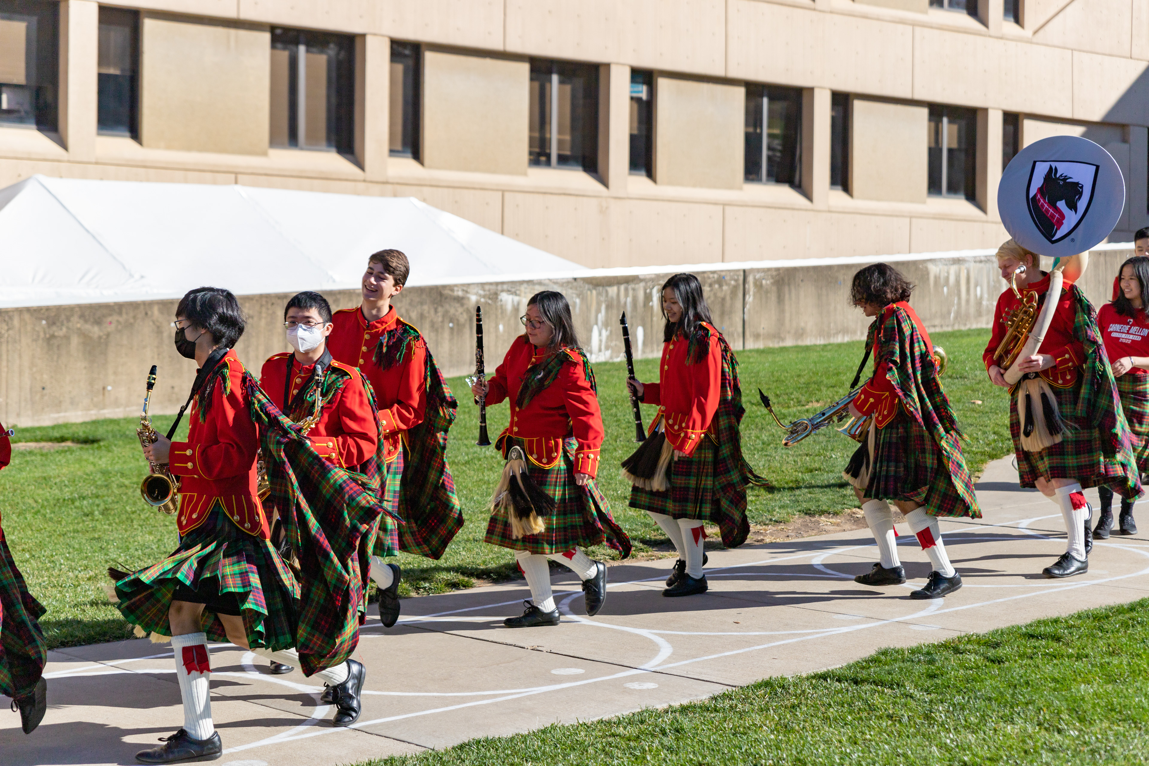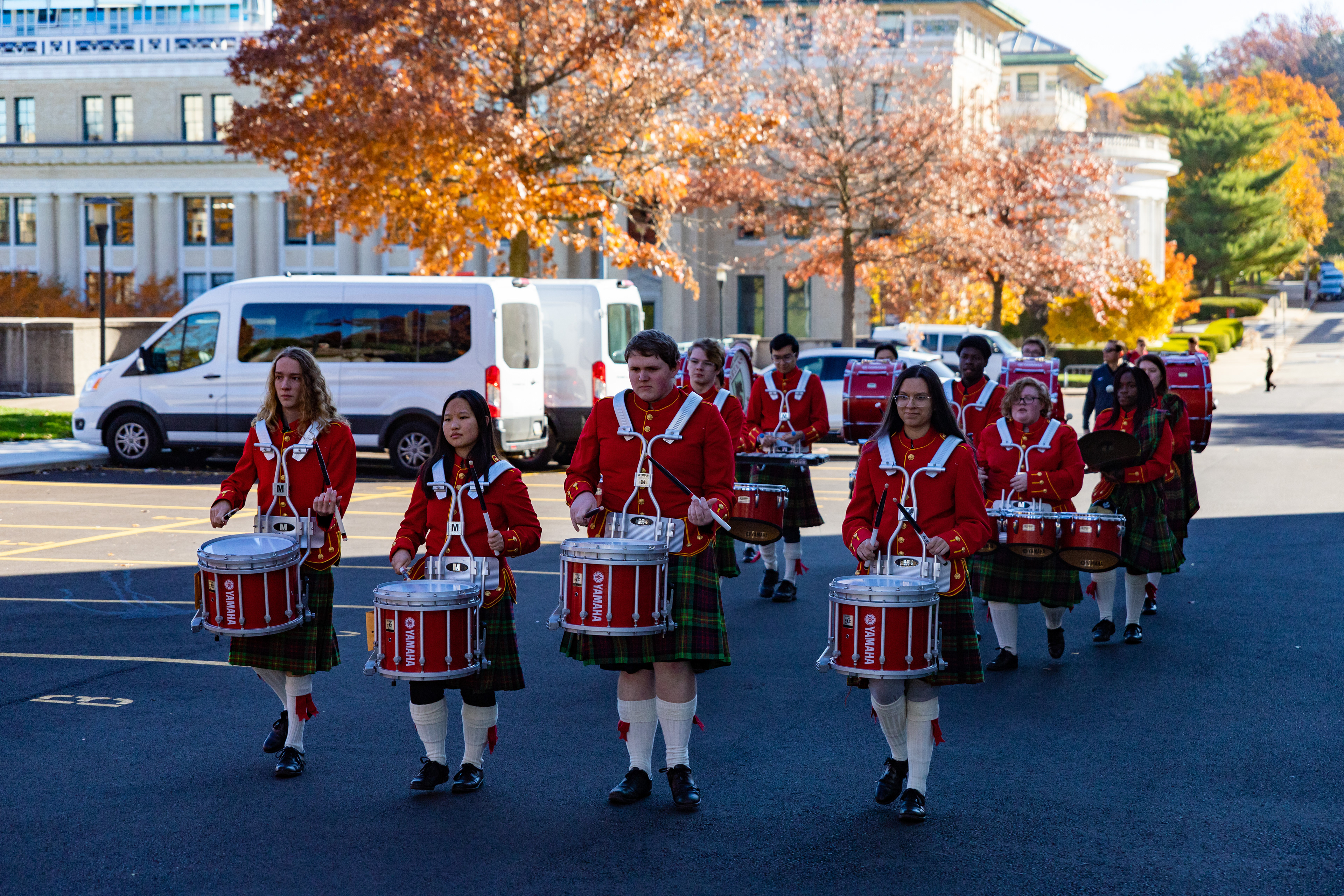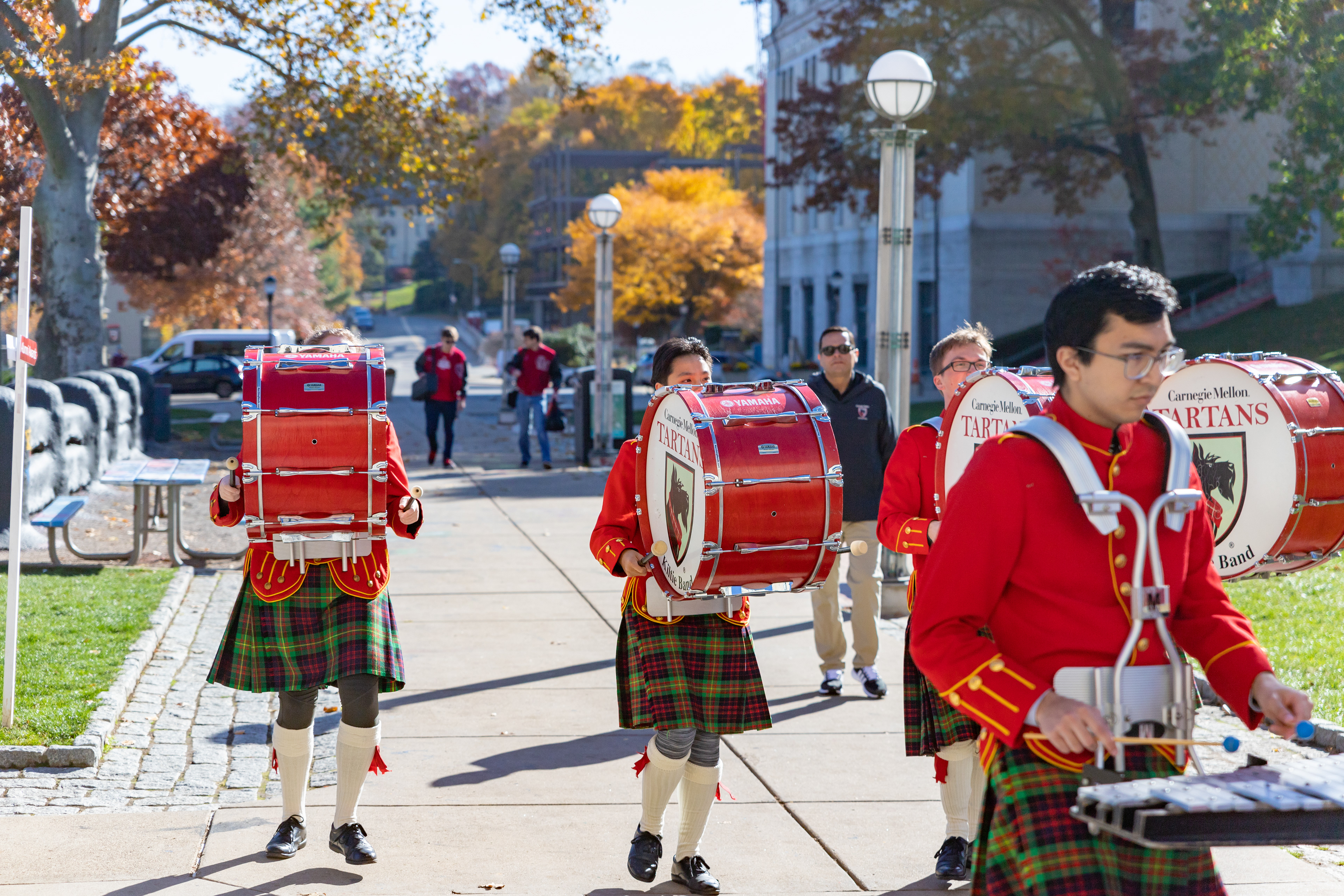 The Kilties march through campus on their way to and from formal pictures and spread homecoming cheer.
