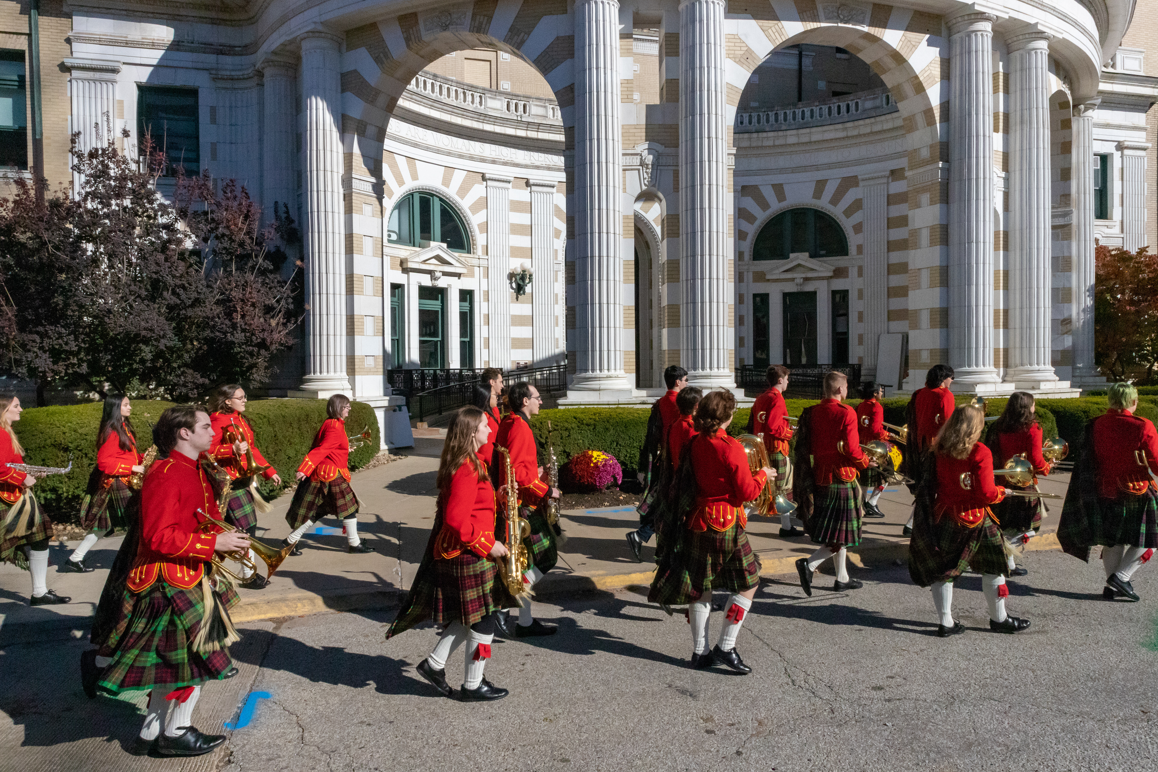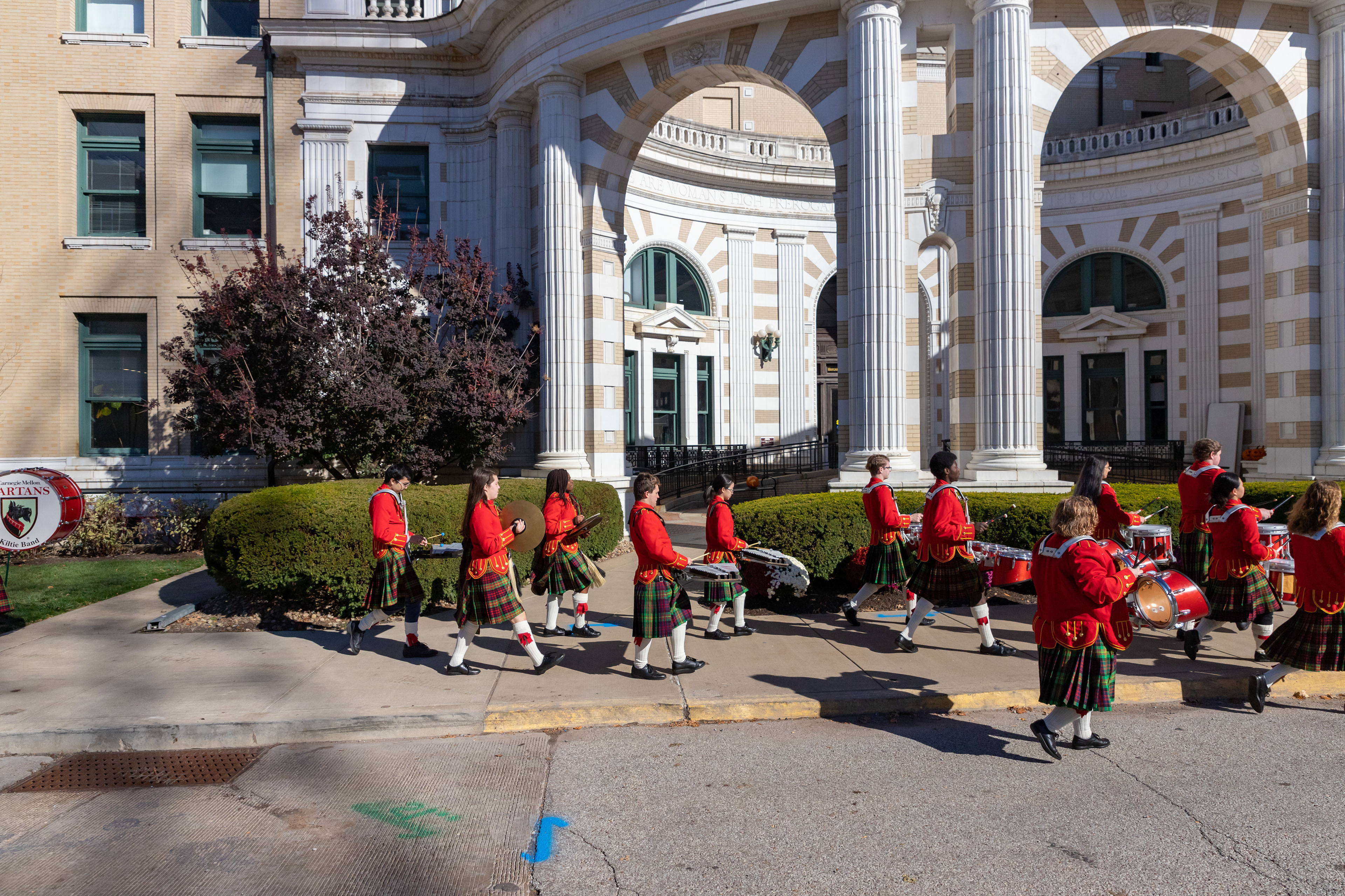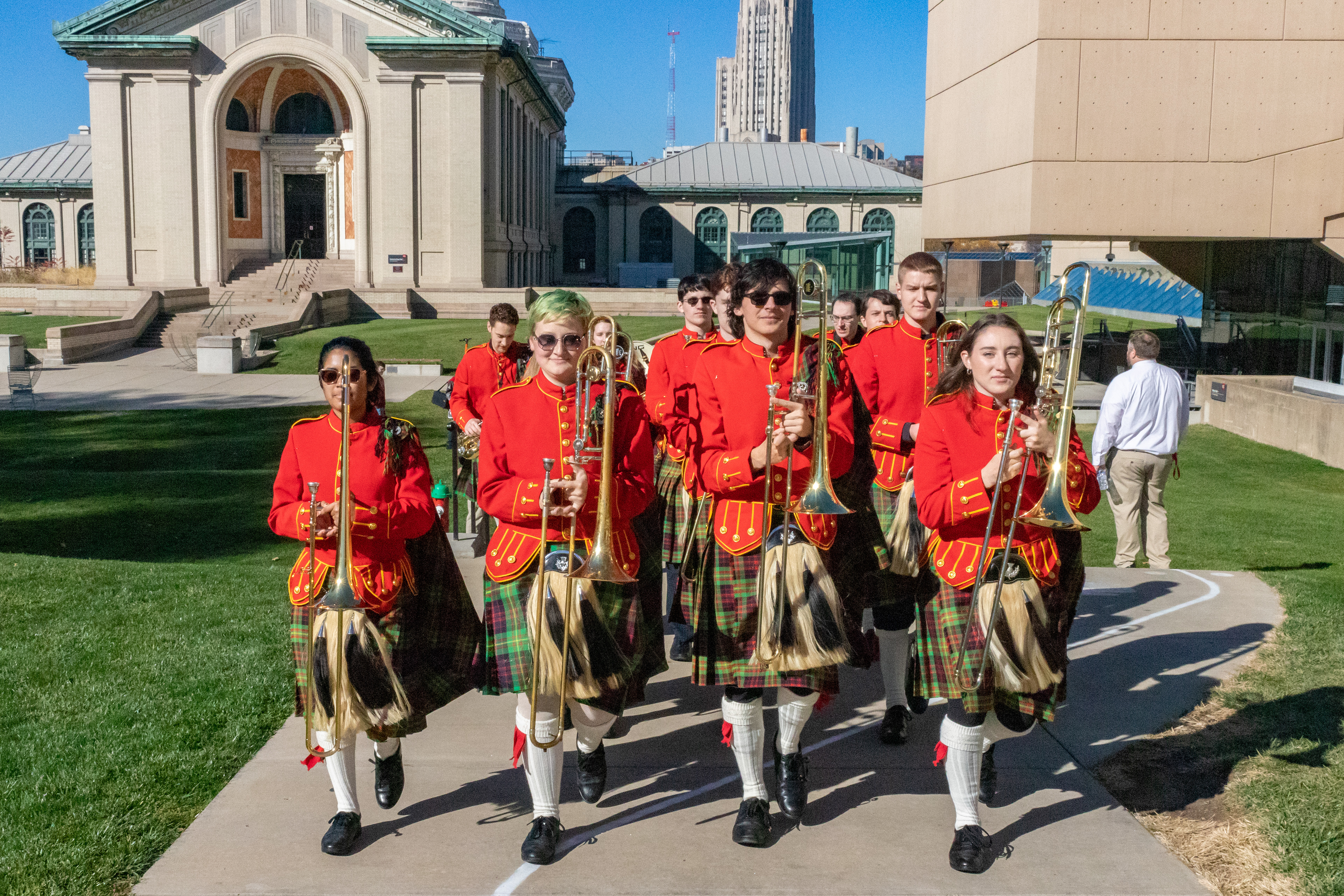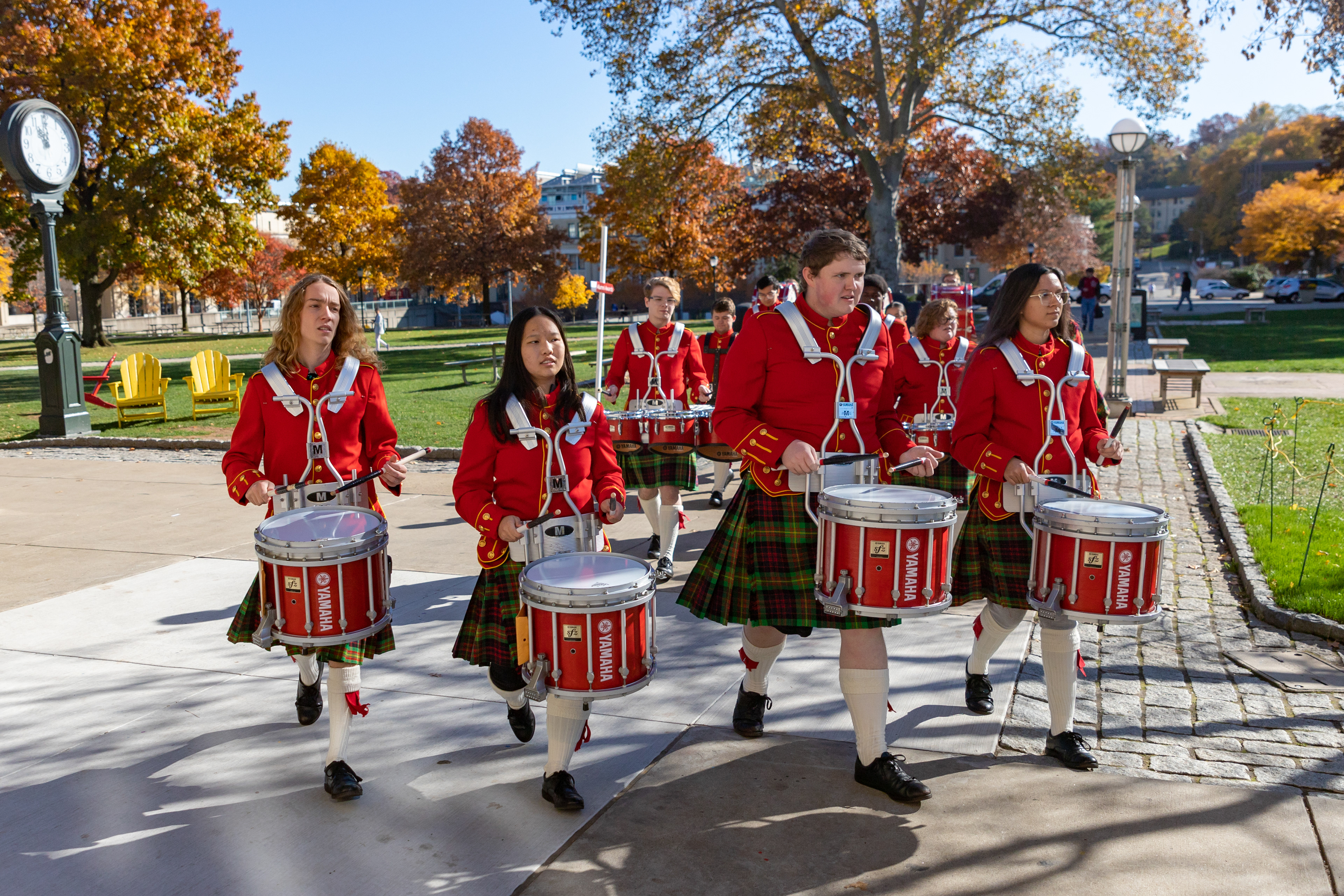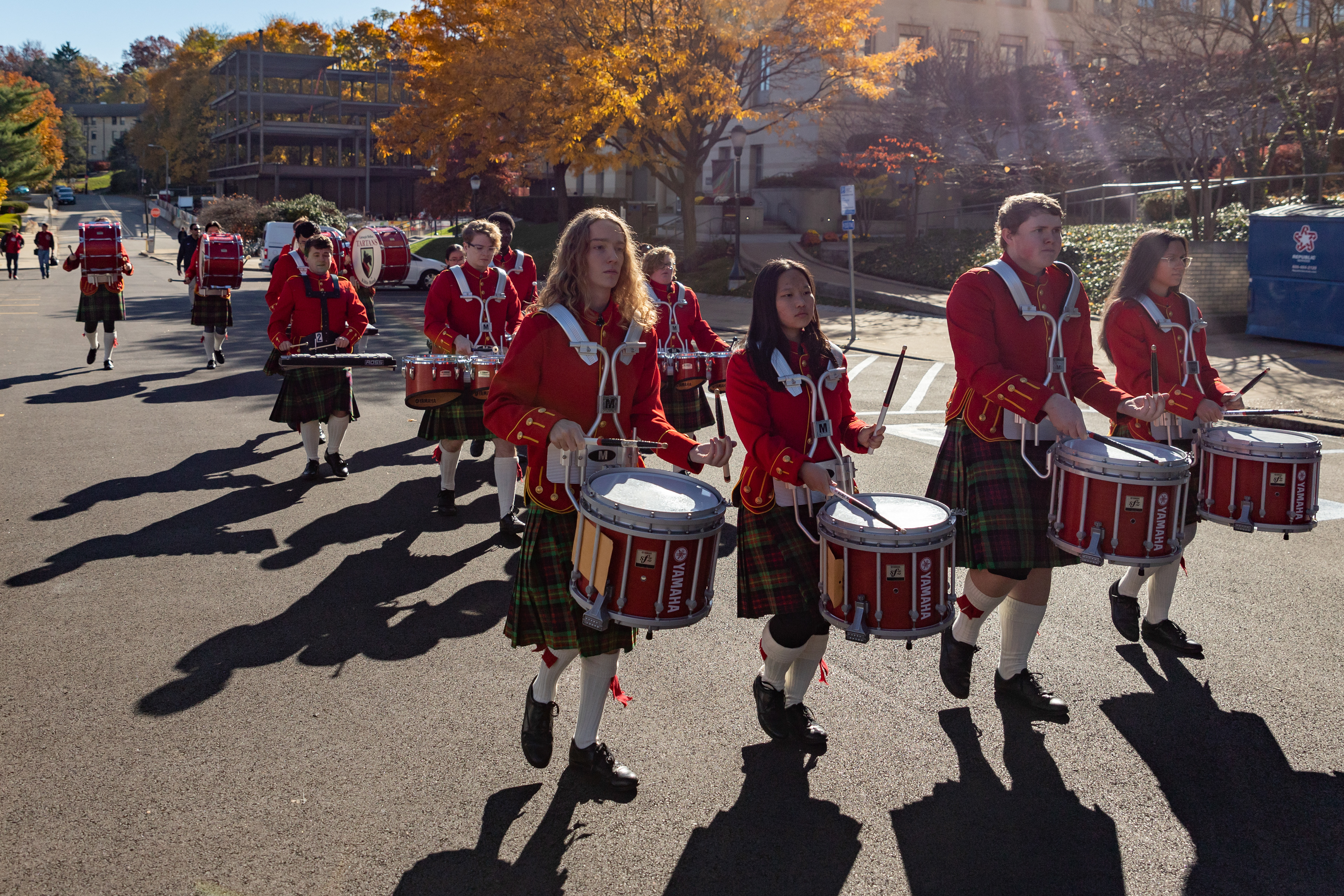The Kilties march through campus on their way to and from formal pictures and spread homecoming cheer.
