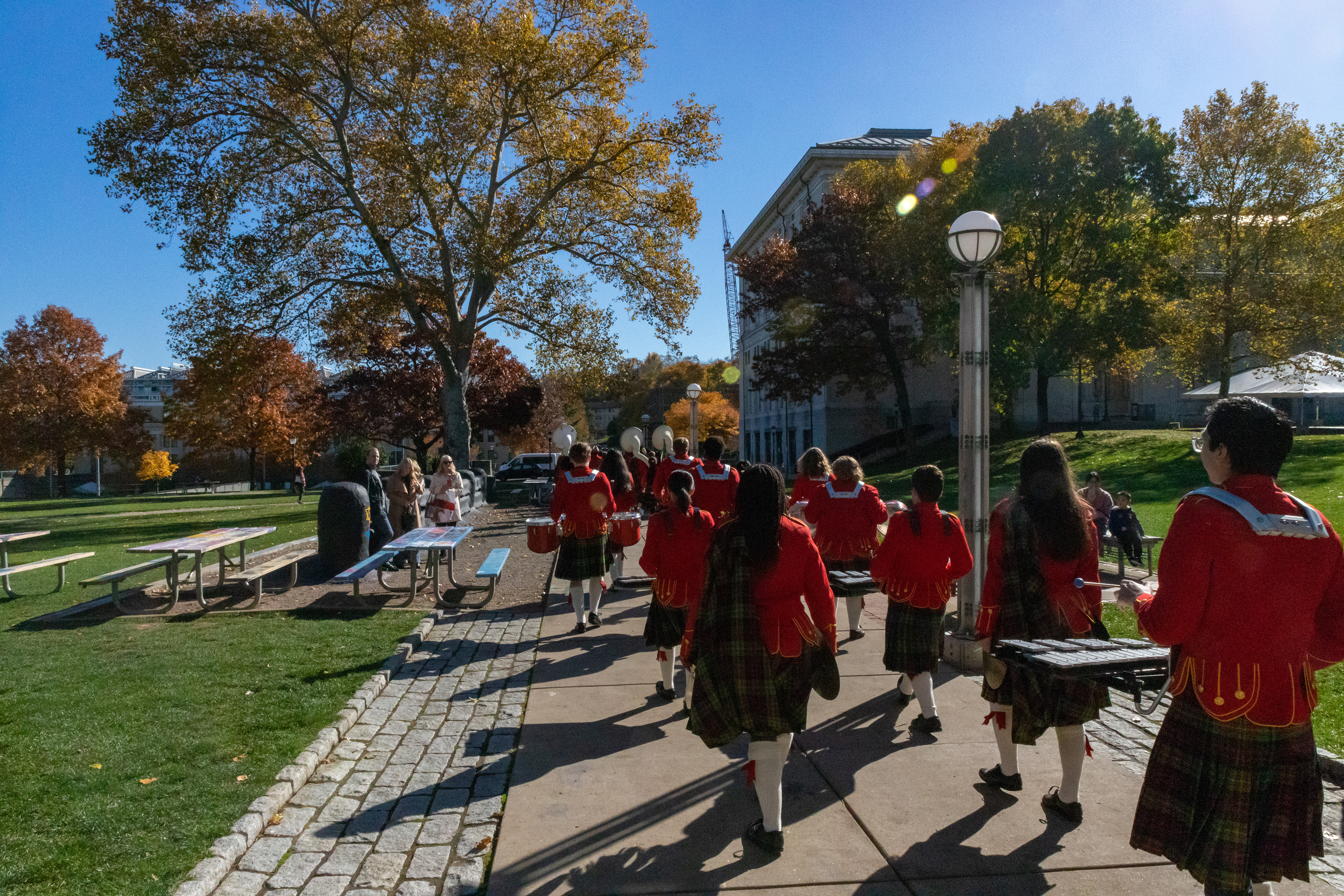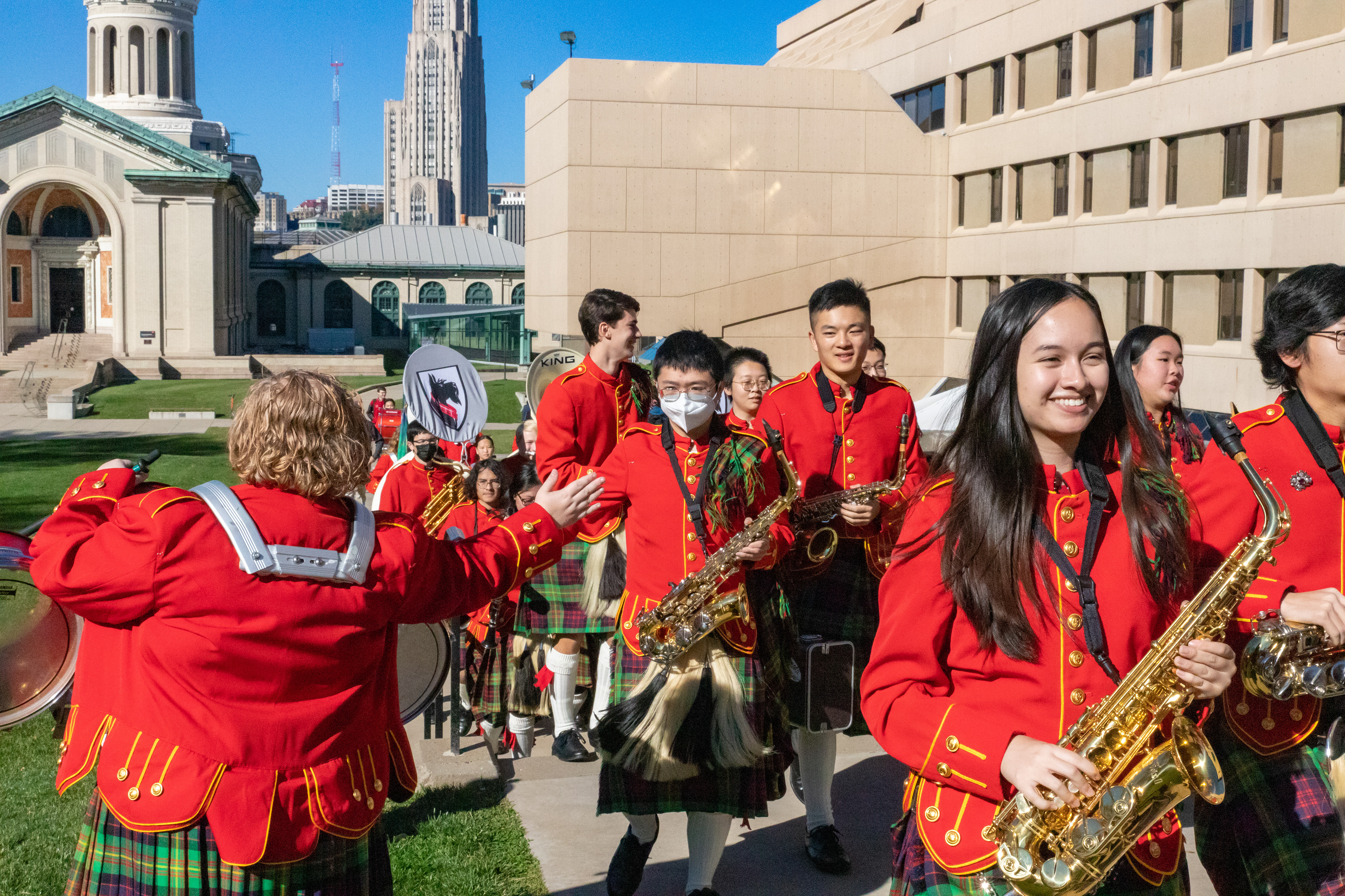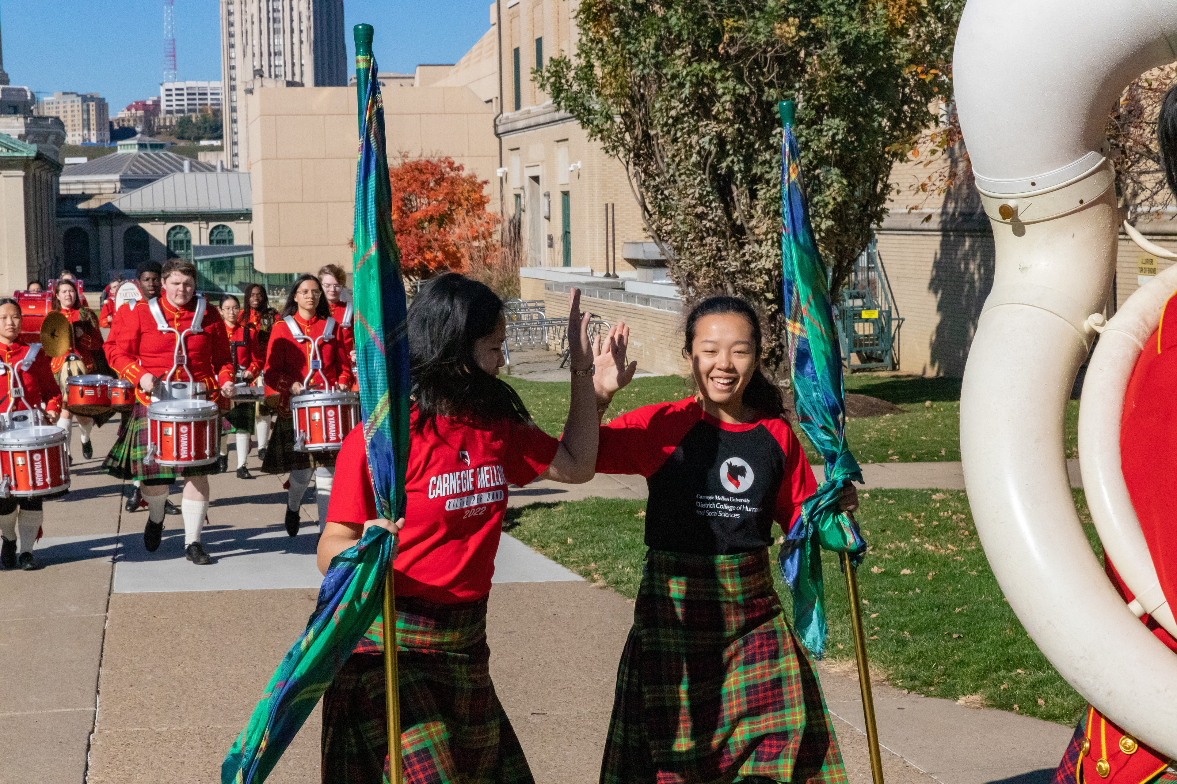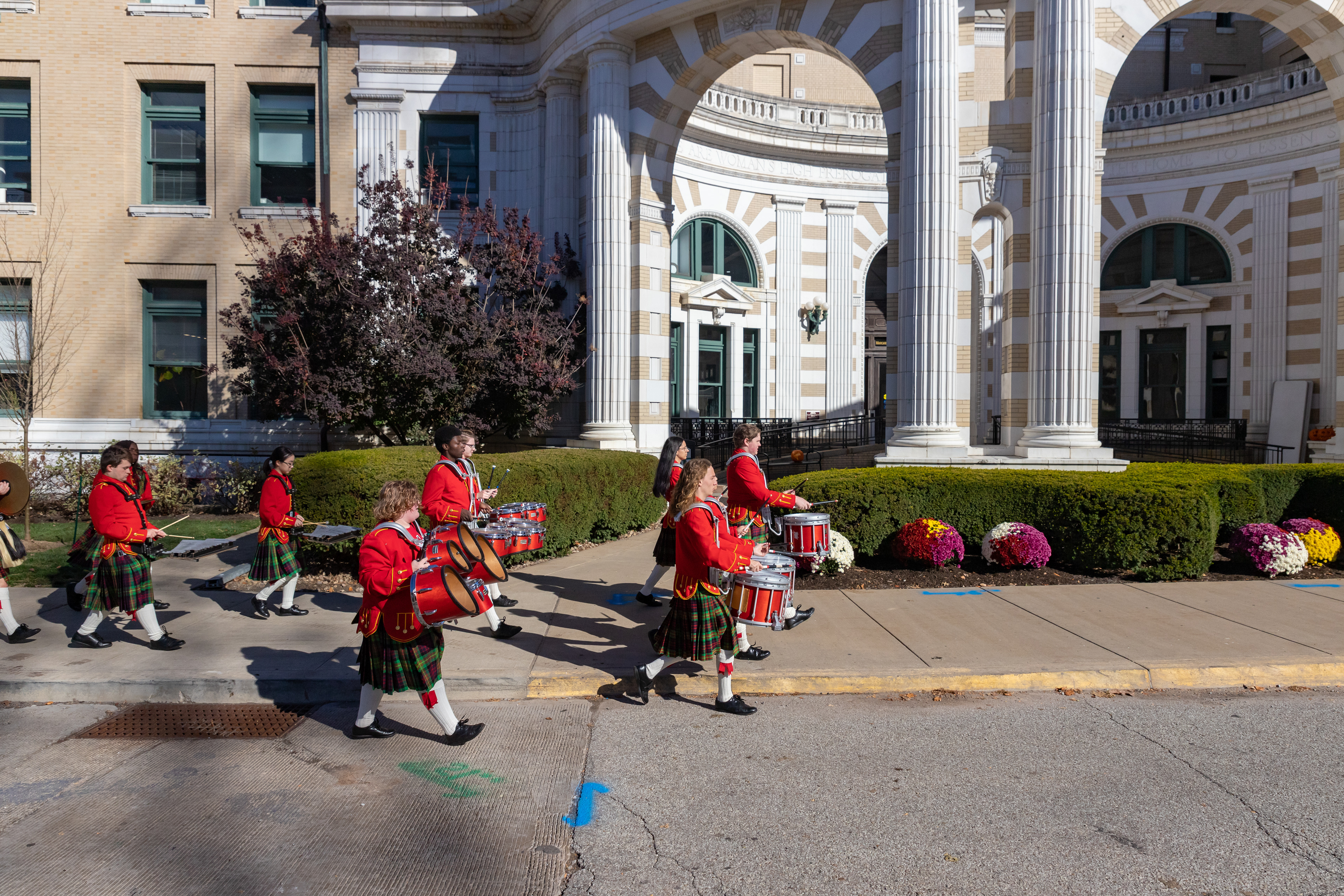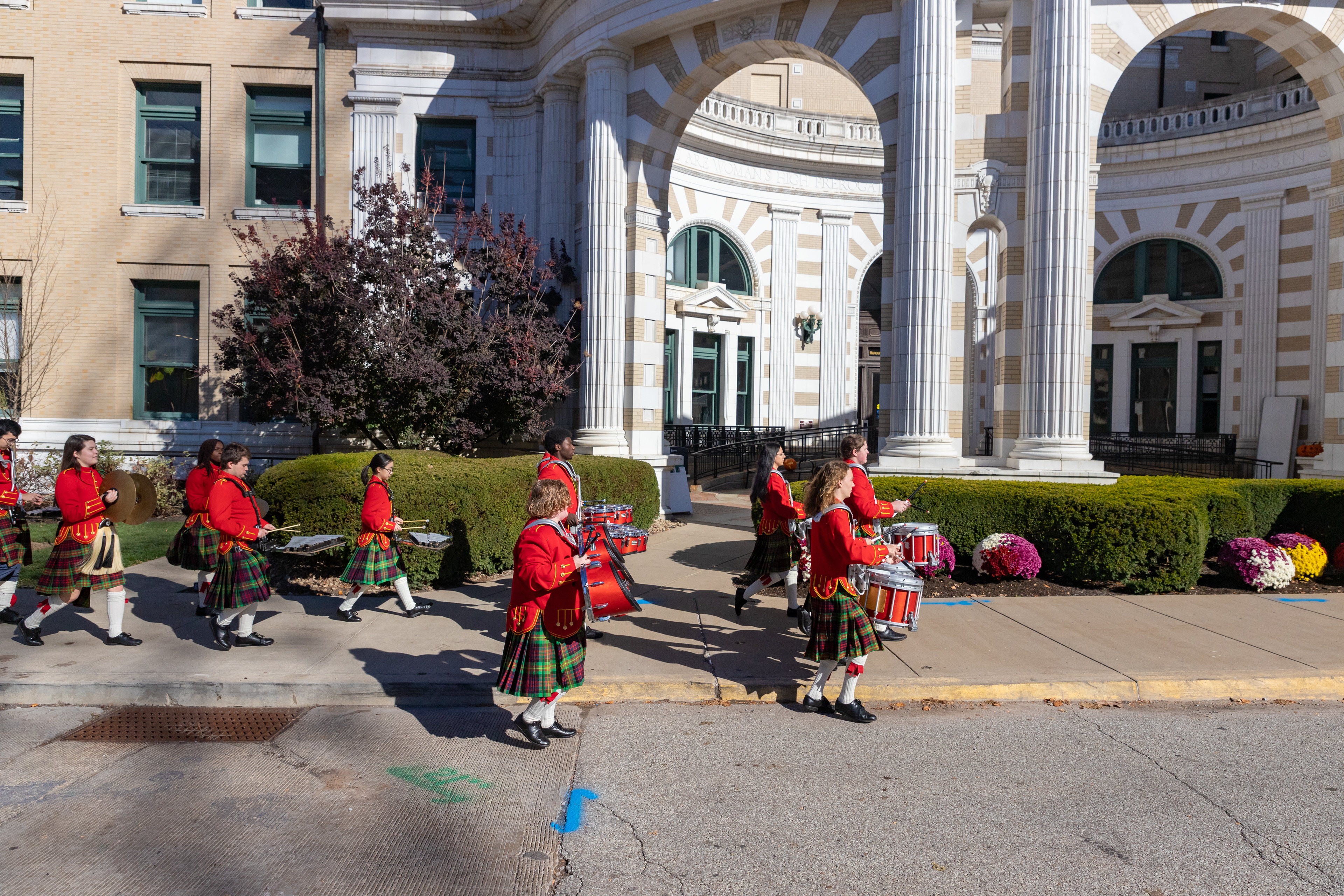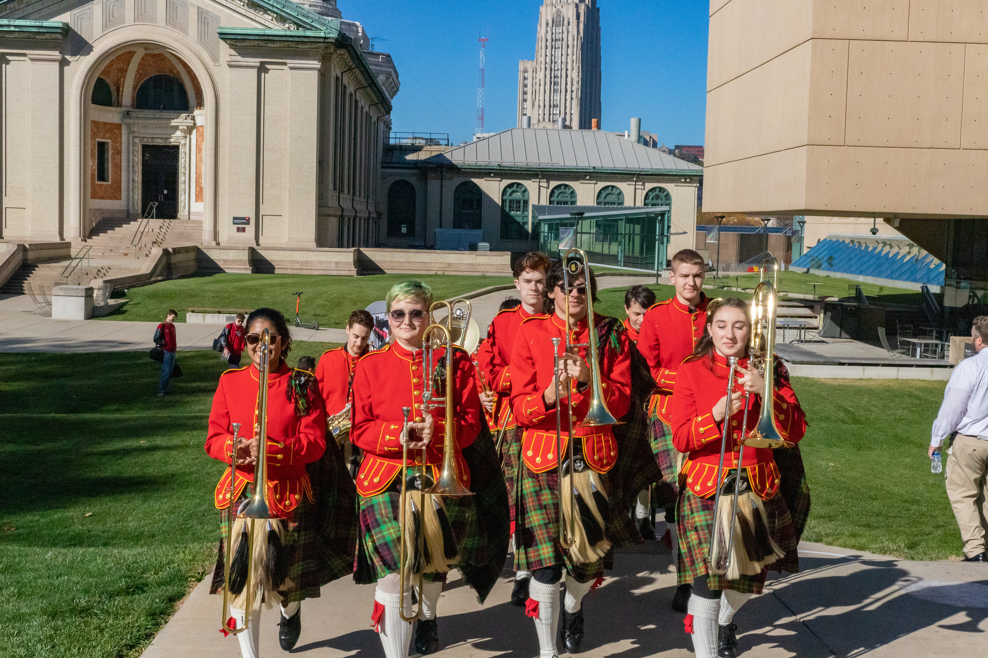 The Kilties march through campus on their way to and from formal pictures and spread homecoming cheer.