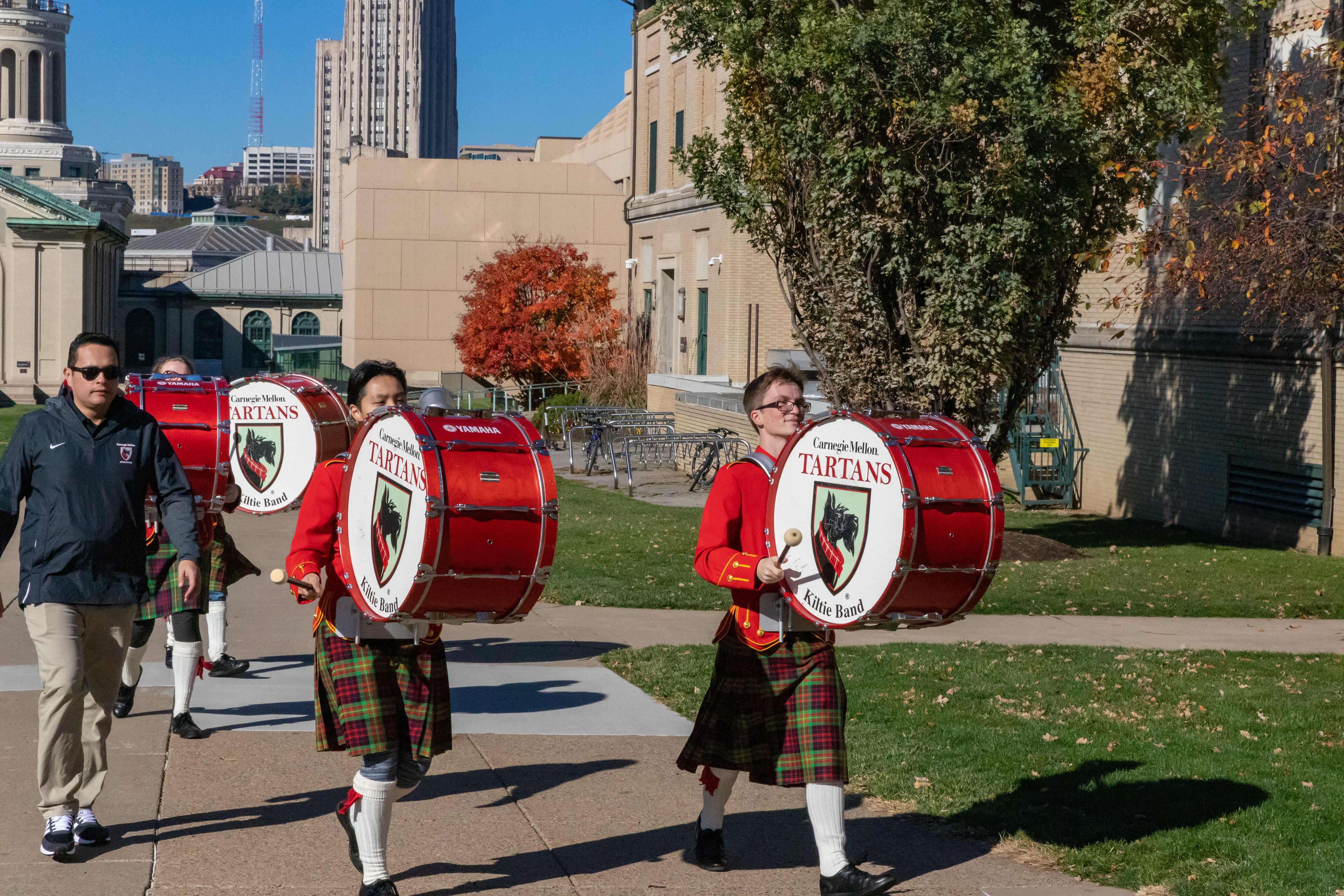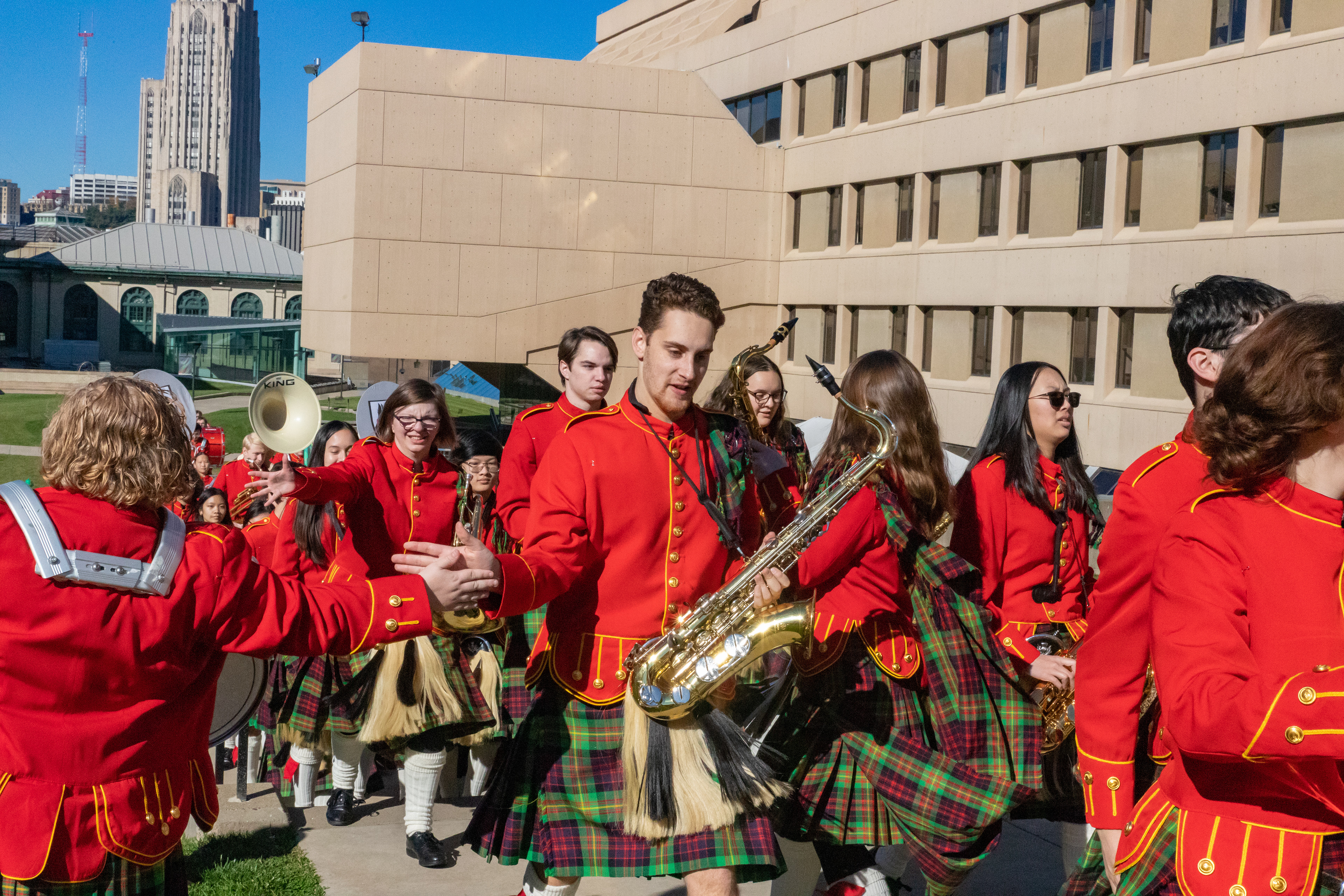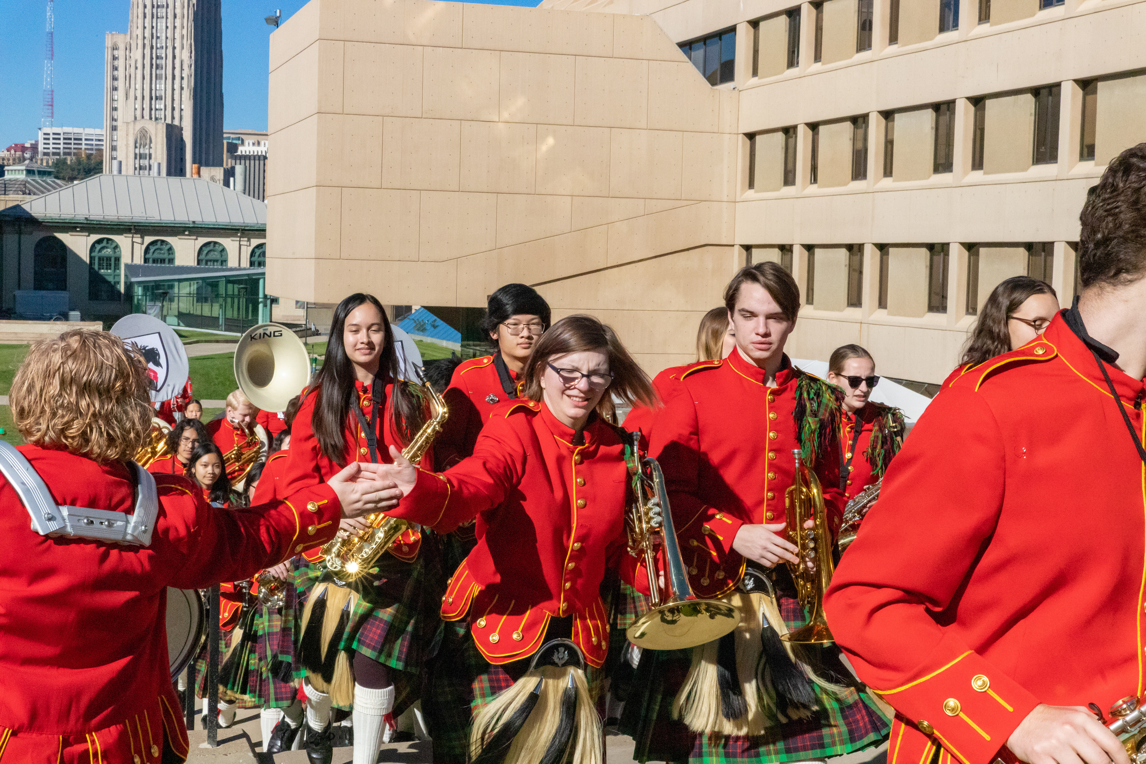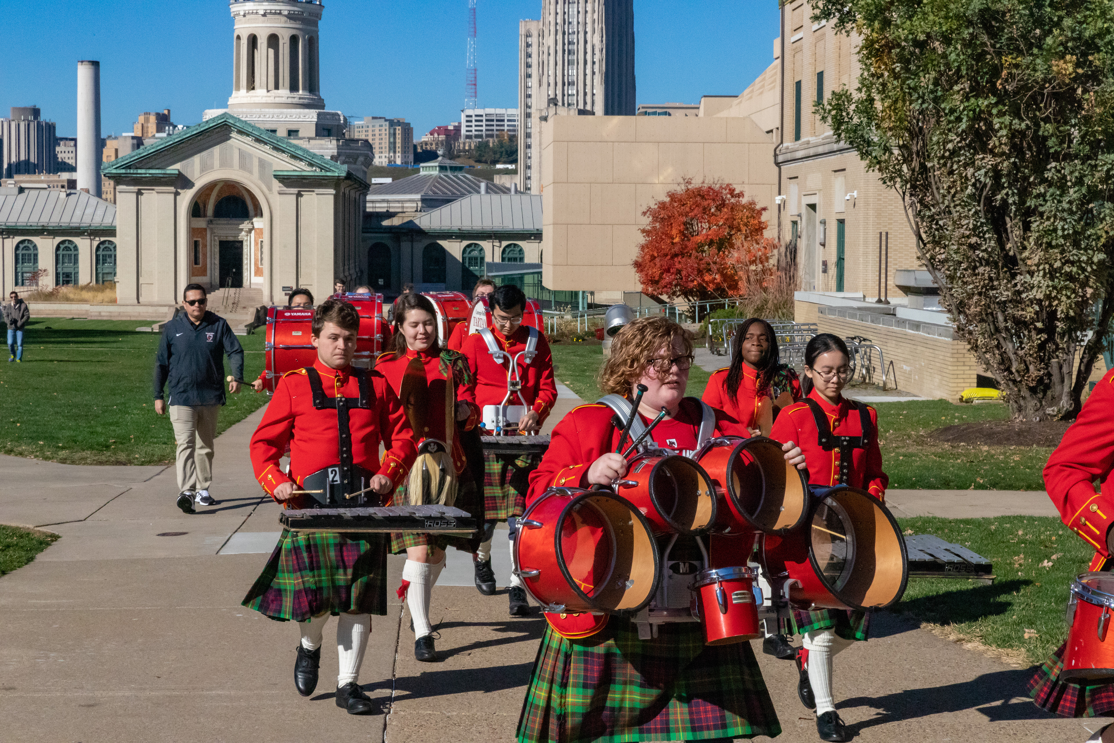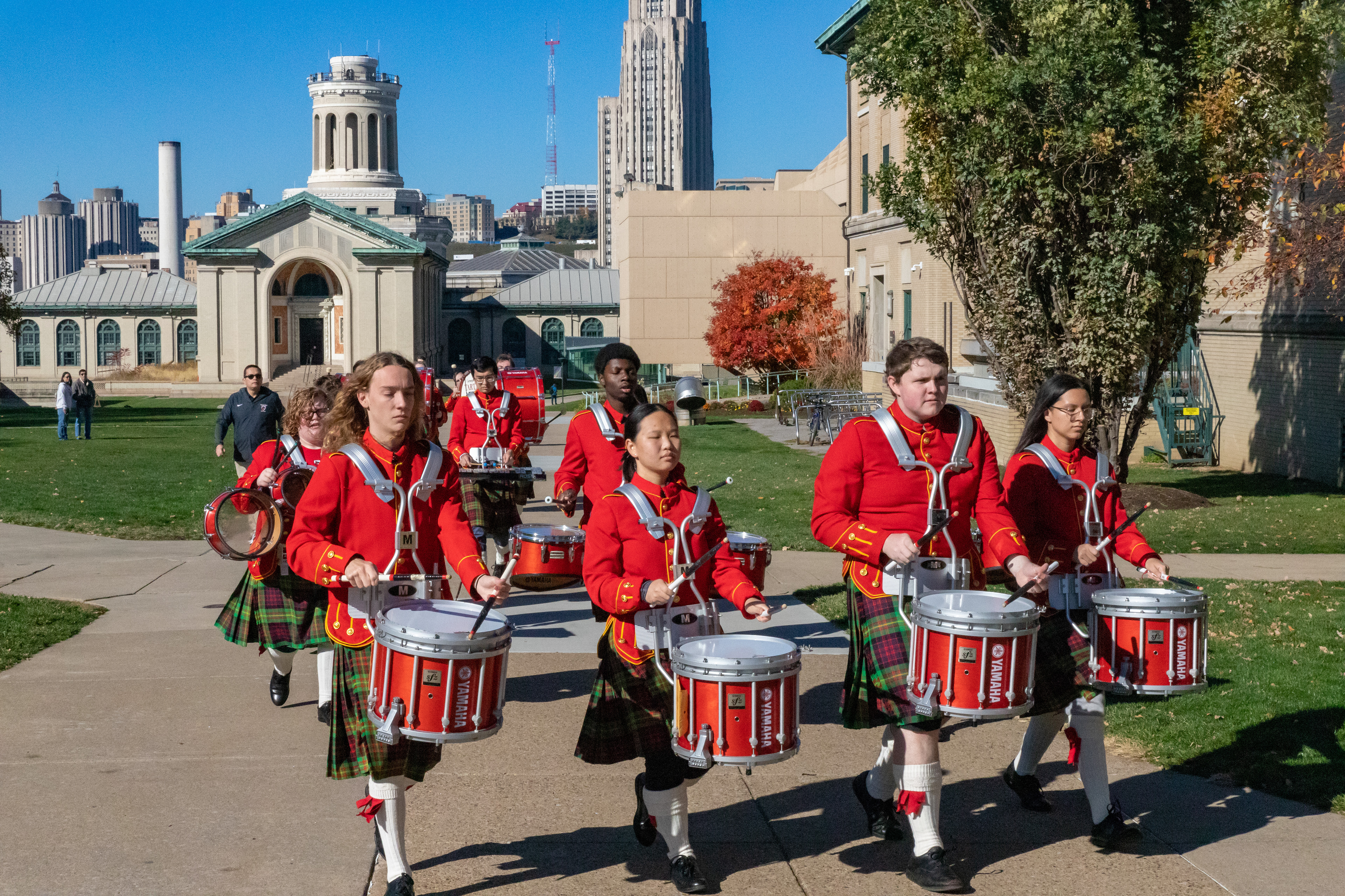The Kilties march through campus on their way to and from formal pictures and spread homecoming cheer.